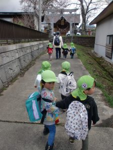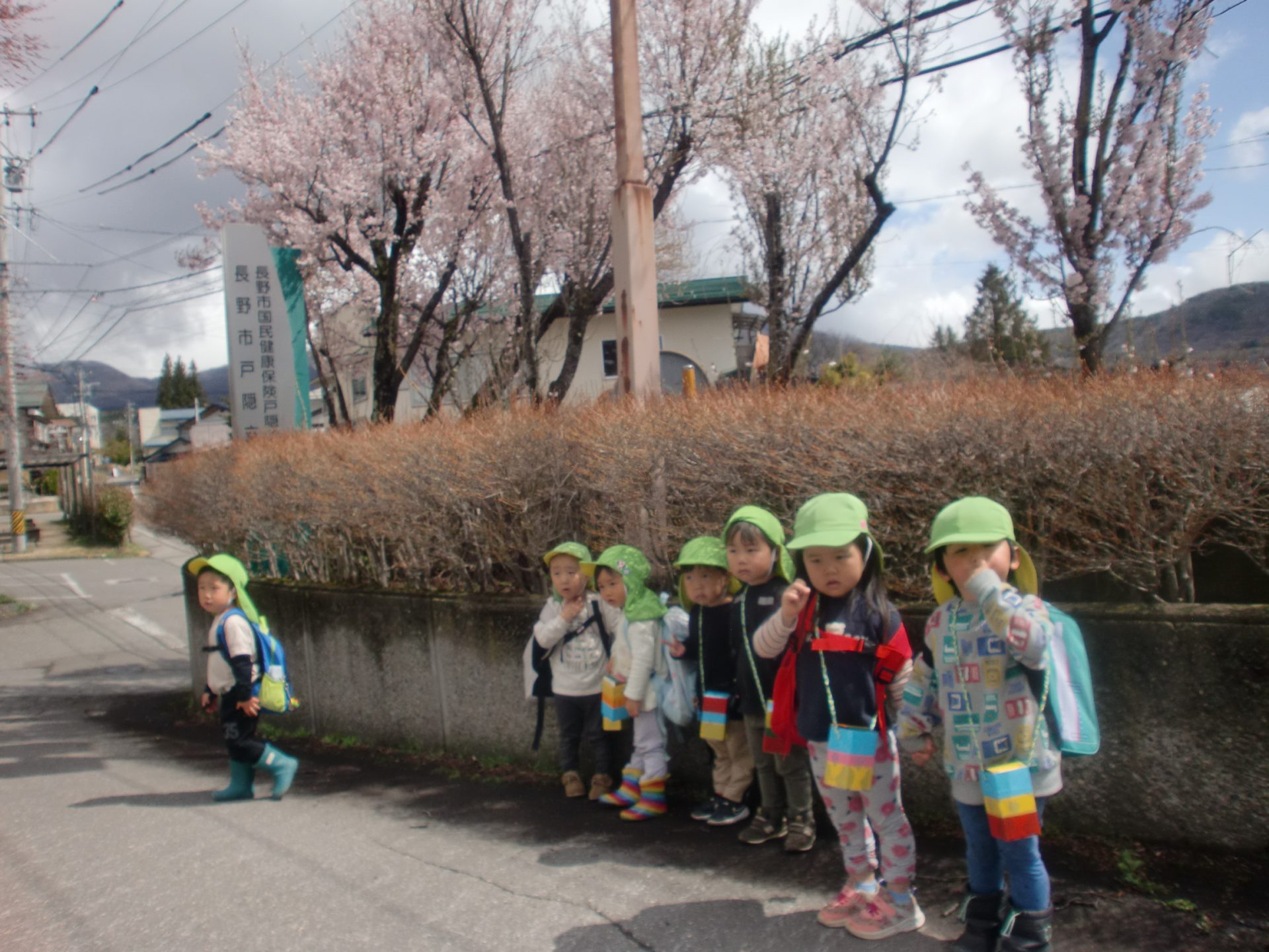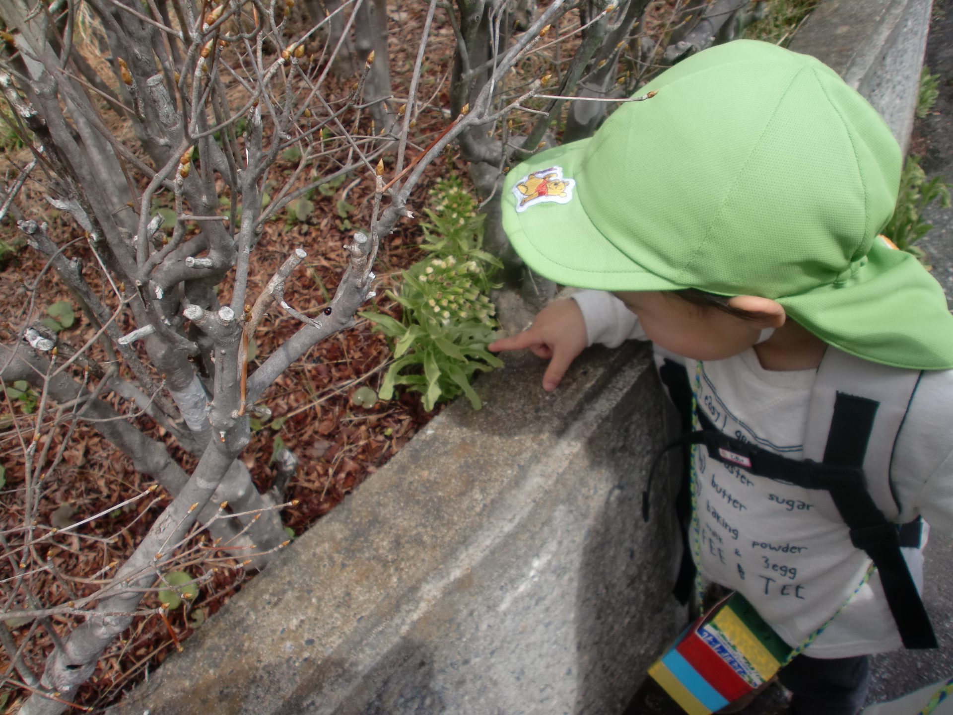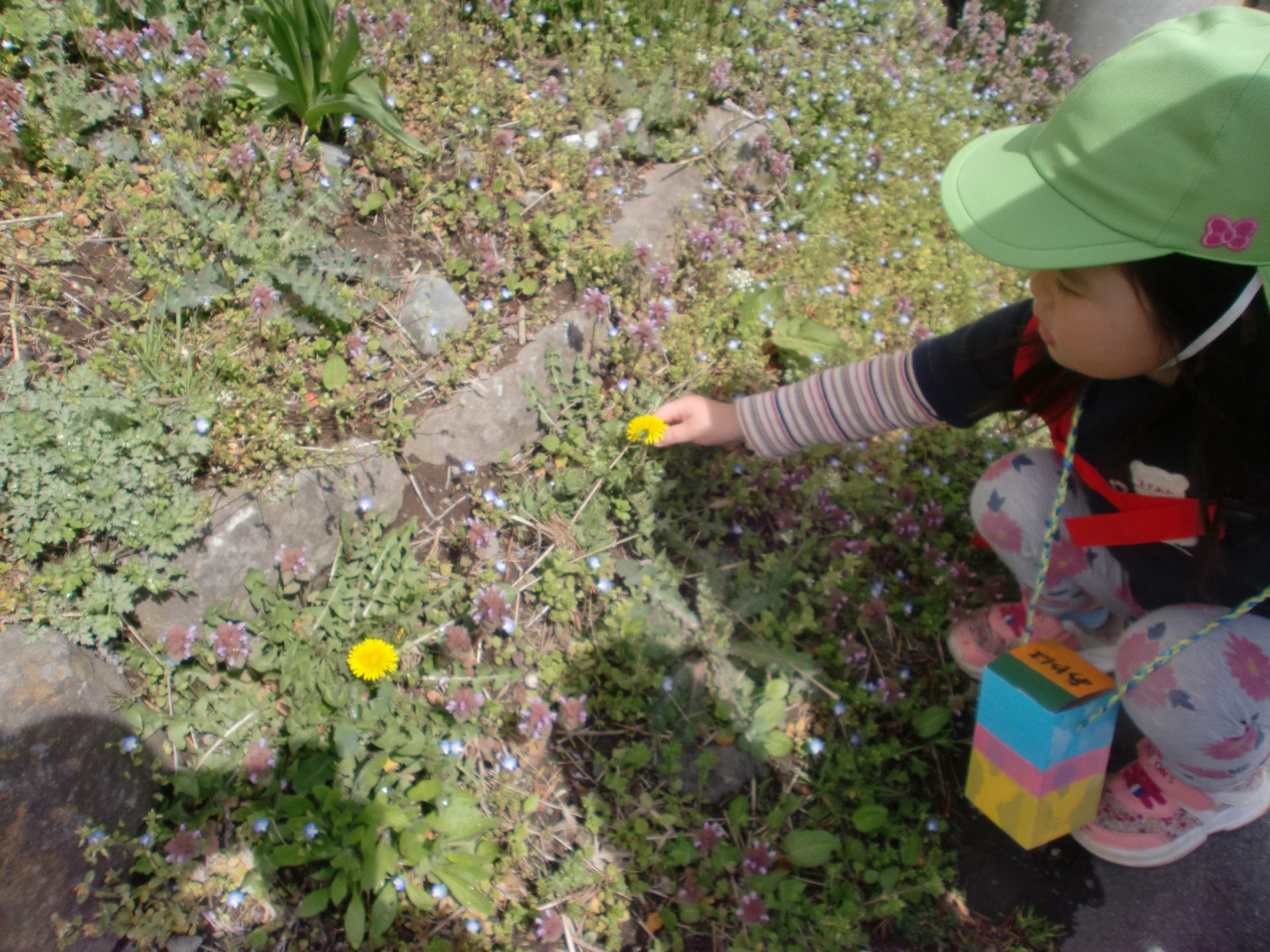 春の暖かい日差しを感じながら、のんびりゆっくり歩くことで、園周辺に咲く花や植物を見つけることが出来ました。また、今回は、“春にはどんなお花が咲くのかな?”と出発前に投げかけることで、興味や意欲が増し、地域にある特有のものにも興味をもち「なんだろう?」「不思議だね!」という気持ちを感じられるお散歩になりました。また同じ場所を通ったとき、違った発見を楽しめたらいいなと思います。
