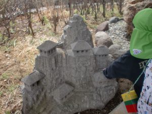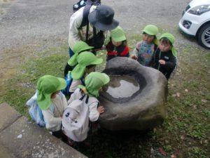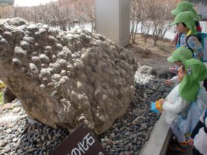 「これはなに?」「石に貝がいっぱいくっついてる!」「石のお家だね」地域にあるおもしろいものも見つけてきました。