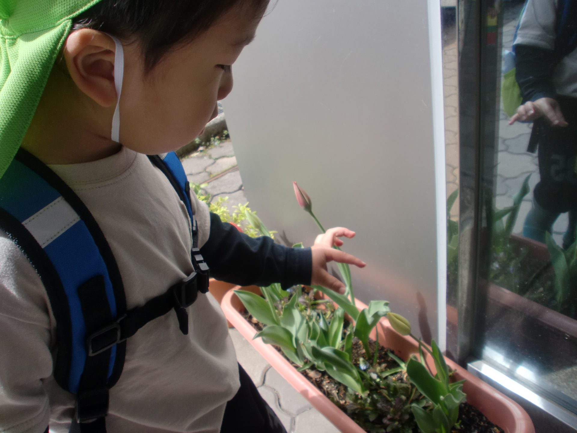 園外に出ると、たくさんのお花や植物に出会うことができました。保育士の言葉掛けで、とっても小さなお花に気がついたり、保育士と一緒にお花の名前を口にしたり、知っているお花も見たことのないお花も見たり触れたりすることで、興味がどんどん増していく姿がみられました。