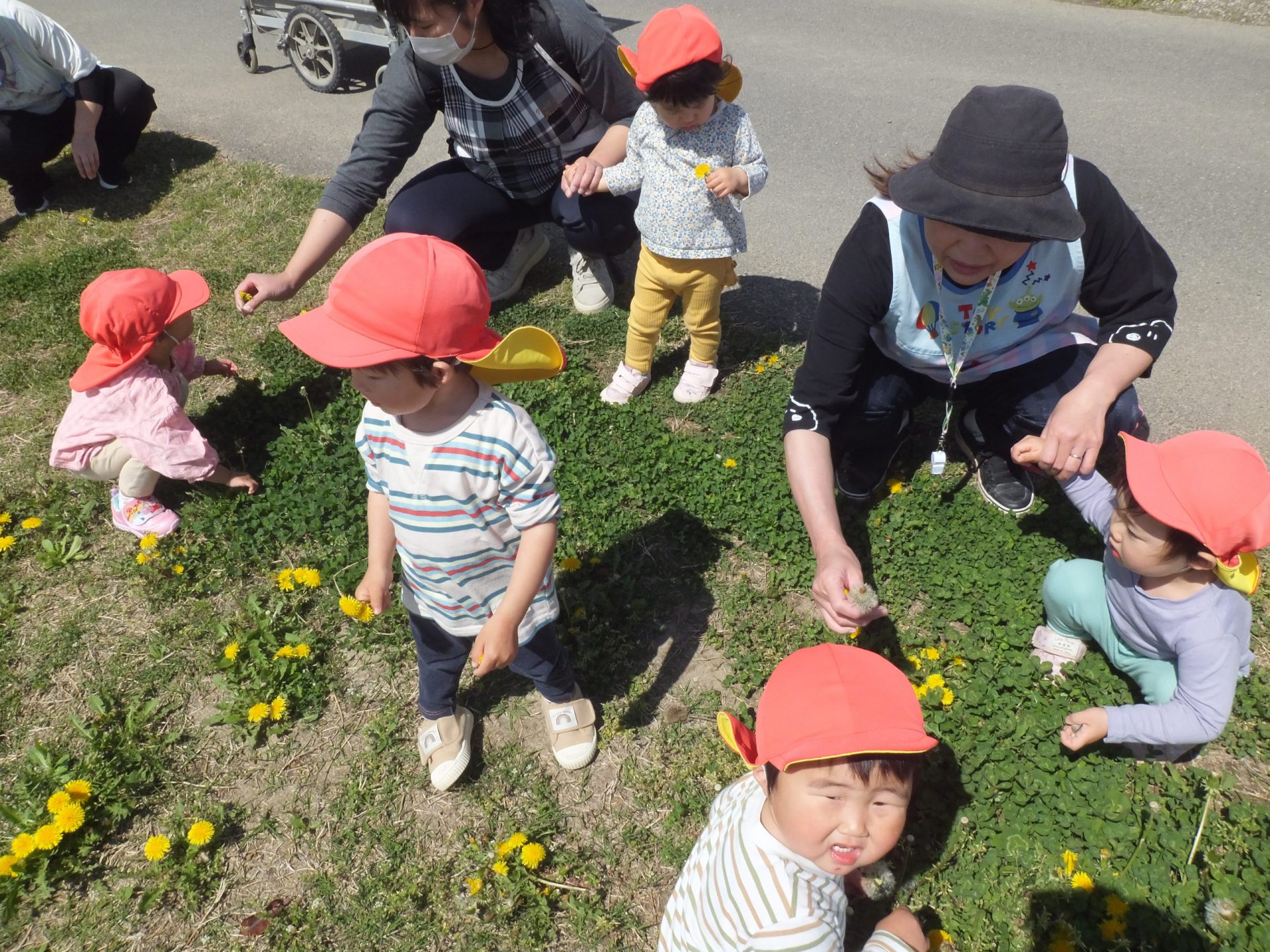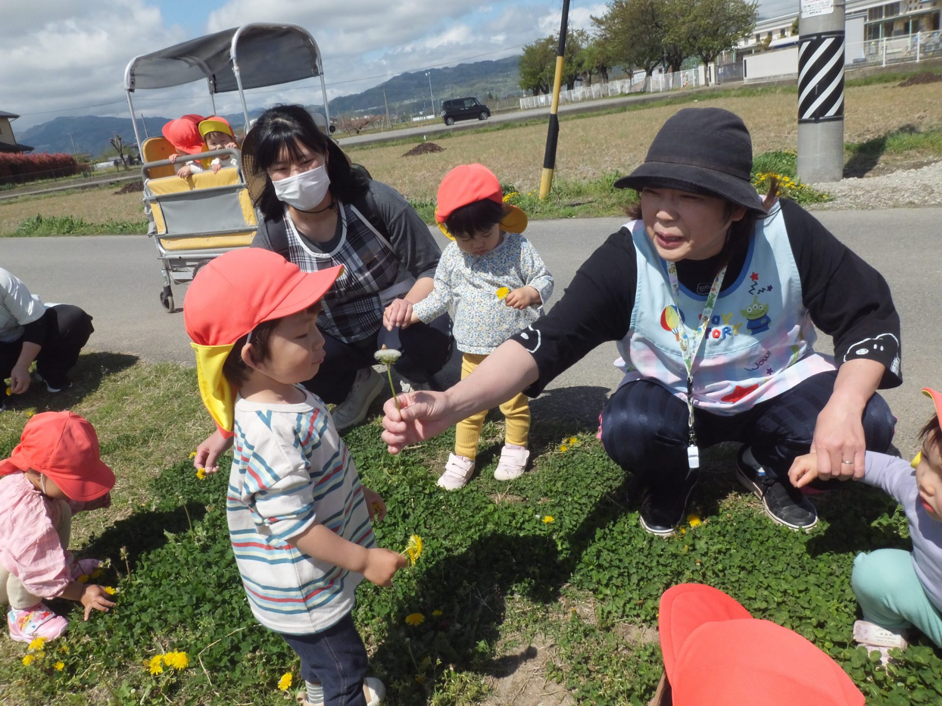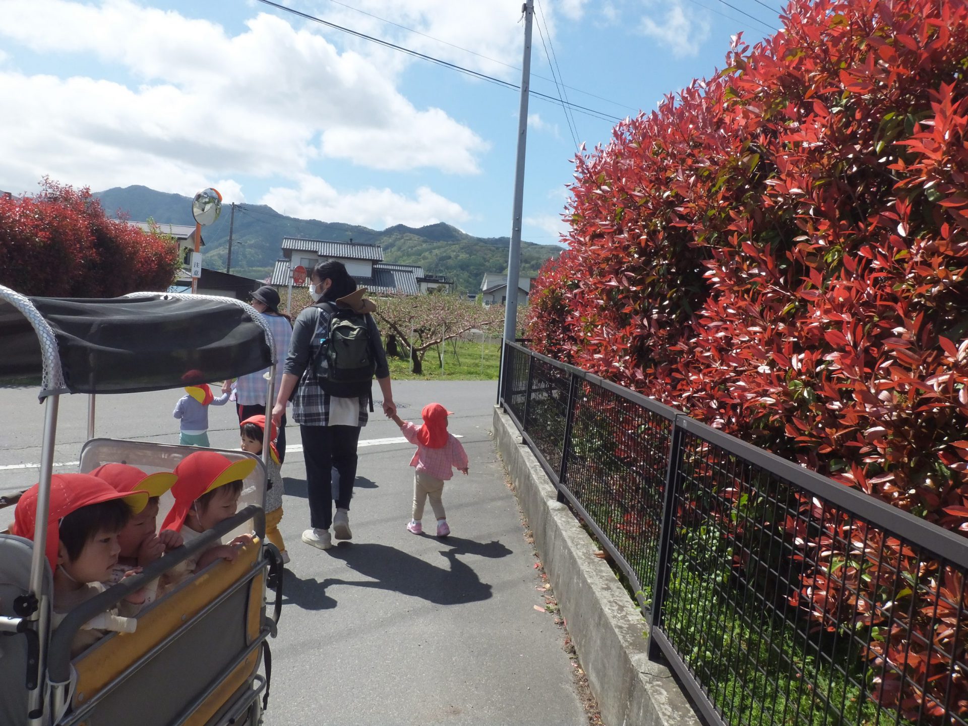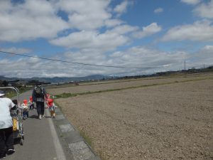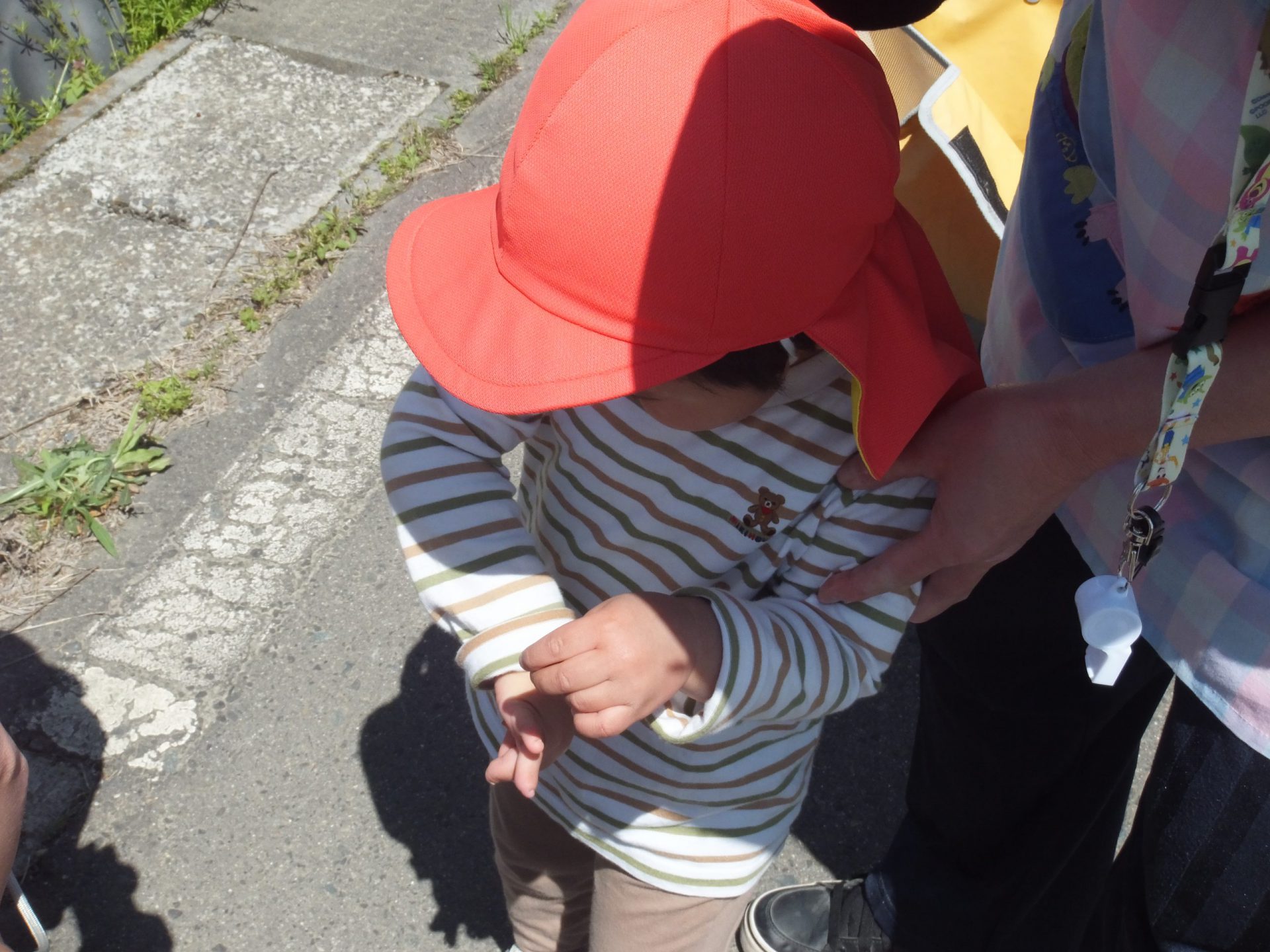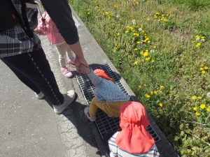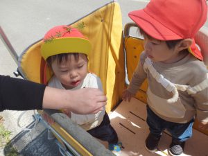 今日はとってもいいお天気。みんなで保育園の周辺をお散歩です。