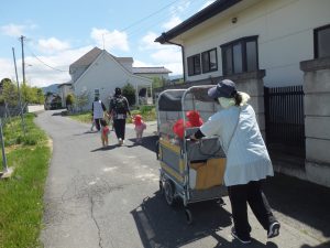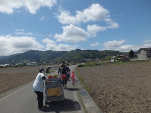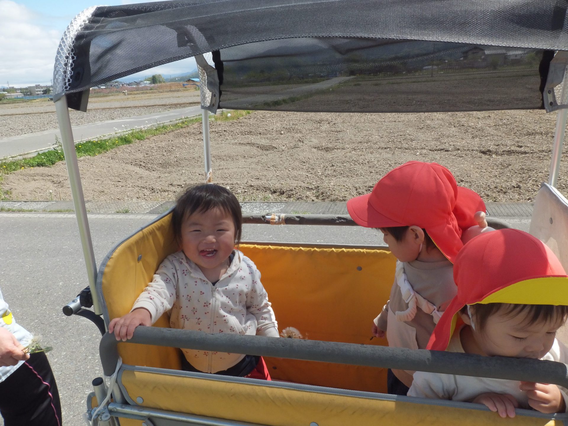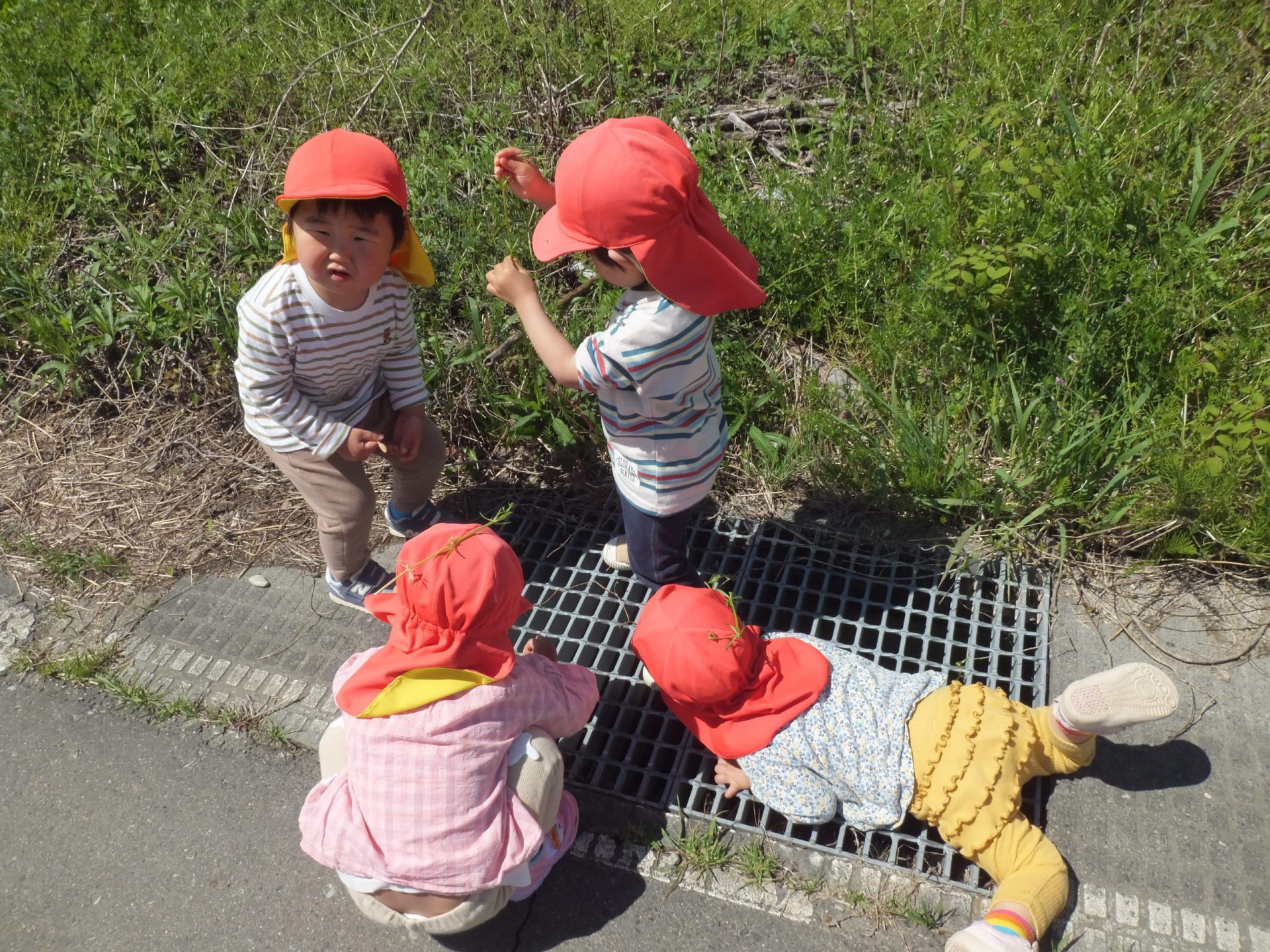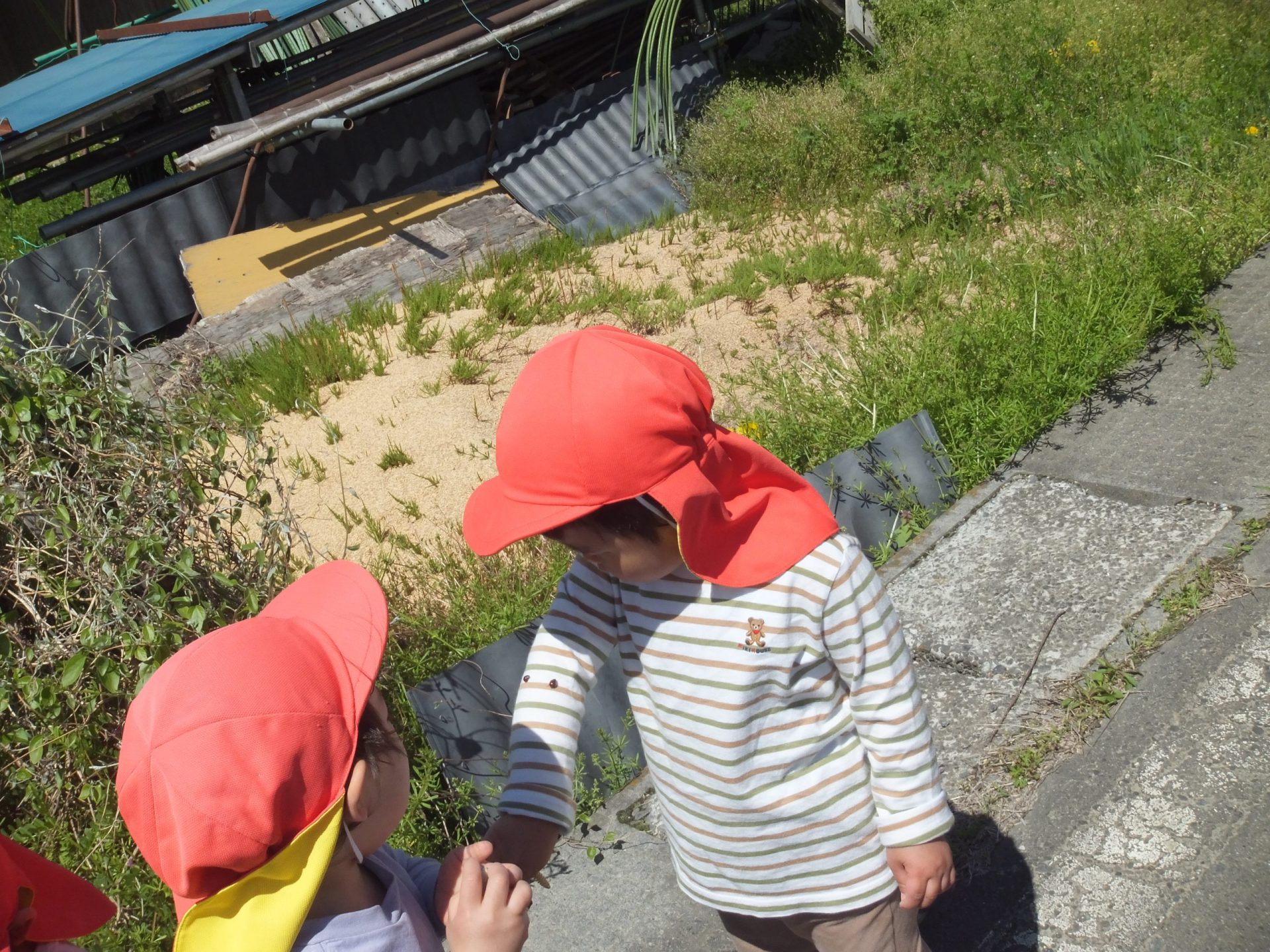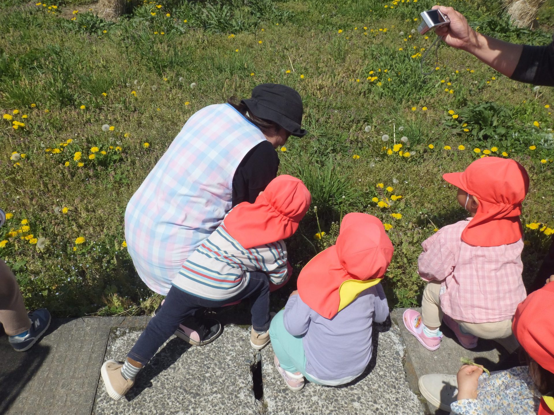 今日はとってもいいお天気。みんなで保育園の周辺をお散歩です。