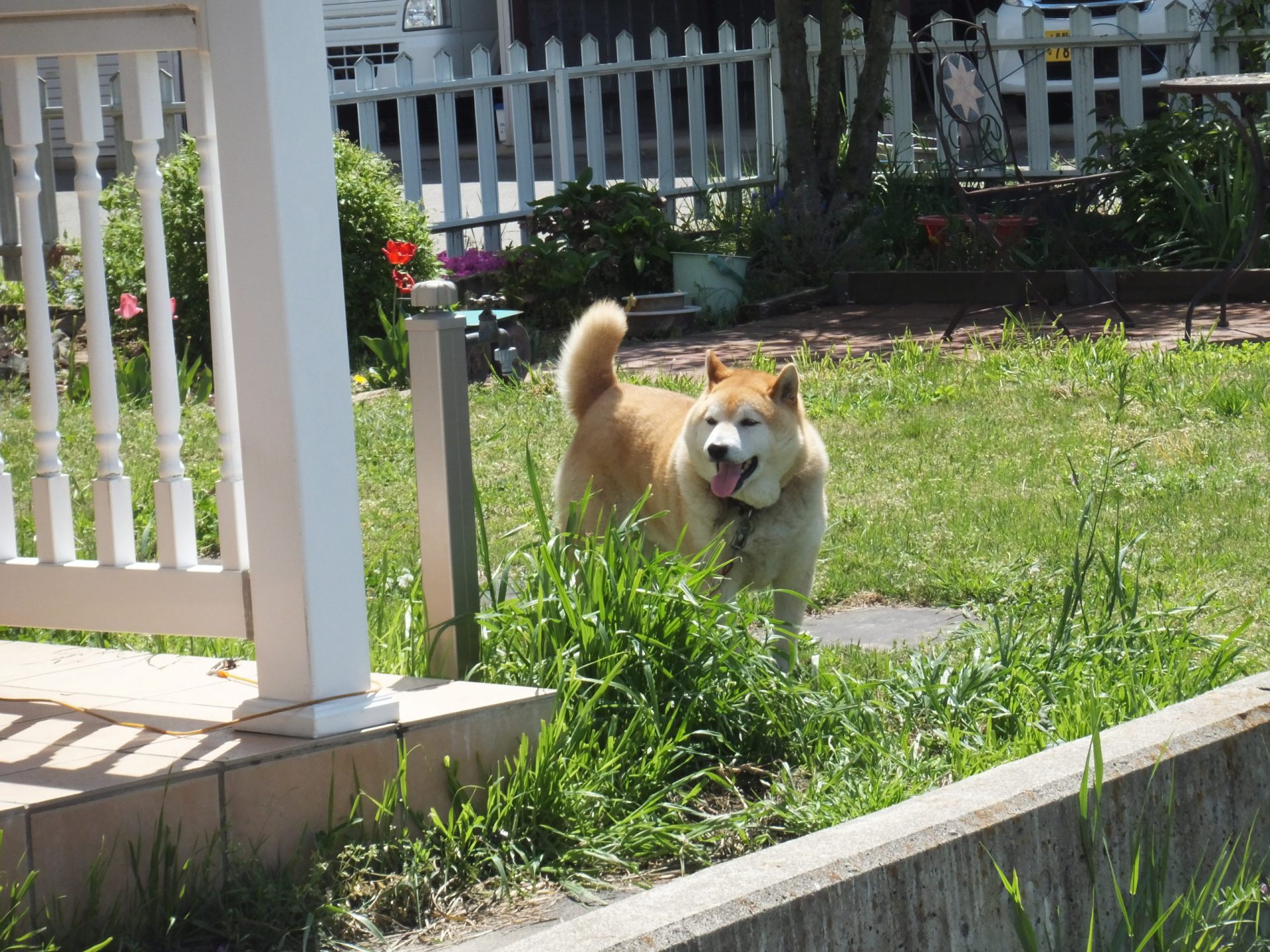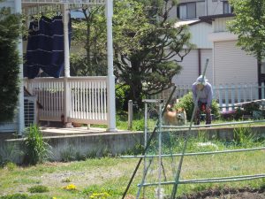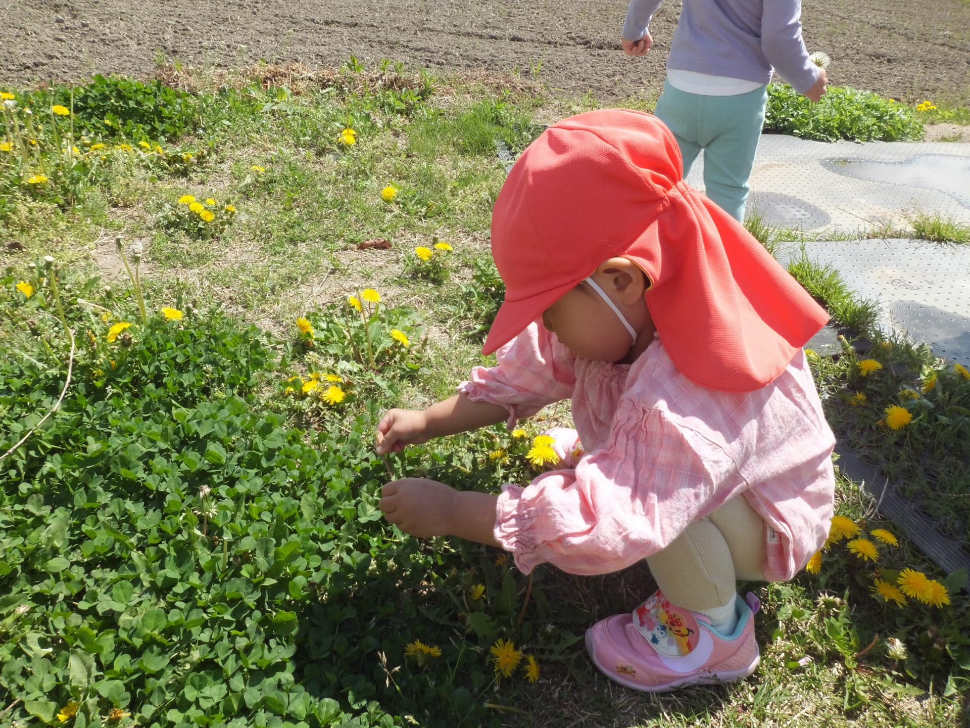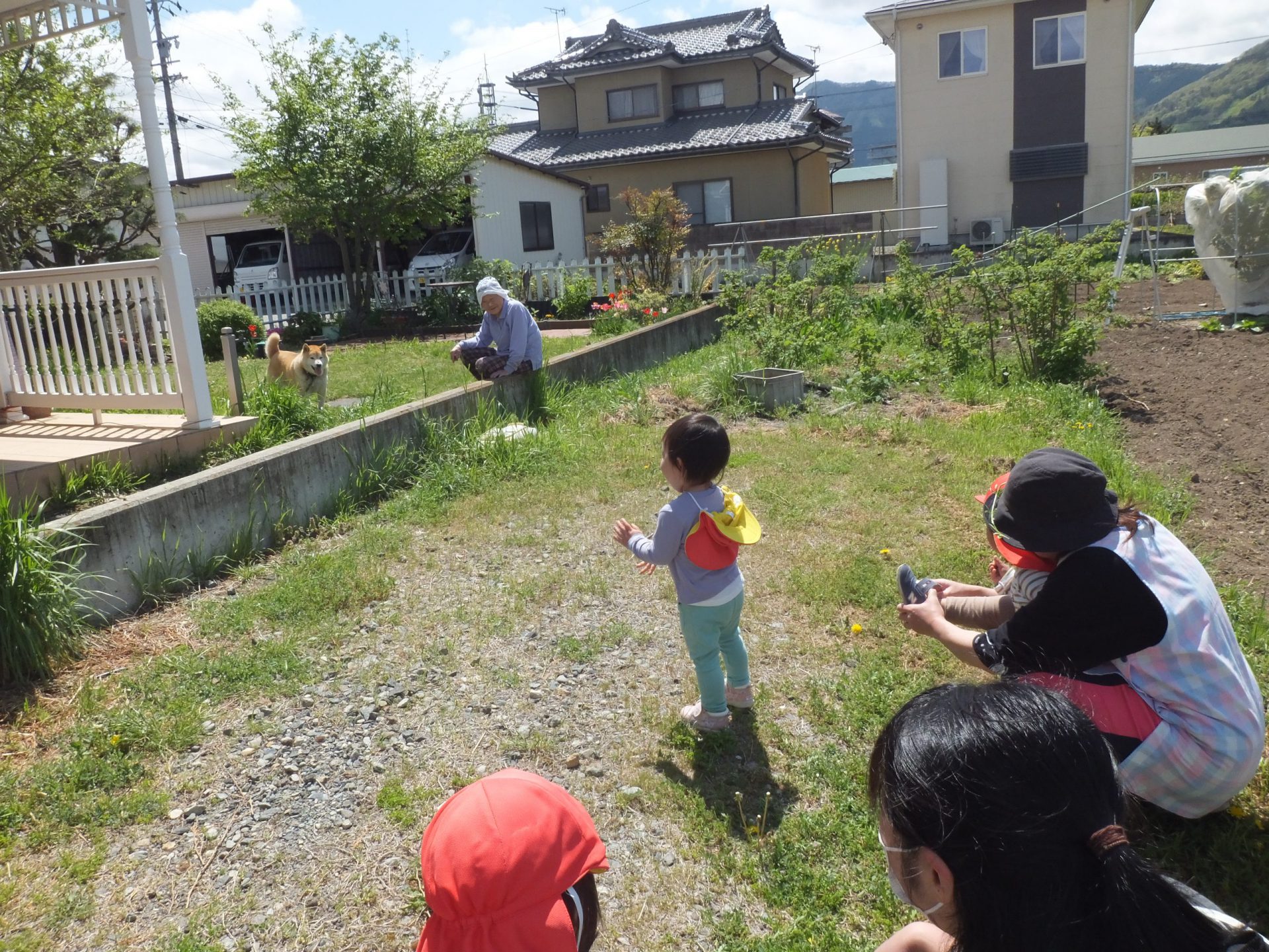 たくさんたんぽぽやてんとう虫で遊んだ後は、大好きな犬のむぎちゃんに会いに行きます。