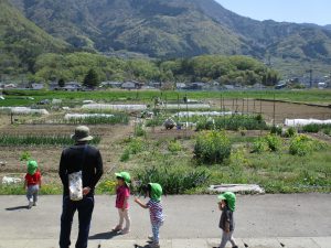 快晴の青空の下歩く子ども達を見守る雄大な山々。