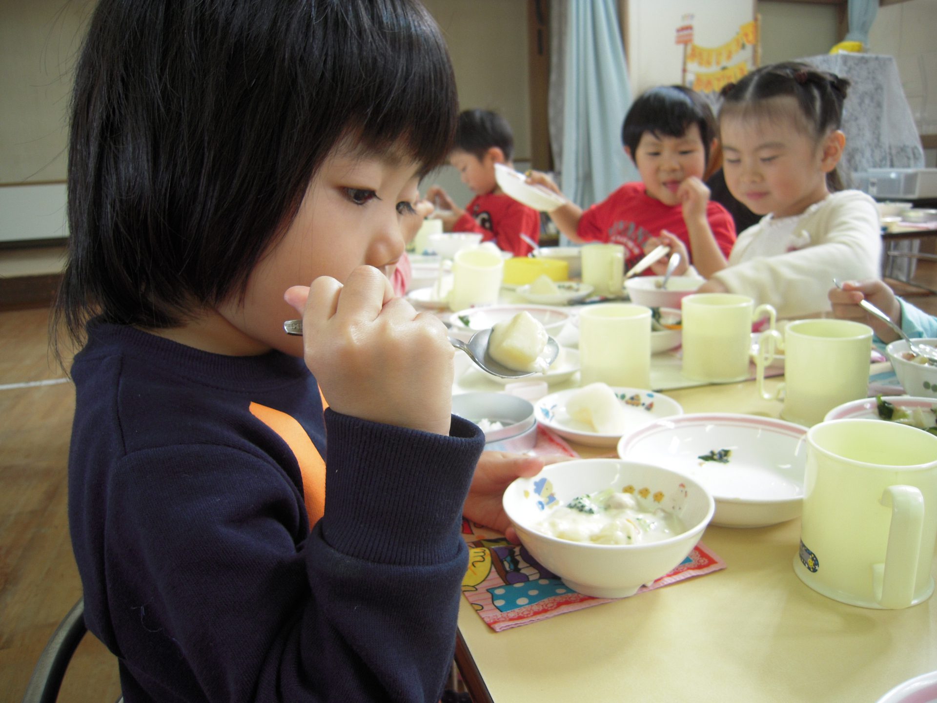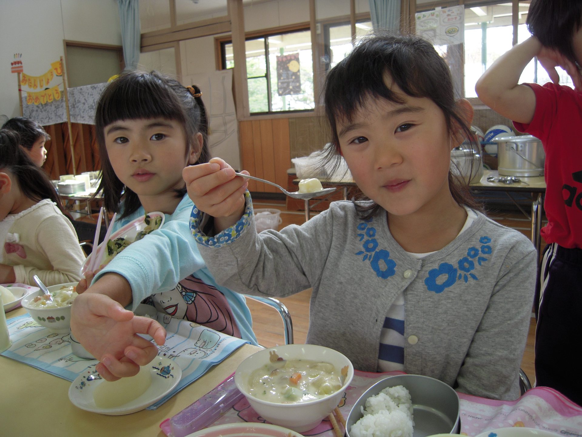 保育園のシチューはルウを使わずに、牛乳とスキムミルクでカルシウムたっぷり!米粉でとろみをつけています。