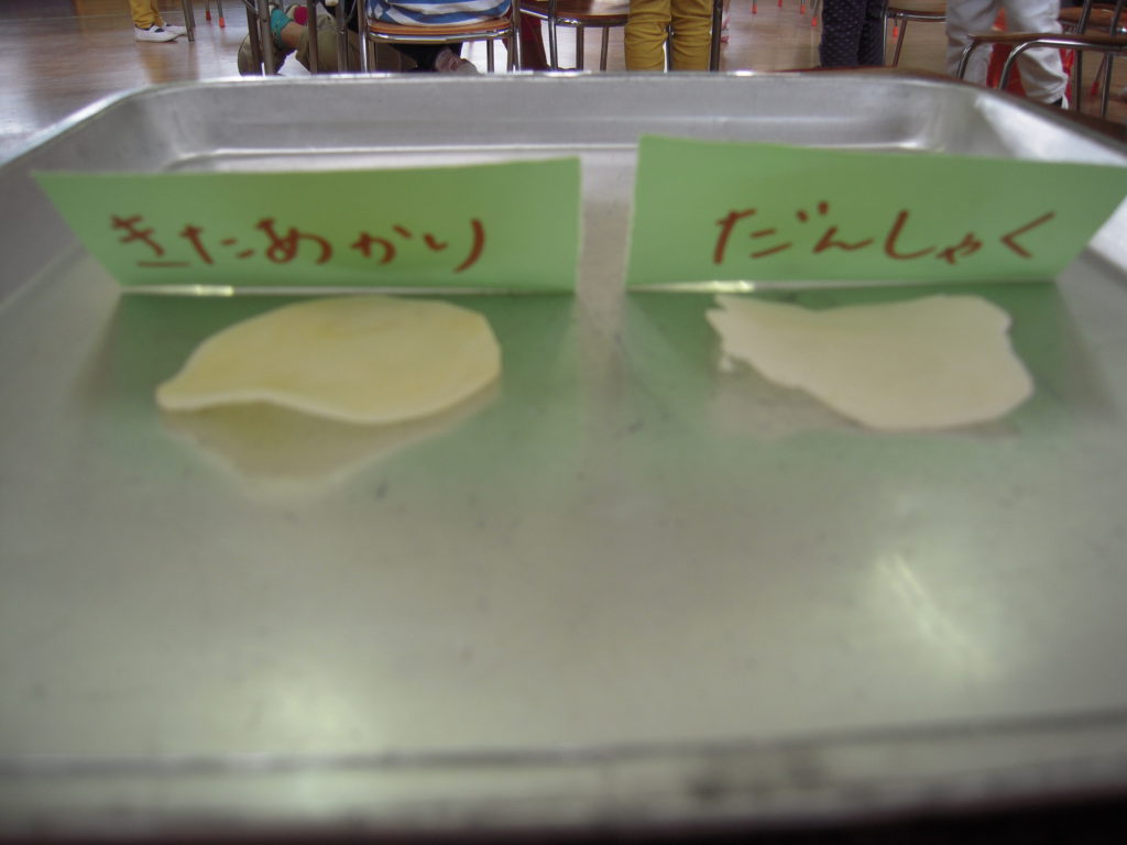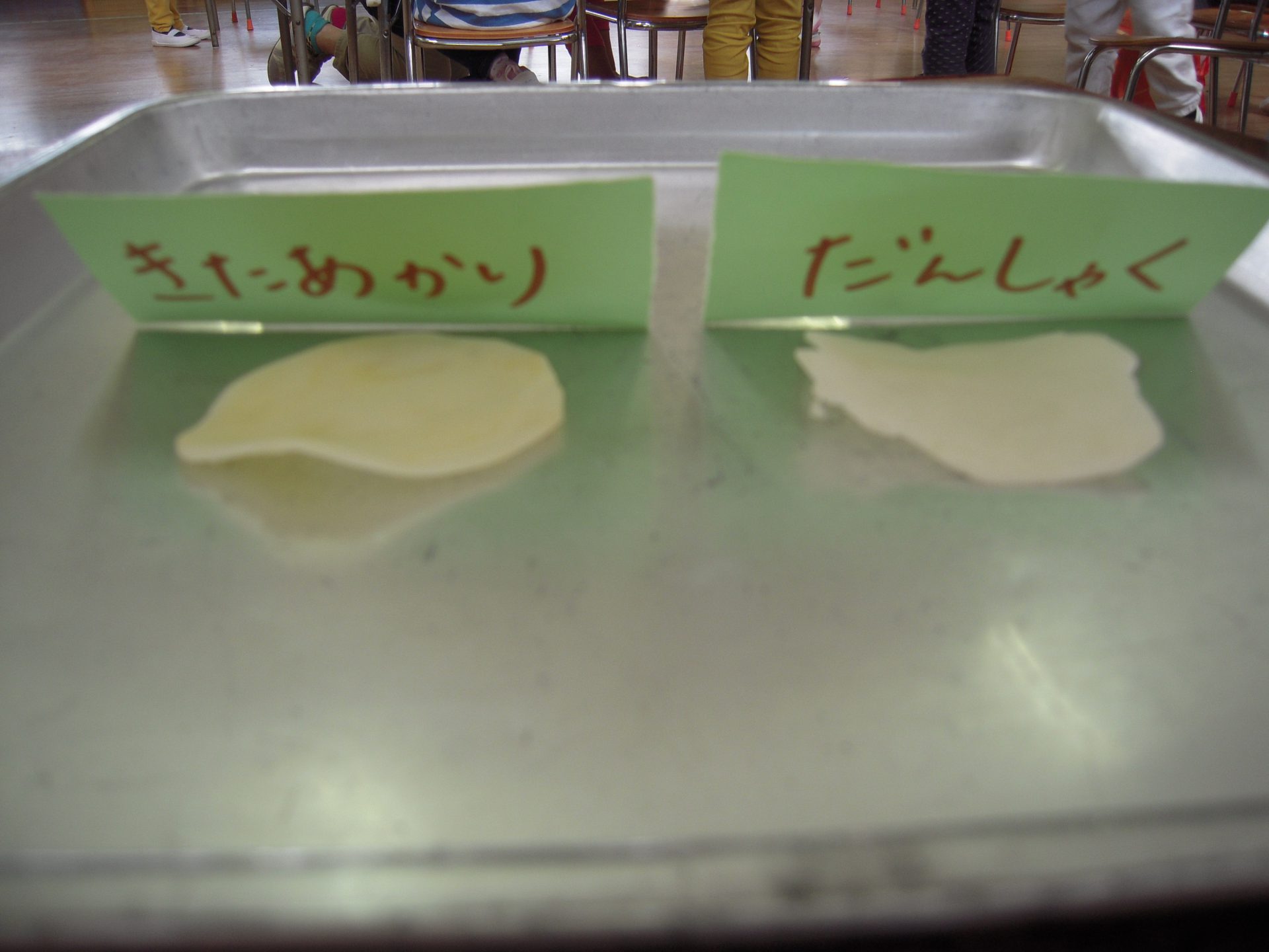 すると先生が、給食室から2種類のじゃが芋を切ったものを持ってきてくれました。