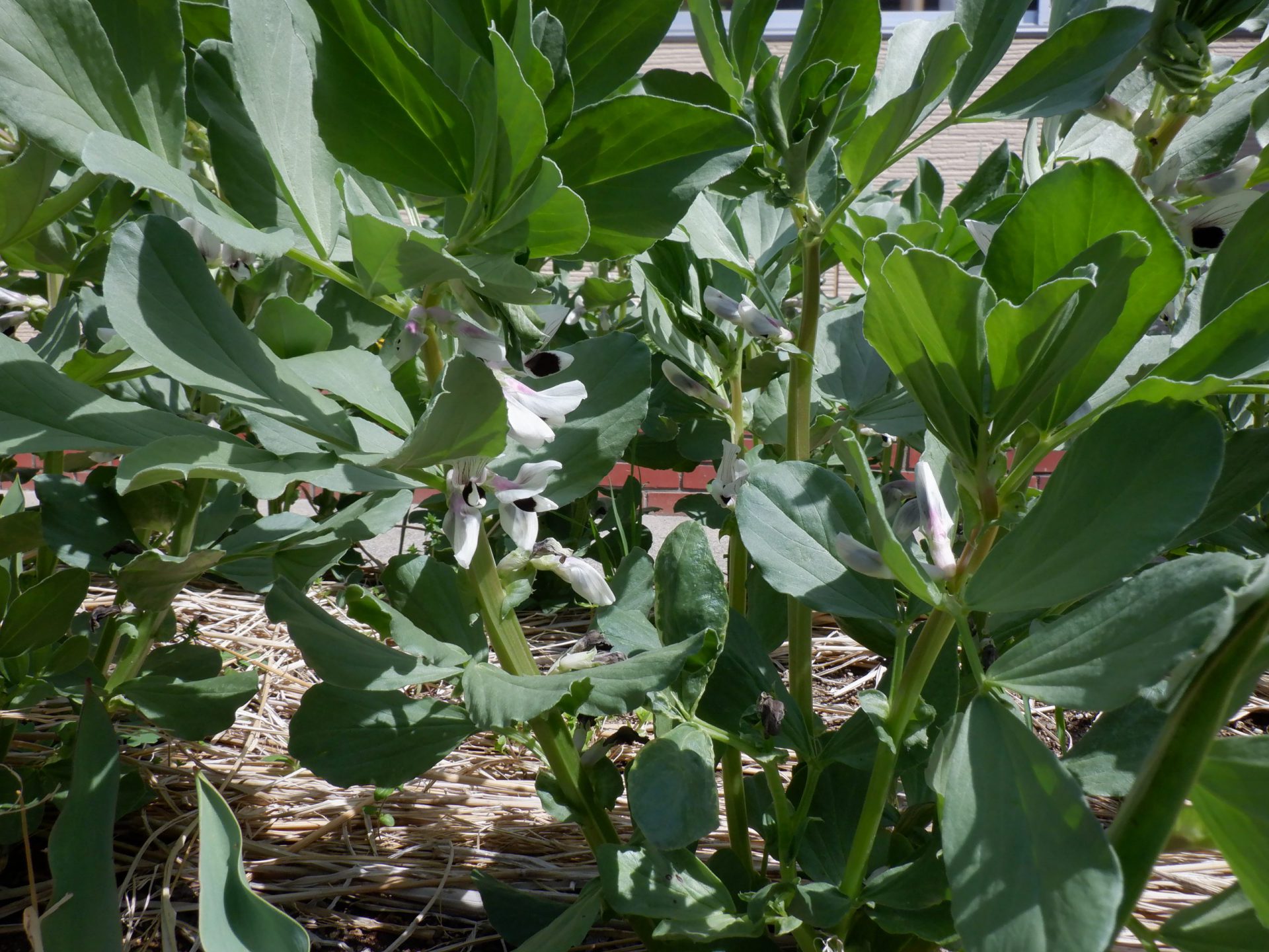 秋に種をまいた空豆が花壇ですくすく育って、花をつけました。