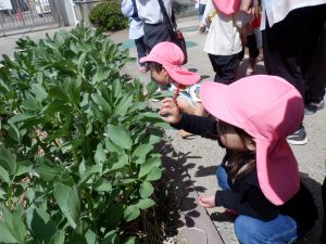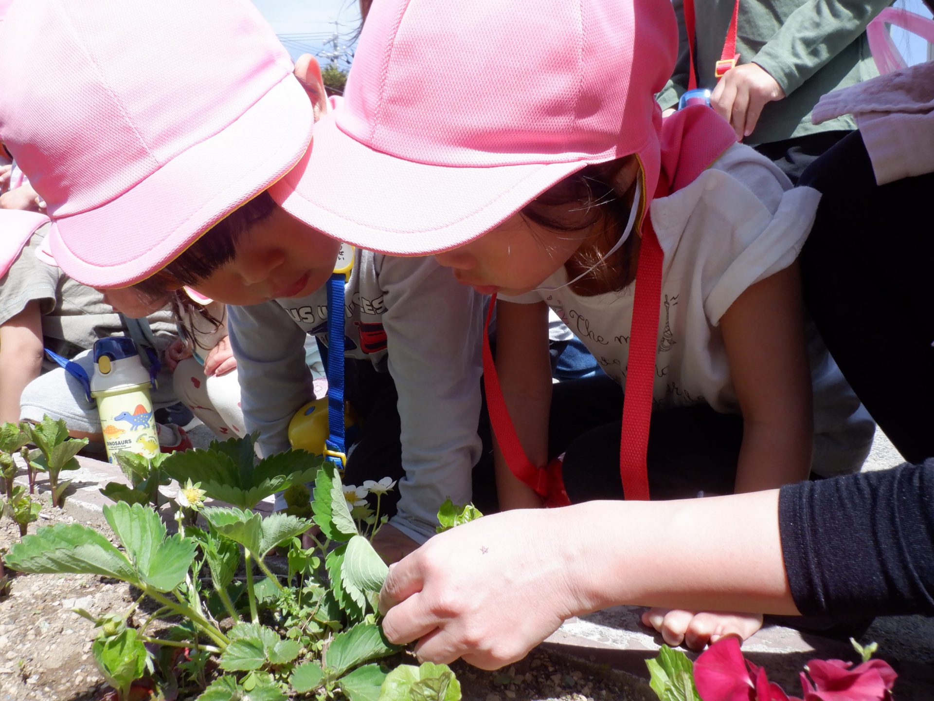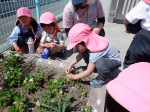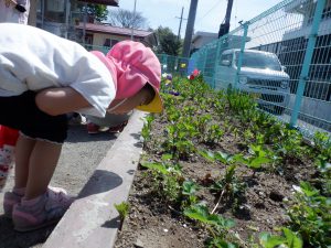 ・新年度が始まり、一月が過ぎようとしています。新しい環境に少しずつ慣れ、笑顔が増えてきている3歳児の子ども達。保育士や友達と一緒に空豆やイチゴの変化や成長に気づいて興味を広げていけるように立ち止まって観察できるようにしました。保育園での栽培物の成長を友達と一緒に楽しめるようにしたいと思います。
