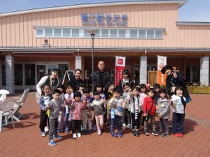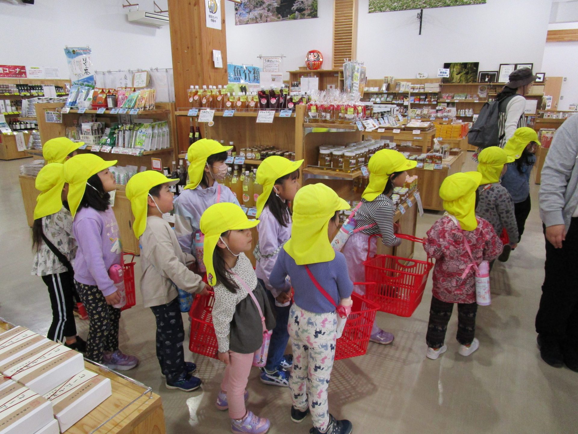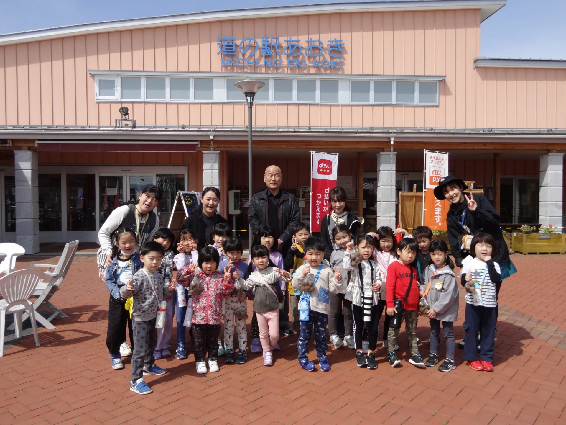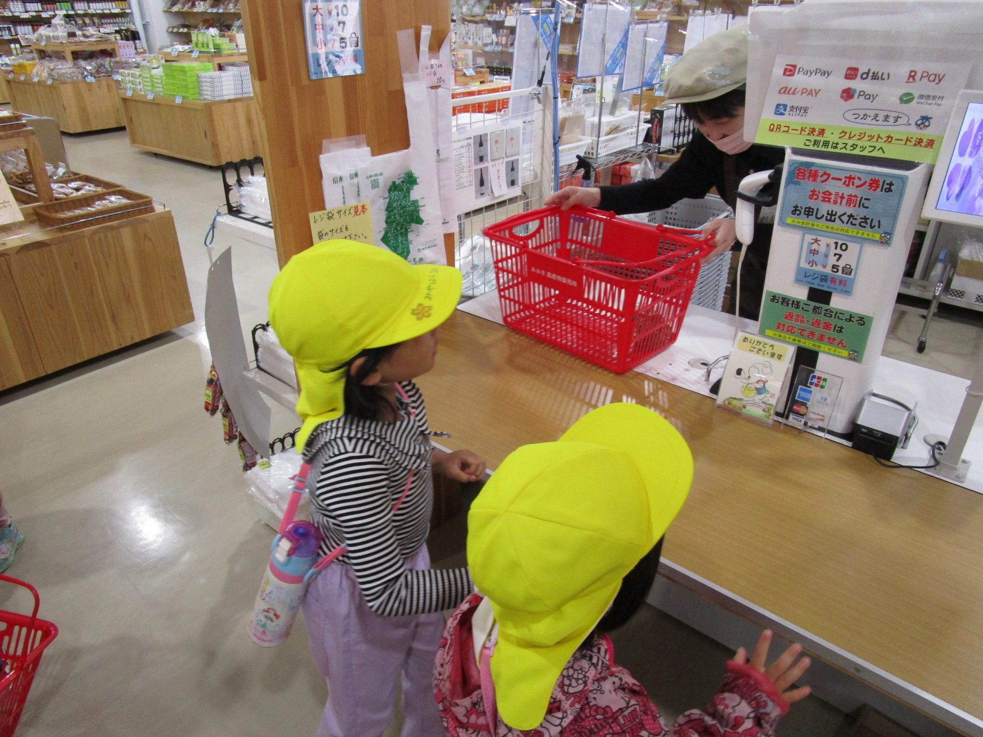 まずは、保育園の近くにある「道の駅あおき」へ種芋を買いに行きます。かごを持ち、レジを通るお買い物体験もすることができました。