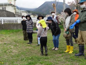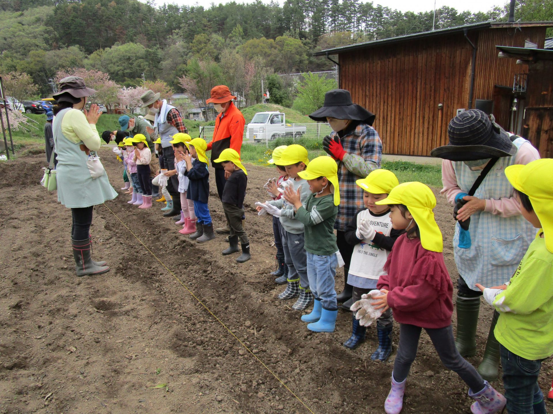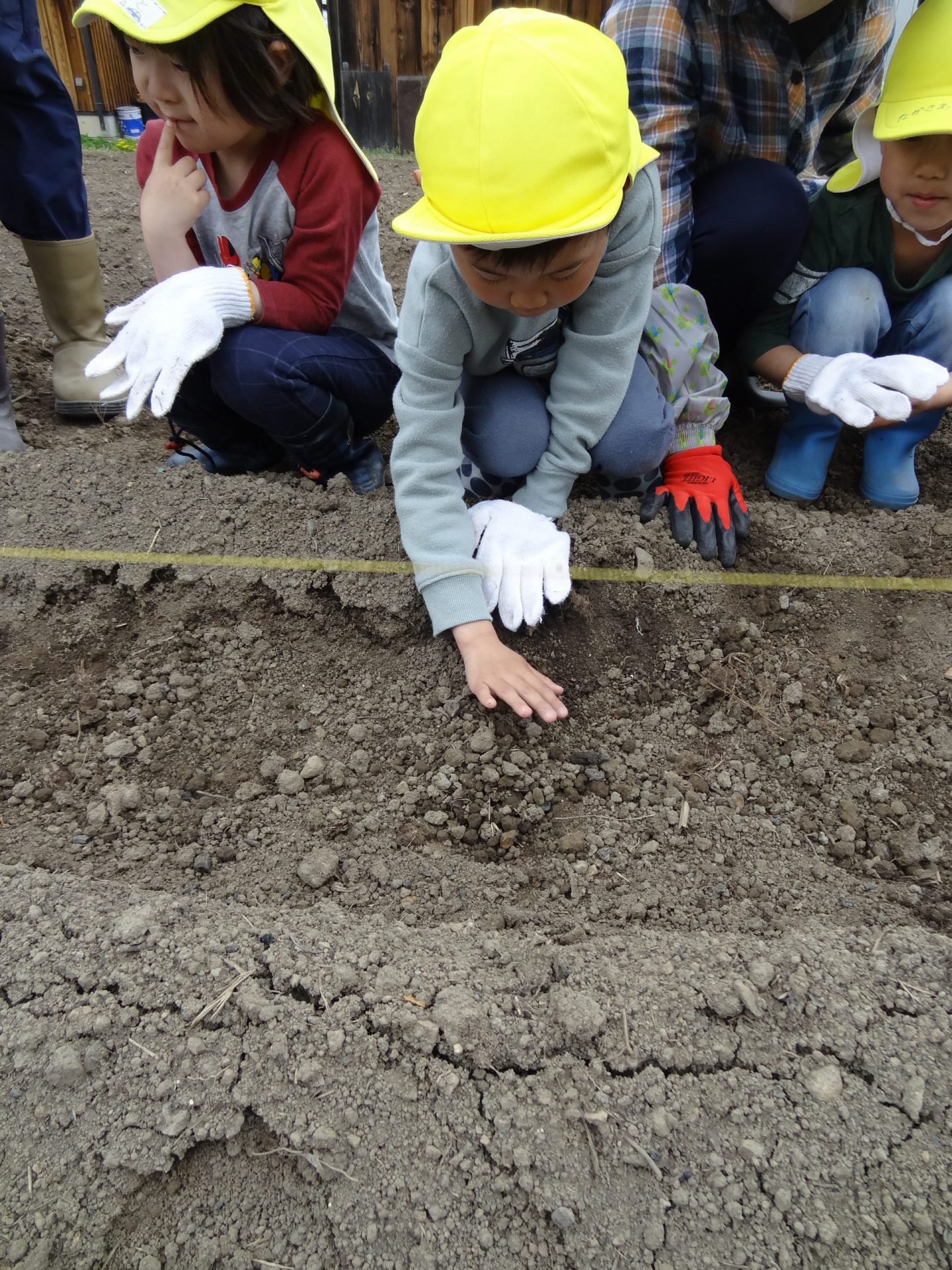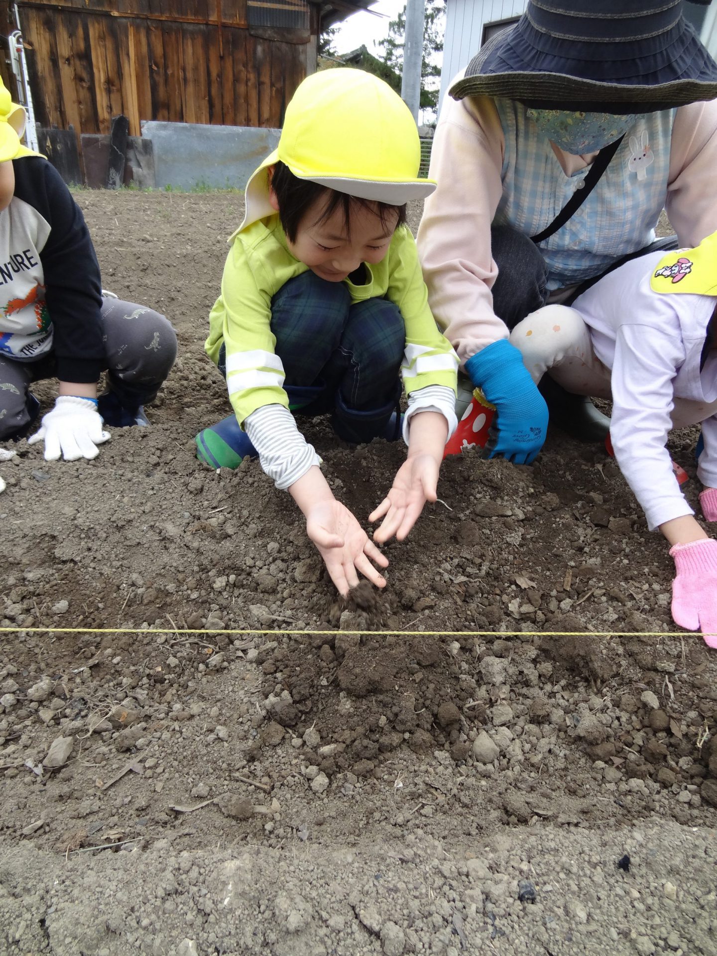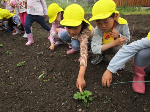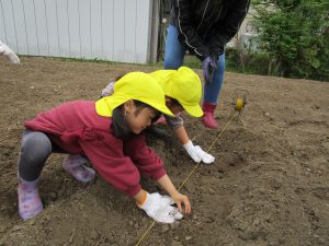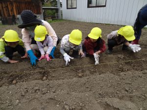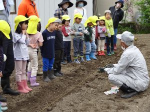 保育園の畑活動をサポートして下さっている地域の方、小林さんに植え方を教えて頂きました。