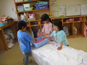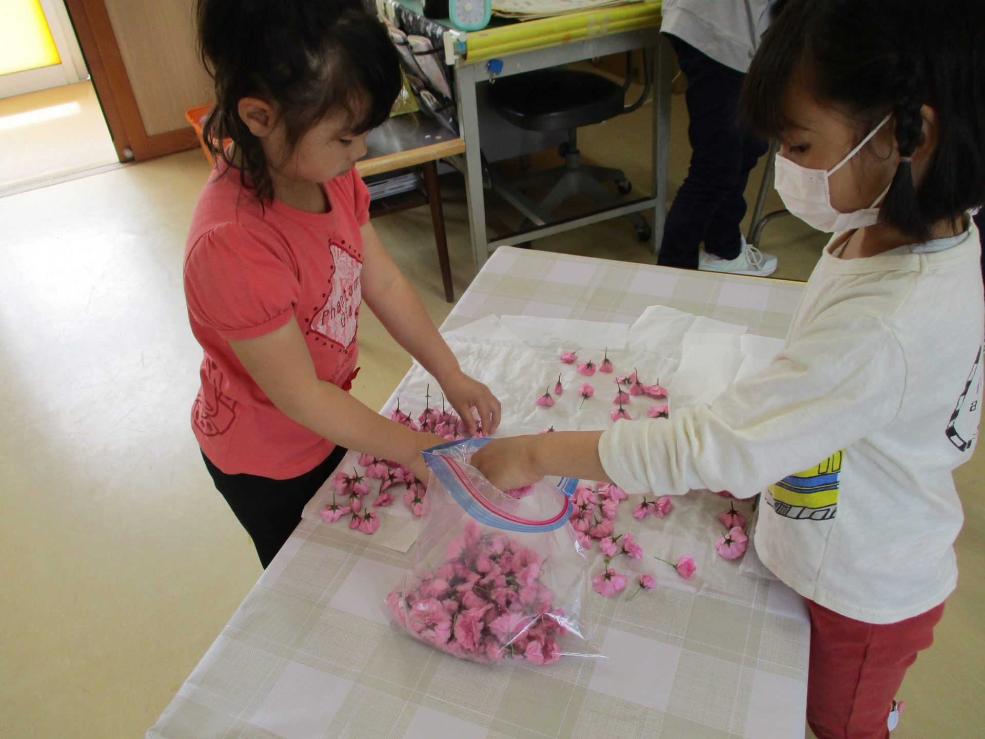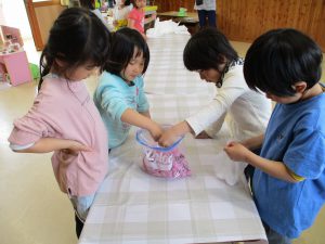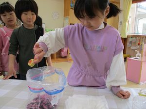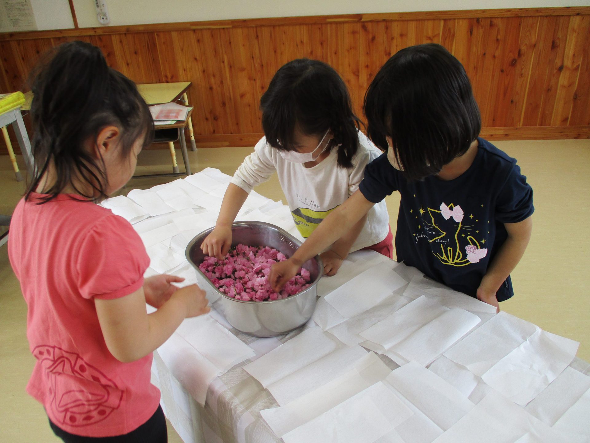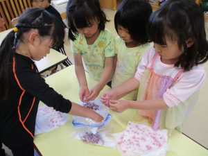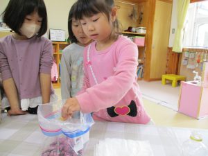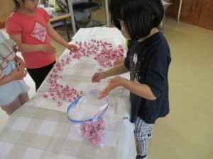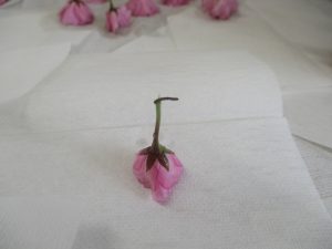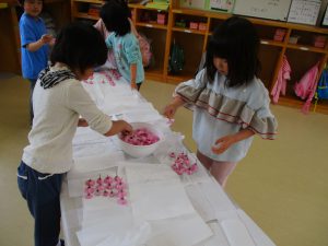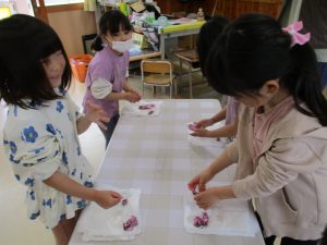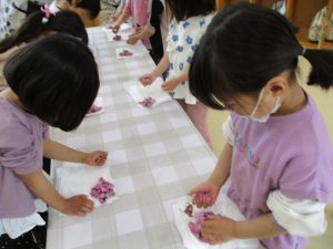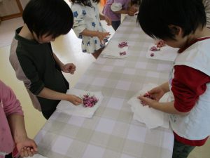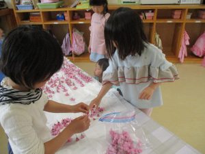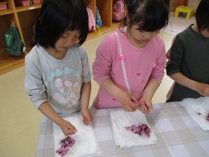 ・昨年度の年長が作った桜の塩漬け。子供たちに桜の話をすると「飲んでみたい」と、今年も作ってみようとなった。昨年度は見ているだけだったが、今年は自分達が作れると張り切っているので、その意欲を大切に色々経験してほしいと考えている。