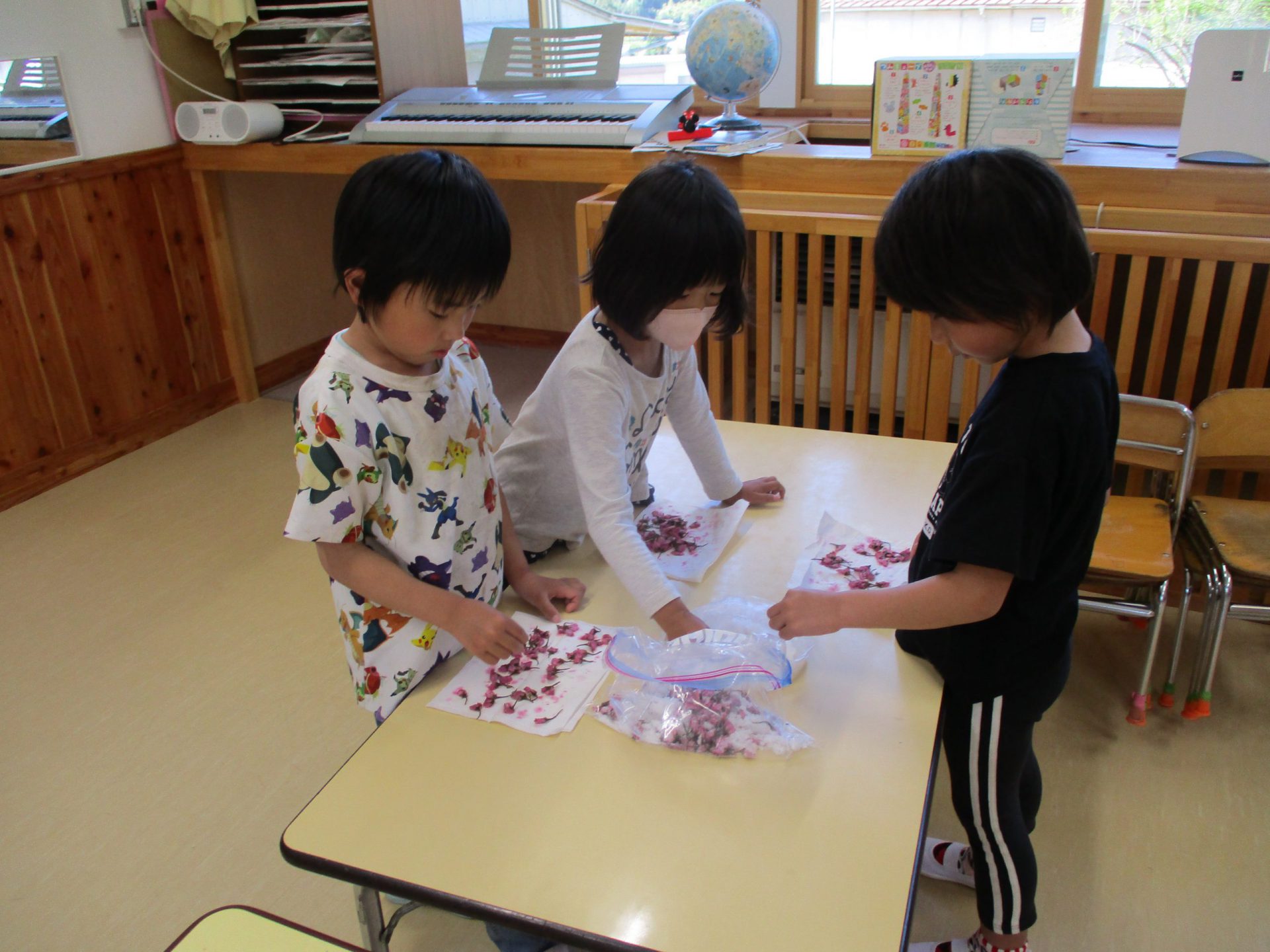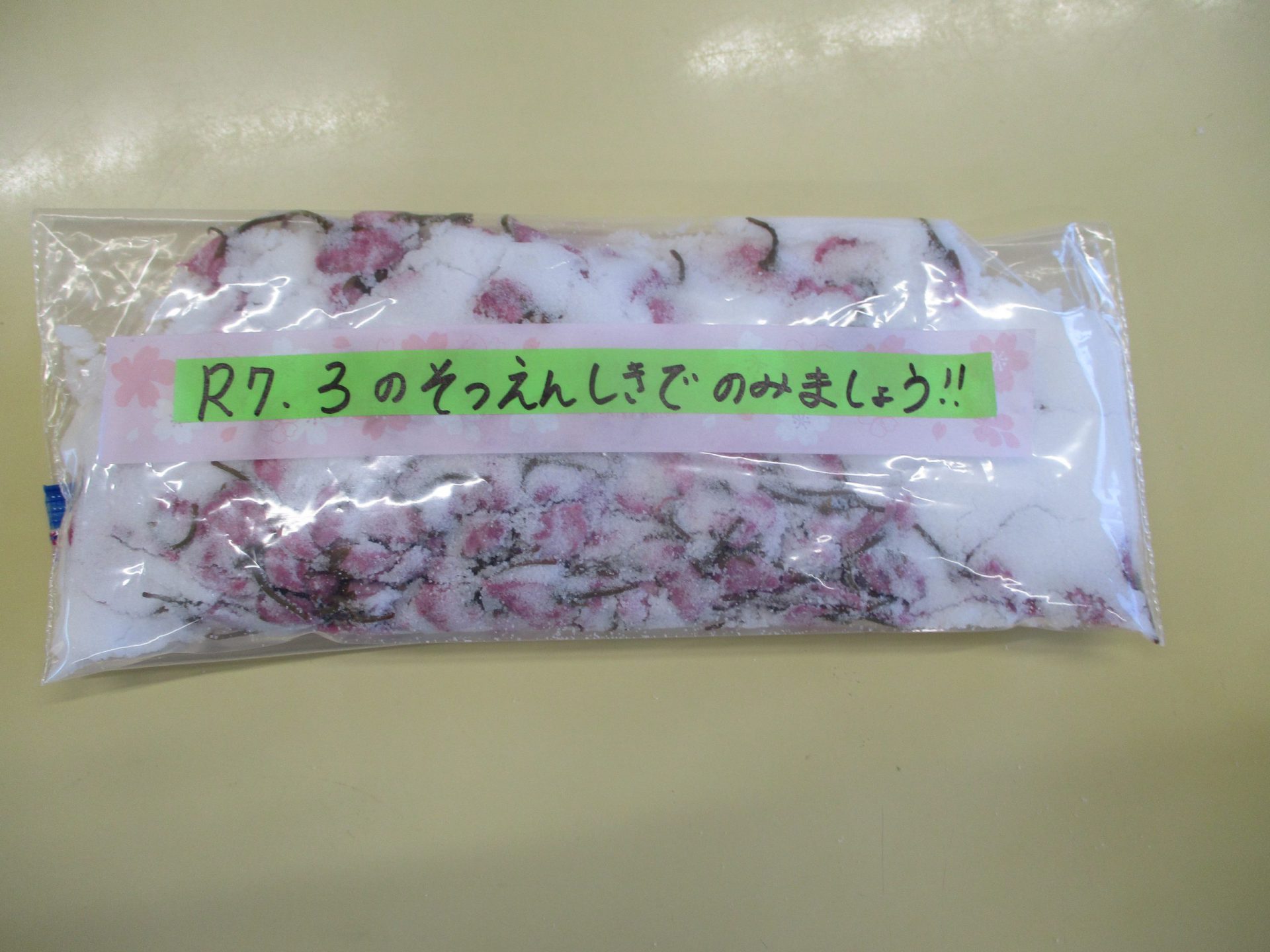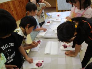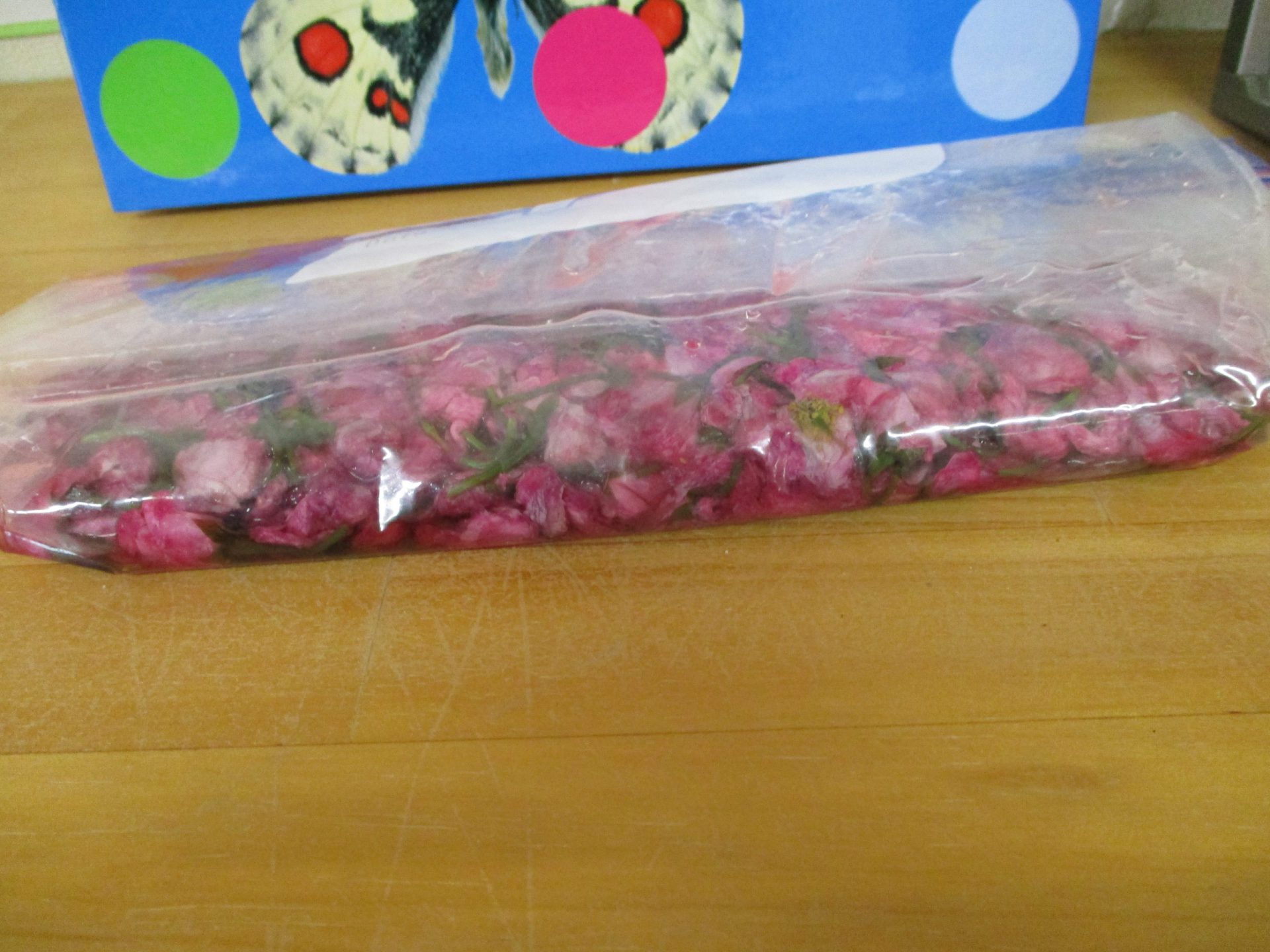 ・昨年度の年長が作った桜の塩漬け。子供たちに桜の話をすると「飲んでみたい」と、今年も作ってみようとなった。昨年度は見ているだけだったが、今年は自分達が作れると張り切っているので、その意欲を大切に色々経験してほしいと考えている。