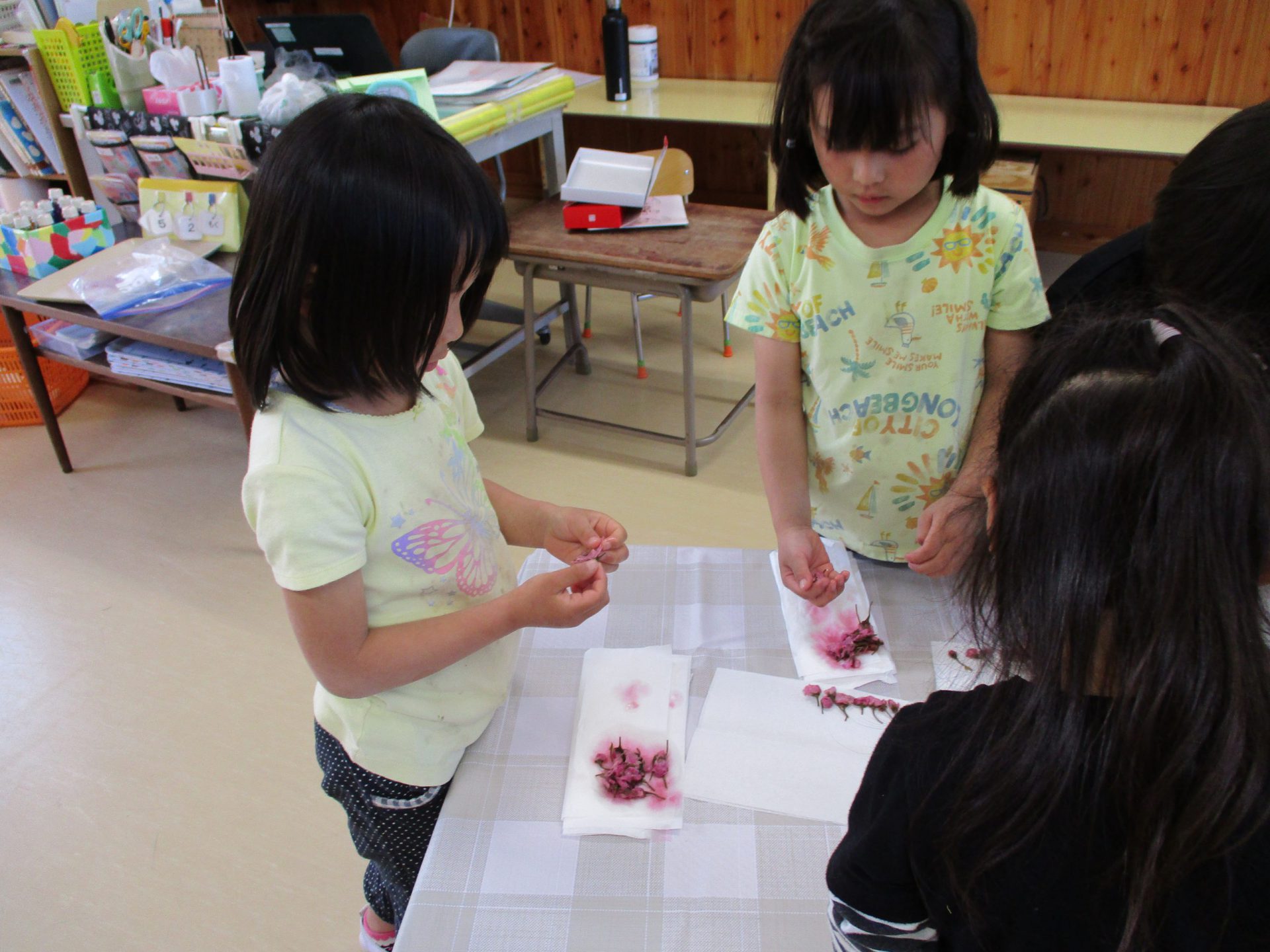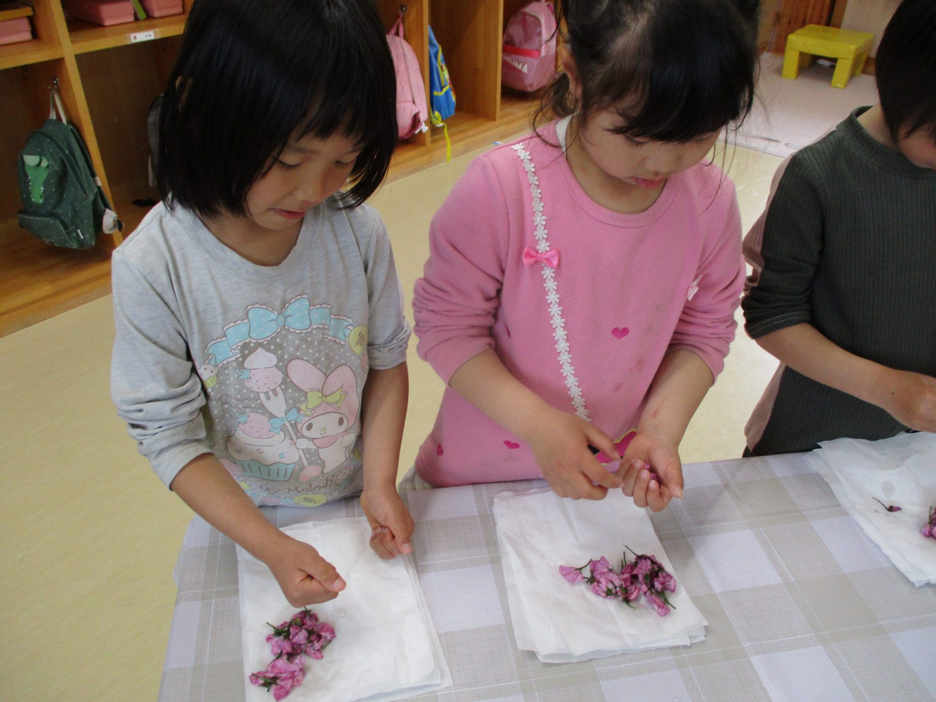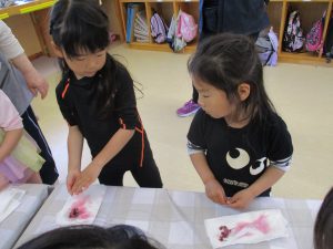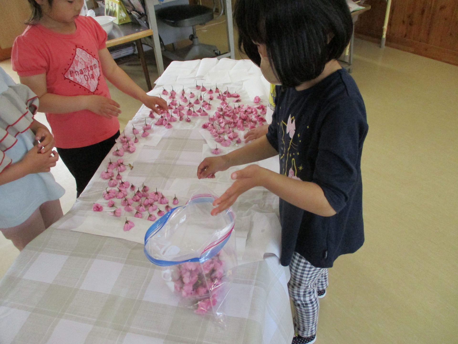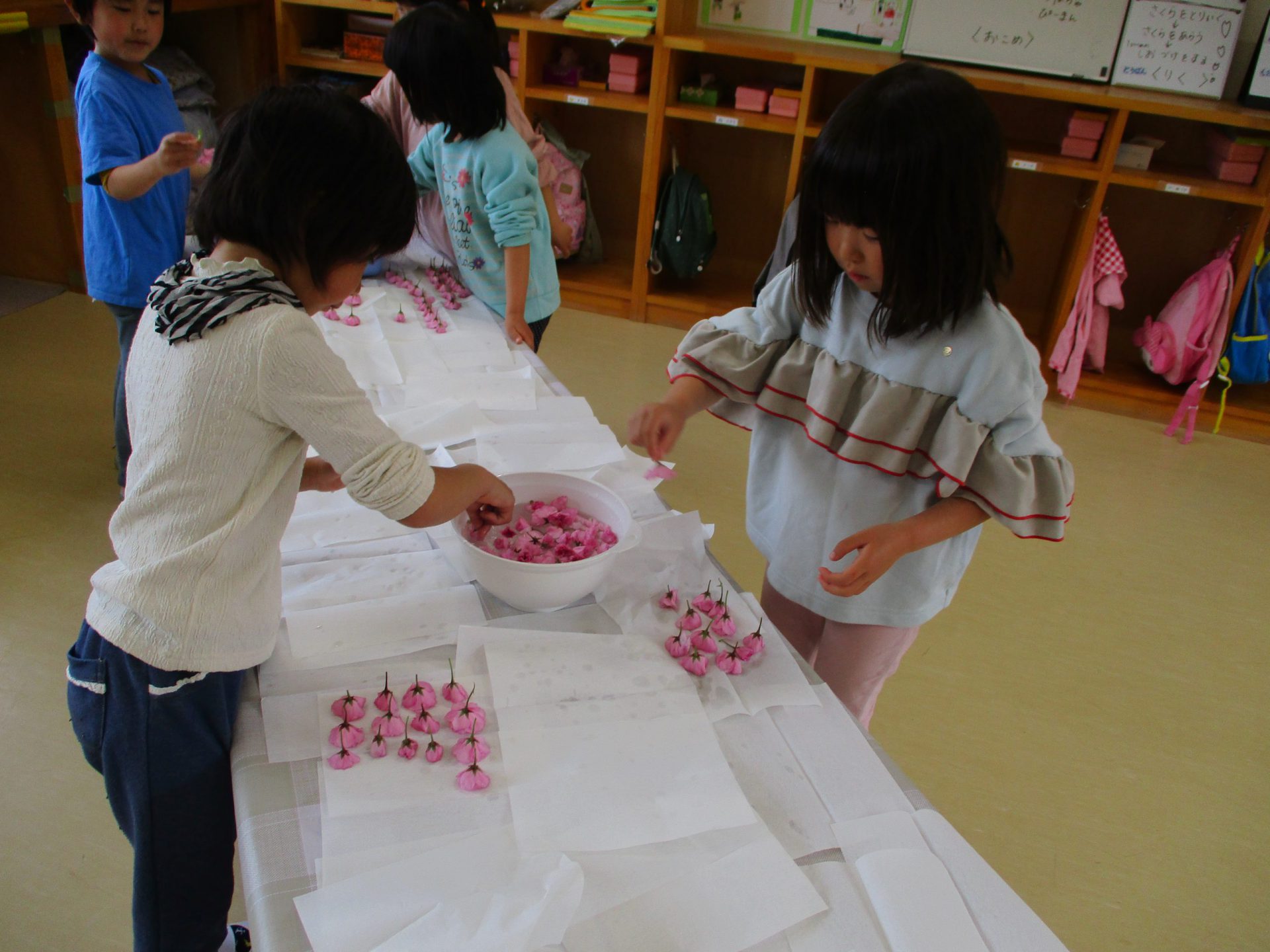 水遊びにならずに丁寧に洗っていきます。桜の並べ方もみんな違う!(その写真なく残念!!)