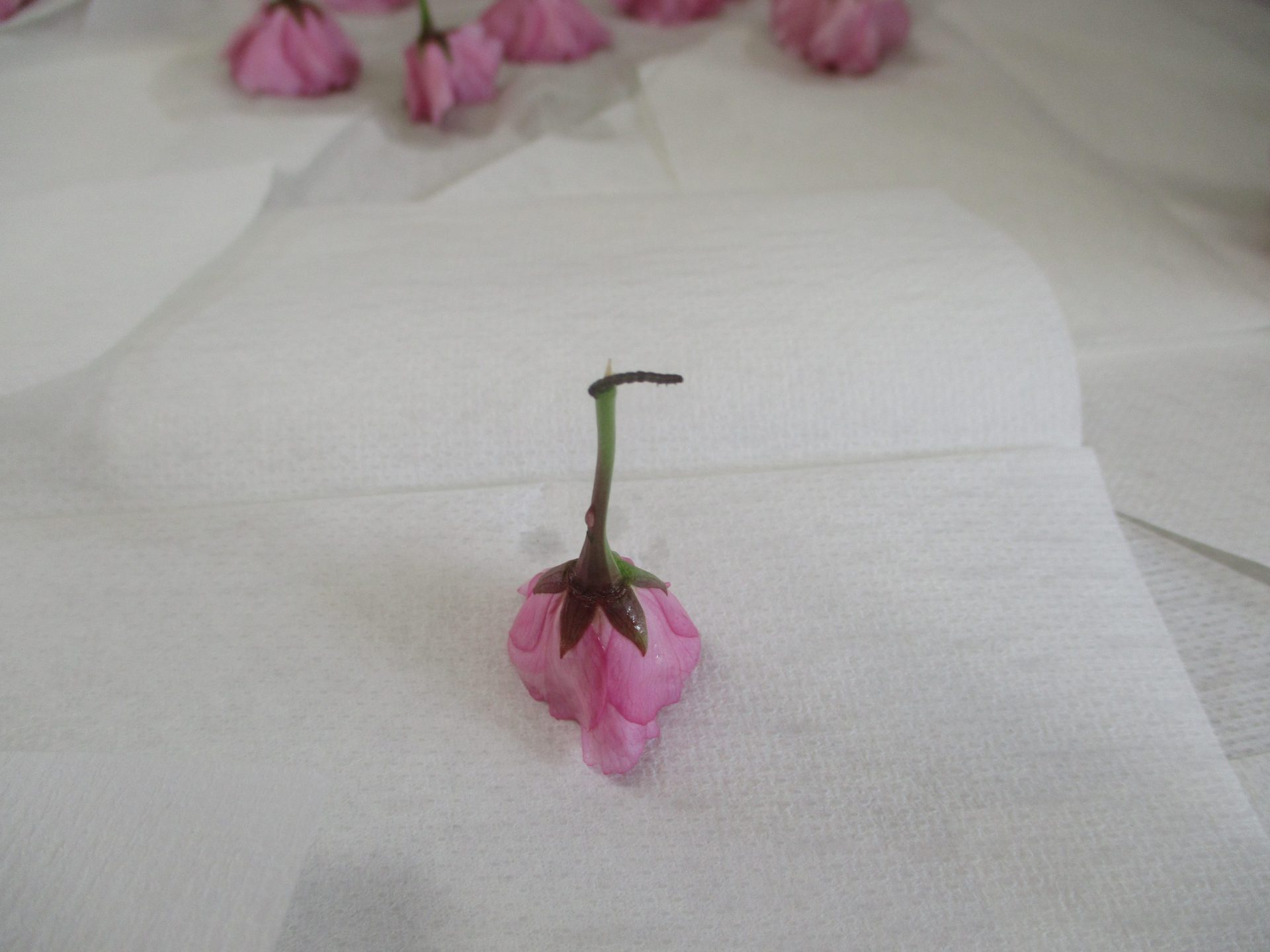 しゃくとり虫ちゃんじゃな~い🐛洗われた桜から何匹も出てきましたよ。始めは「きゃ~」といっていた子も、「見つけたよ👀逃がしてくる」と、率先して逃がしてくれました。塩漬けにされなくてよかったね~~😌