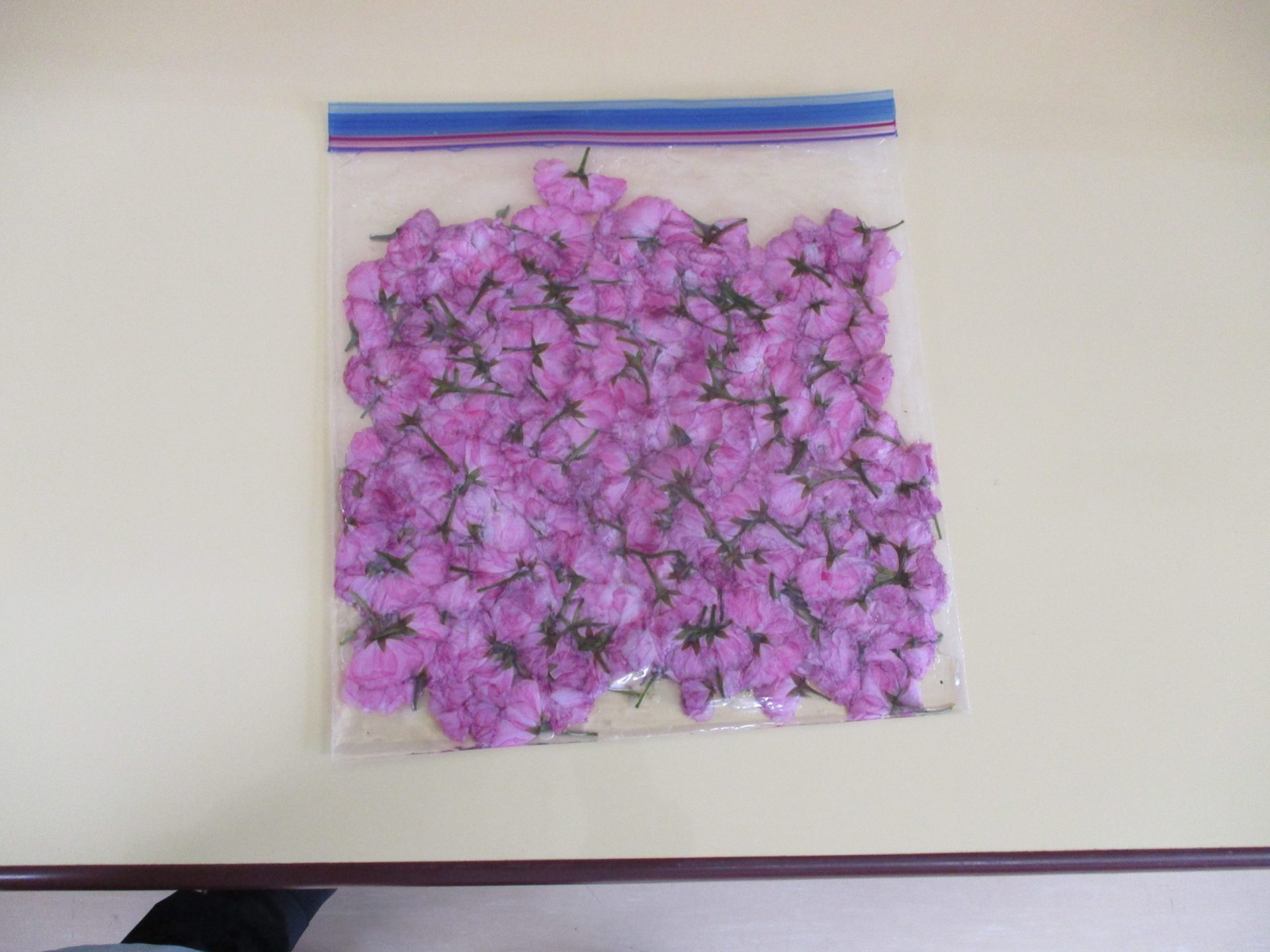 桜をジップロックに入れたら塩を軽くつかんで、パラパラ~っとしていきます。