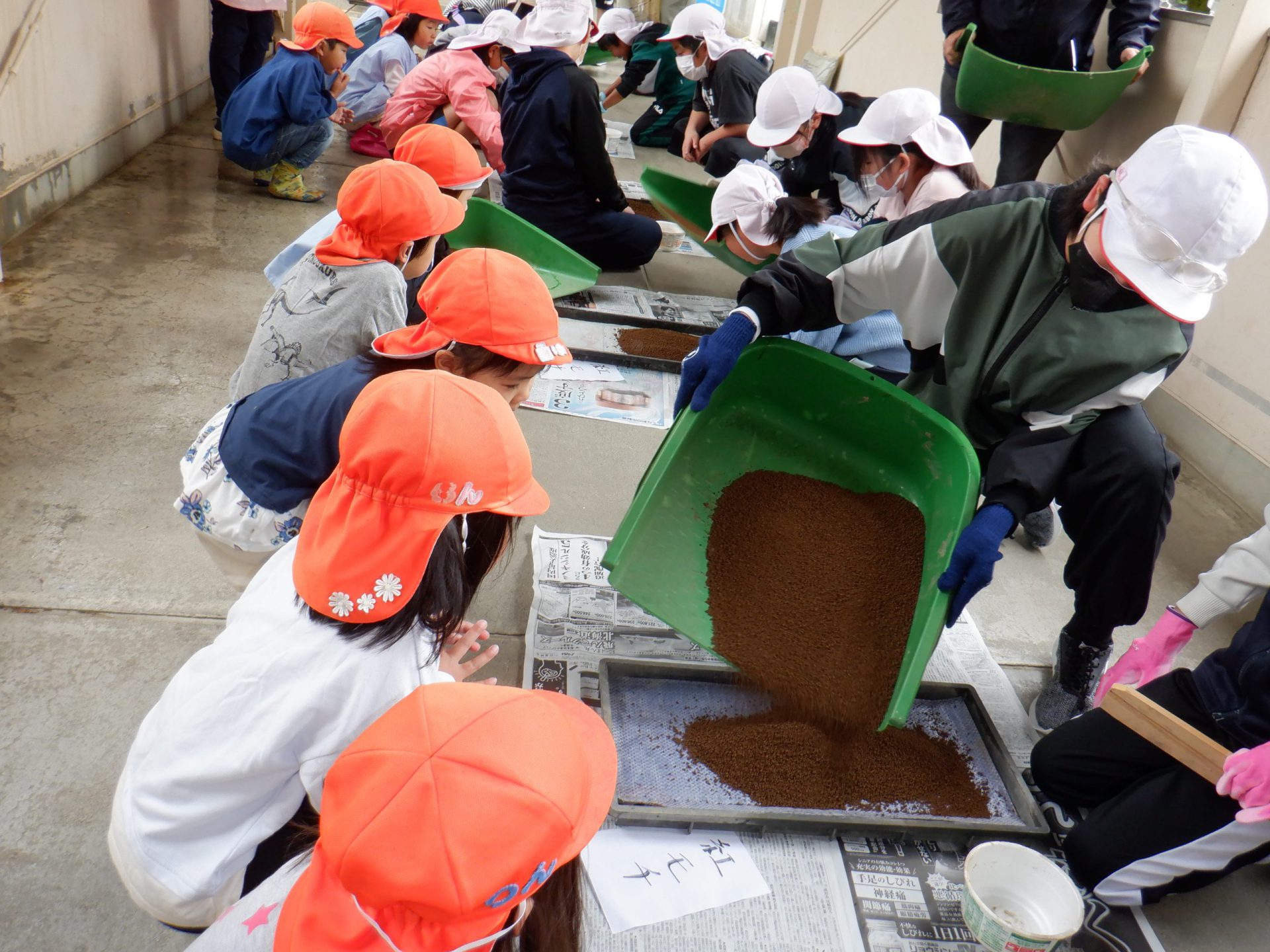この日はあいにくの雨降りで5年生は小学校の中廊下で籾まきを行いました。