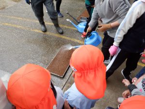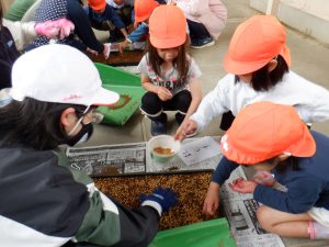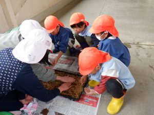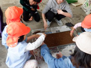 今後、保育園でも始まる「あぐり」の田んぼの活動の前に5年生の籾まきを見せてもらえたことで、田んぼ活動、米作りについて興味が持てたように思う。子どもたちの興味や思いを大事にしながら、保育園、保護者とあぐりの田んぼに関わってくださる方々と一緒に田んぼの活動を行い、米作りのおもしろさ、大変さを経験し、お米を大切にする気持ちも育てていきたい。
