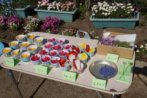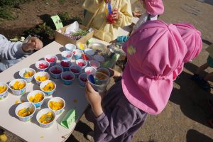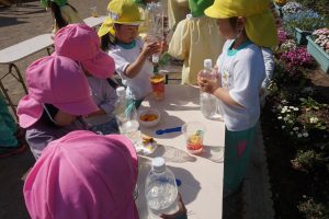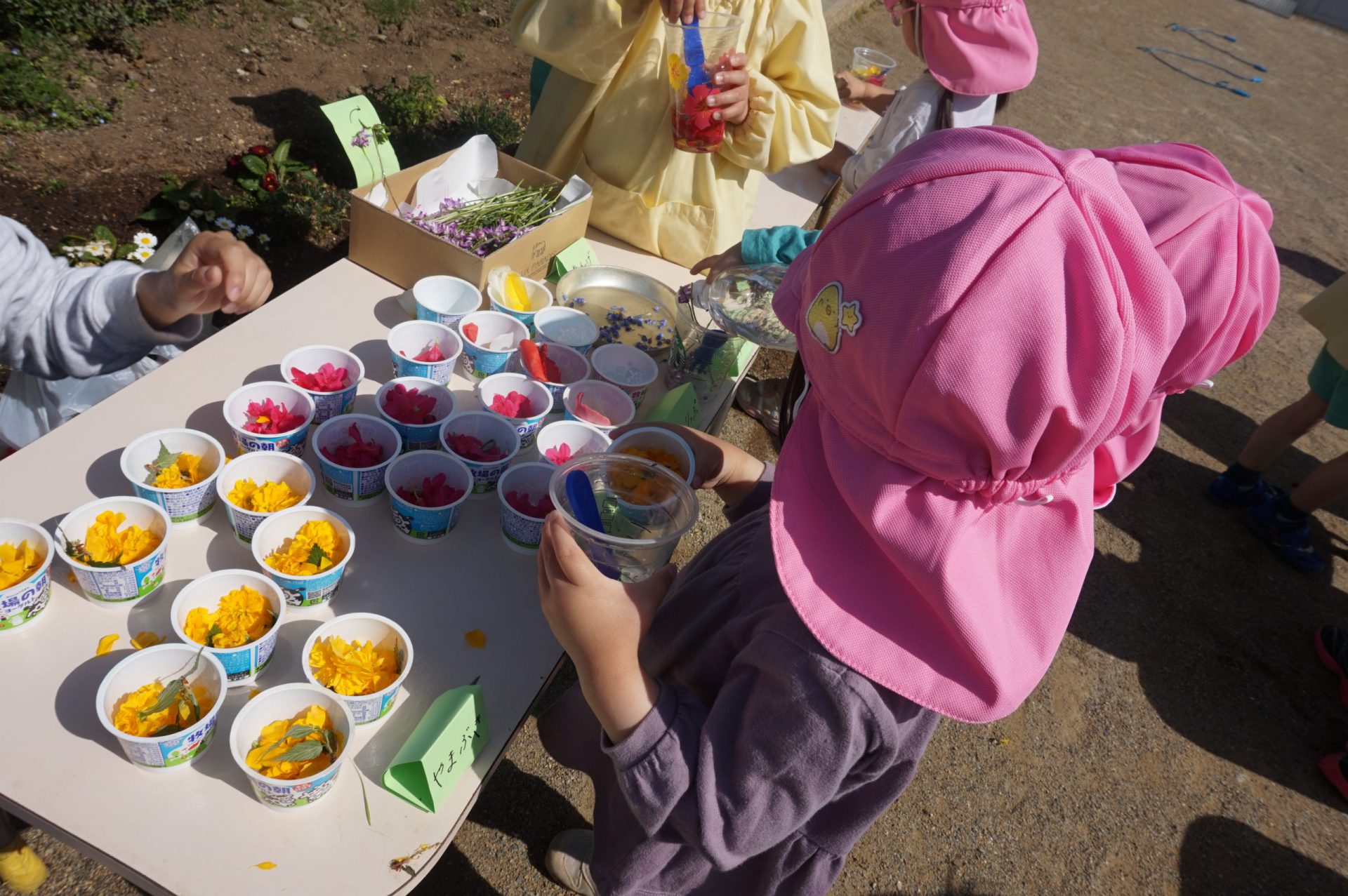 ・草花コーナーにて、子どもたちが自分で花や道具を選んで、考えながら色水作りを楽しむ。