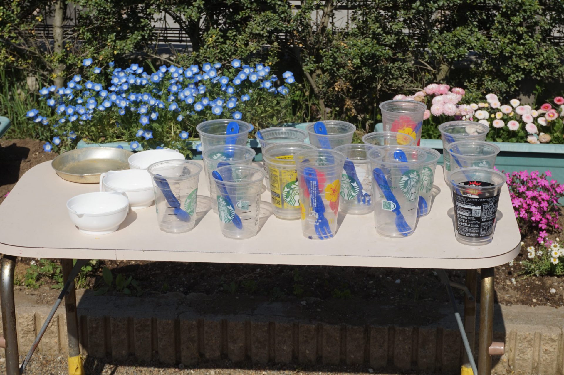 ここ最近、夢中になっているのは草花遊び。その姿から、沢山の花やカップなどの空き容器、すり鉢・すり棒、スプーン、フォーク、砂場セットの中で使えそうな物(ふるい・皿など)、水を入れたペットボトル、などを用意しました。