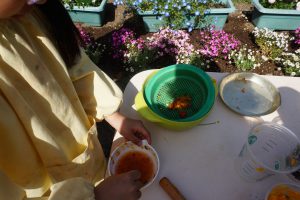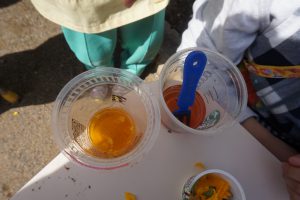 ≪花を選んで⇒容器に入れて⇒水を入れて⇒潰して⇒色を出す≫この工程が楽しいようで、『赤い花と黄色い花でオレンジができた!!』『こっちは、ちょっと薄い色!』と驚きや発見が続出・・・。また、色が出きってしまった花びら(出がらし)をふるいにかけて色水だけにする工夫もあり、遊びながら沢山の学びに繋がっているなぁ~と、感心させられました。実は・・・昨日、仲間入りしたばかりの、“すり鉢・棒”が大人気で、これをめぐりちょっとした子どもならではの関わりも・・・。取り合いとまではなりませんが、要領よく使う子、なかなか貸してもらえない子、絶対貸したくない子(笑) 譲り合うこともできるようになってきて、社会性も育っています(^^)/