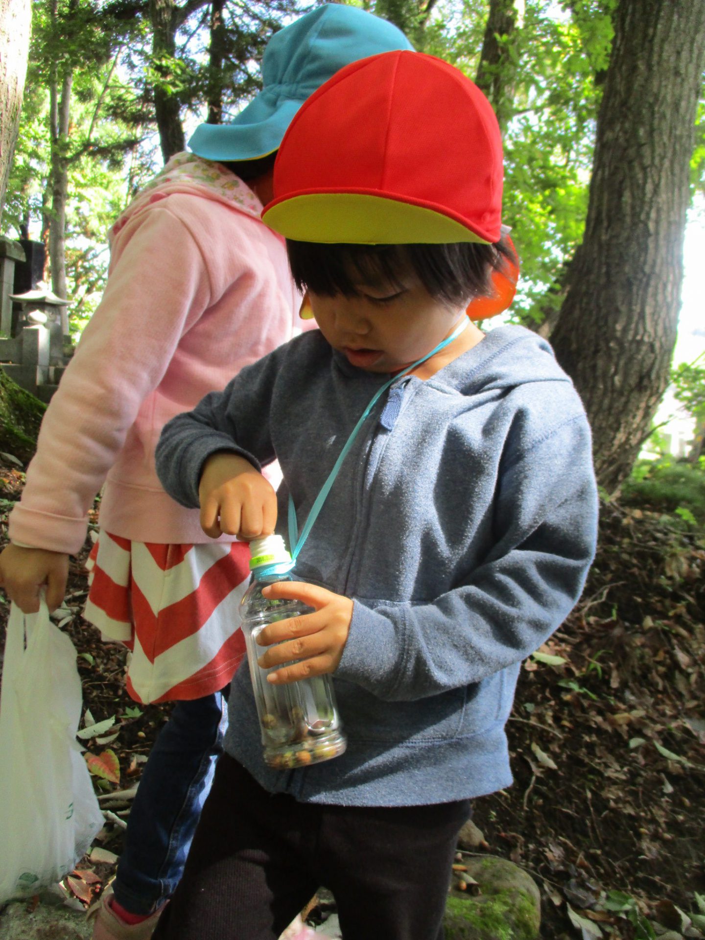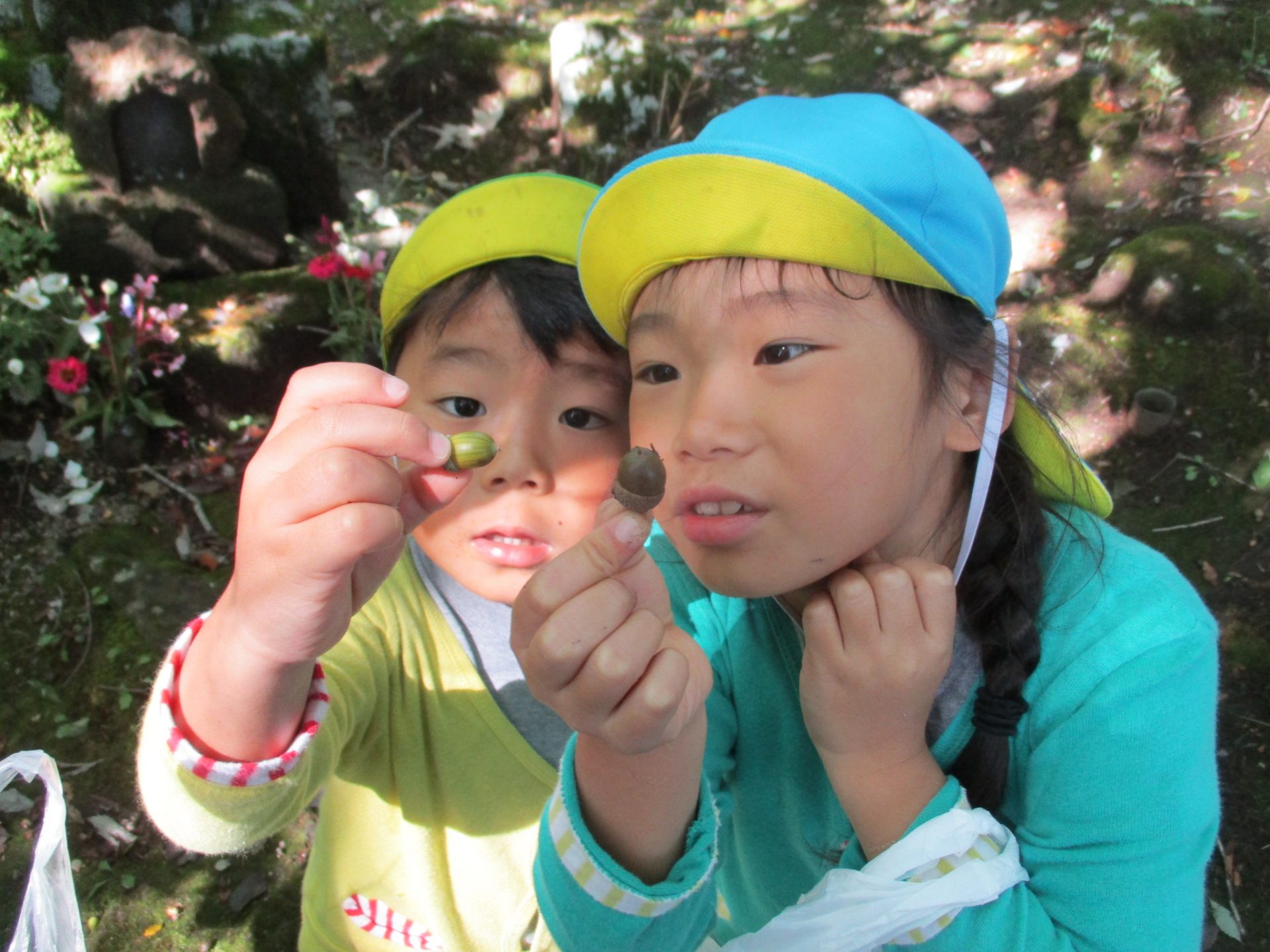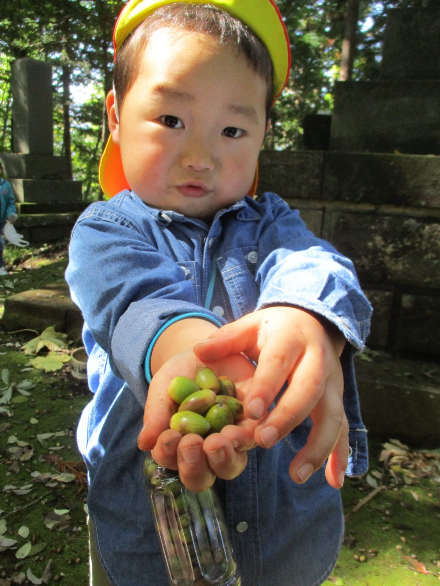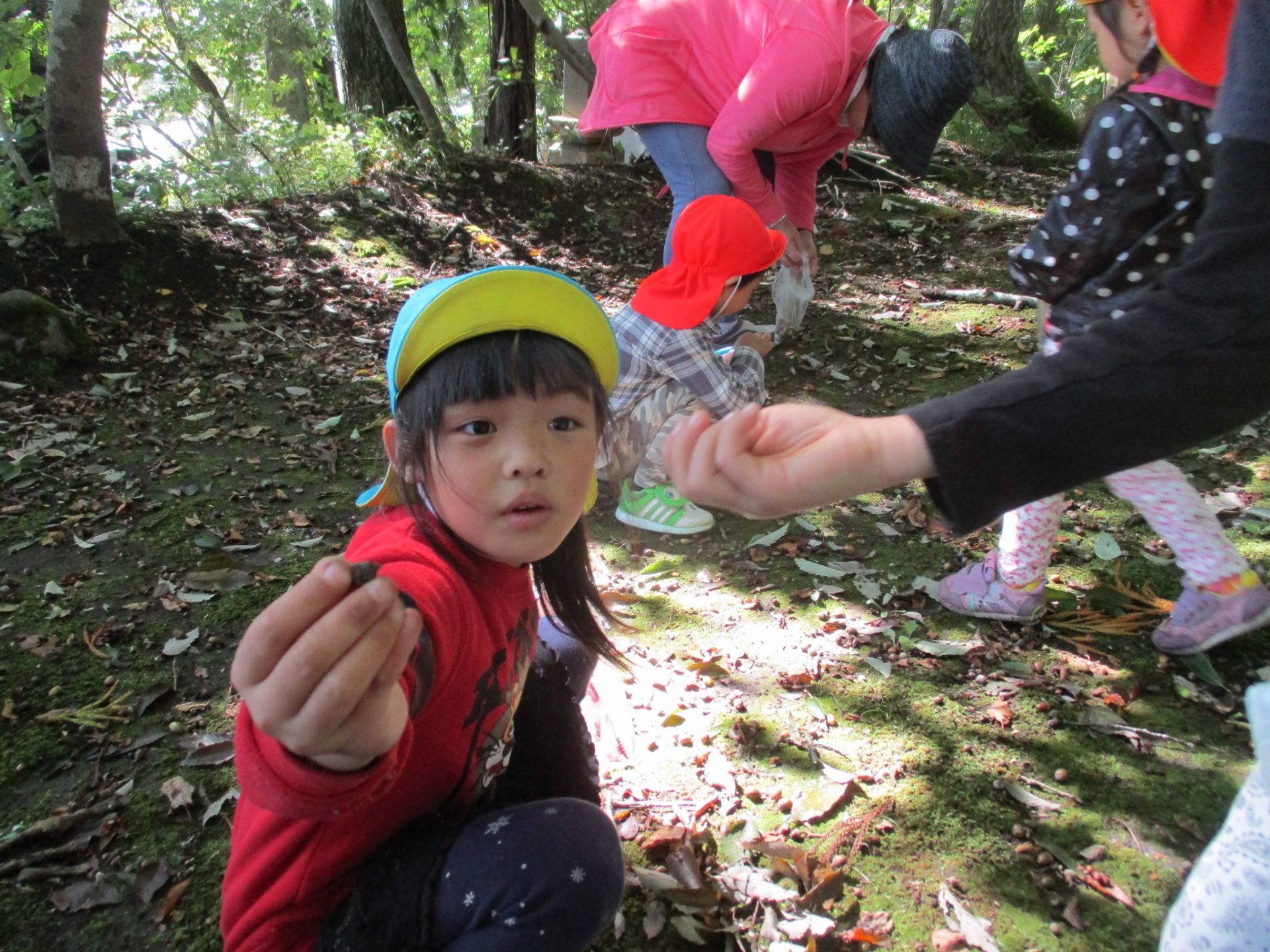 先日保育士が下見に言って拾ってきたどんぐりや松ぼっくりを見て、楽しみにしていた子ども達。ビニール袋を持って探検に行くぞー!おー!