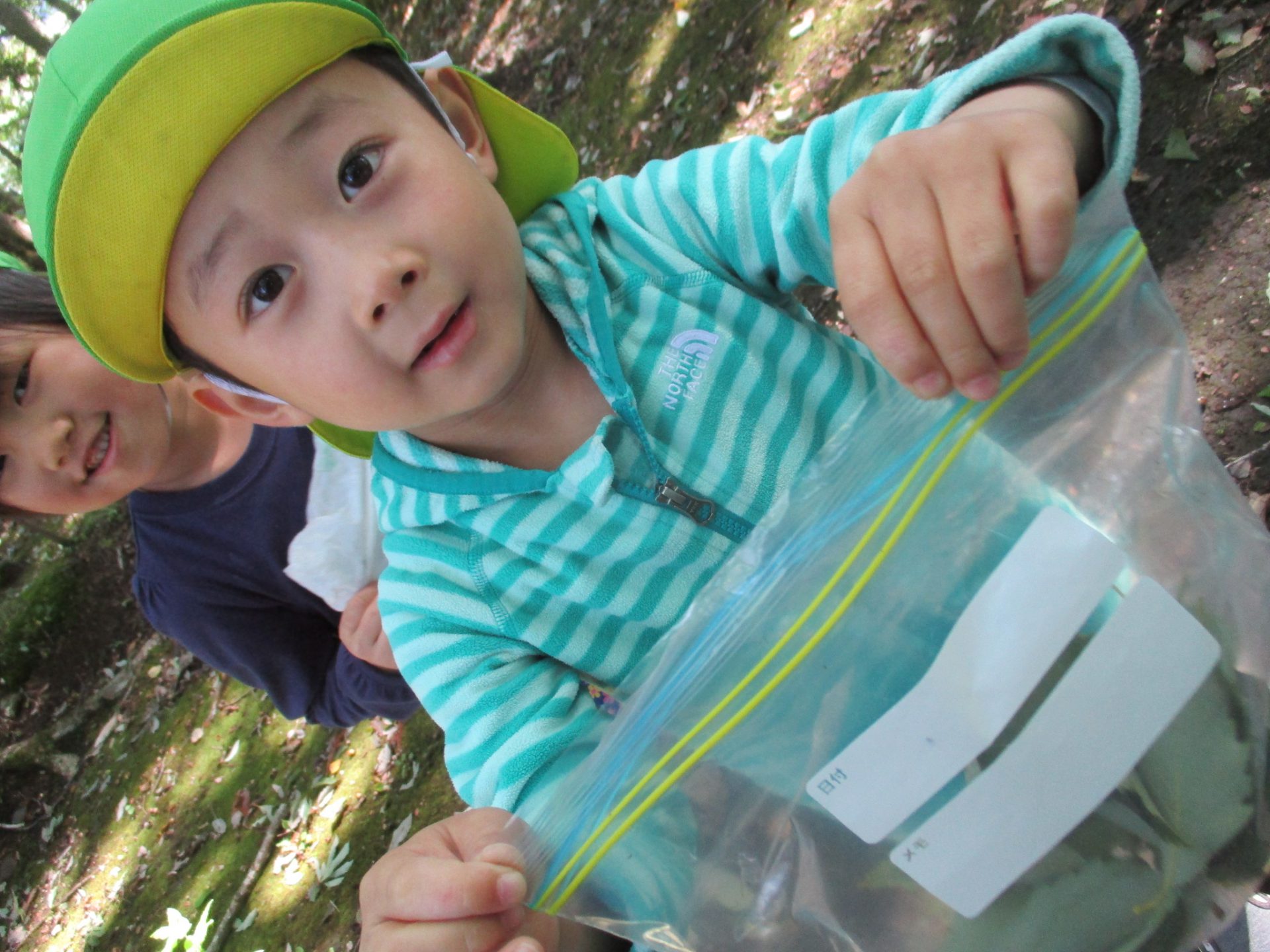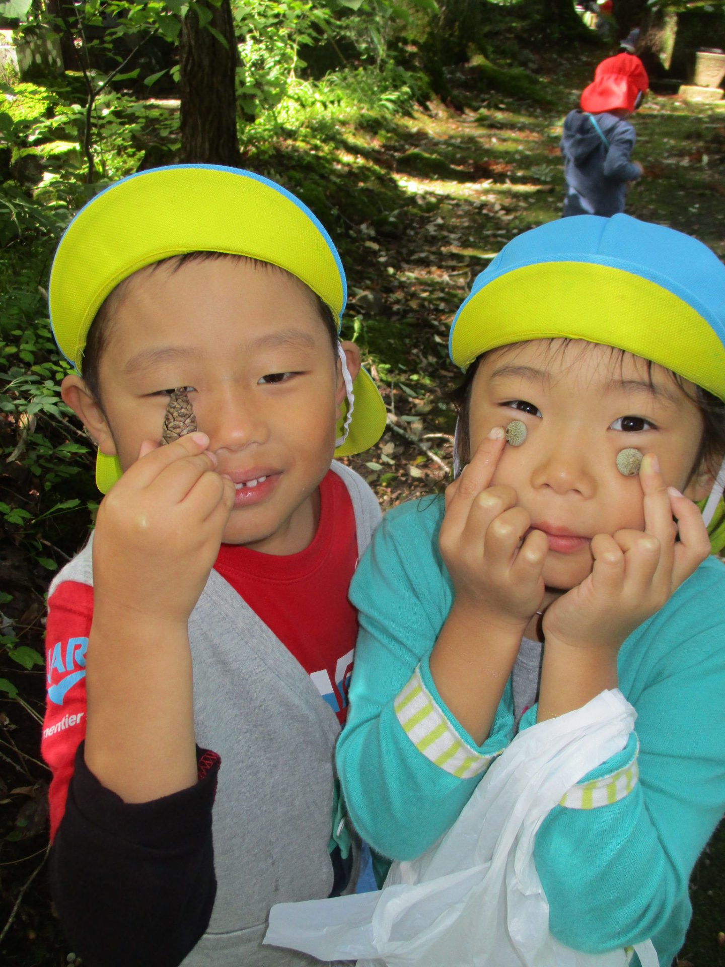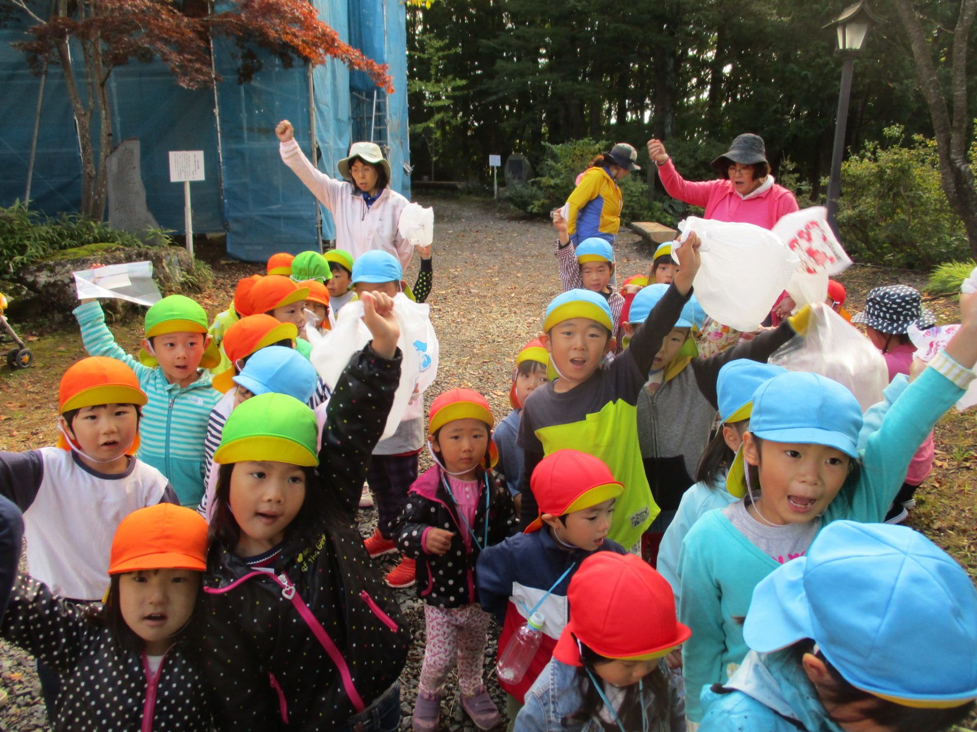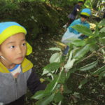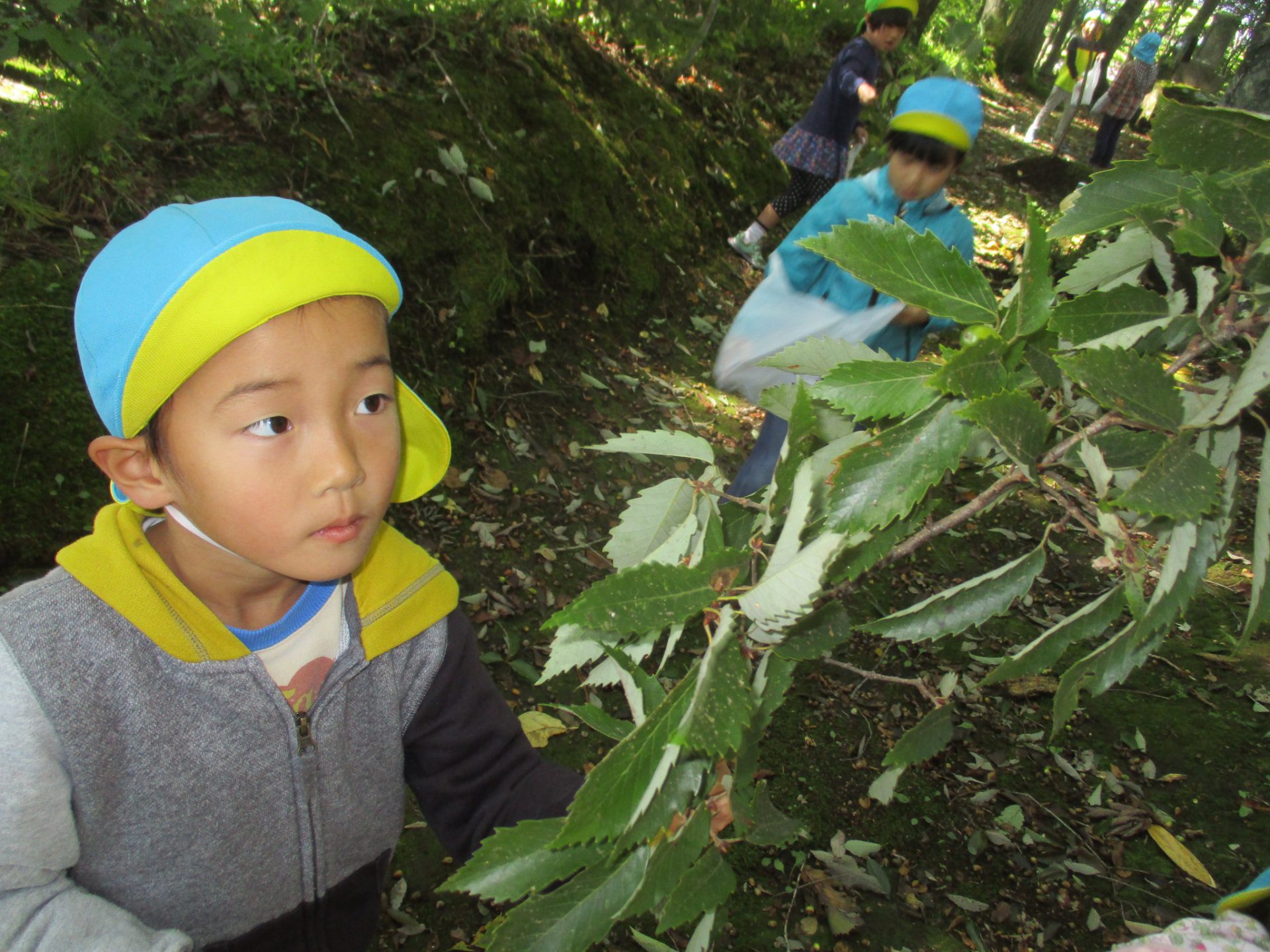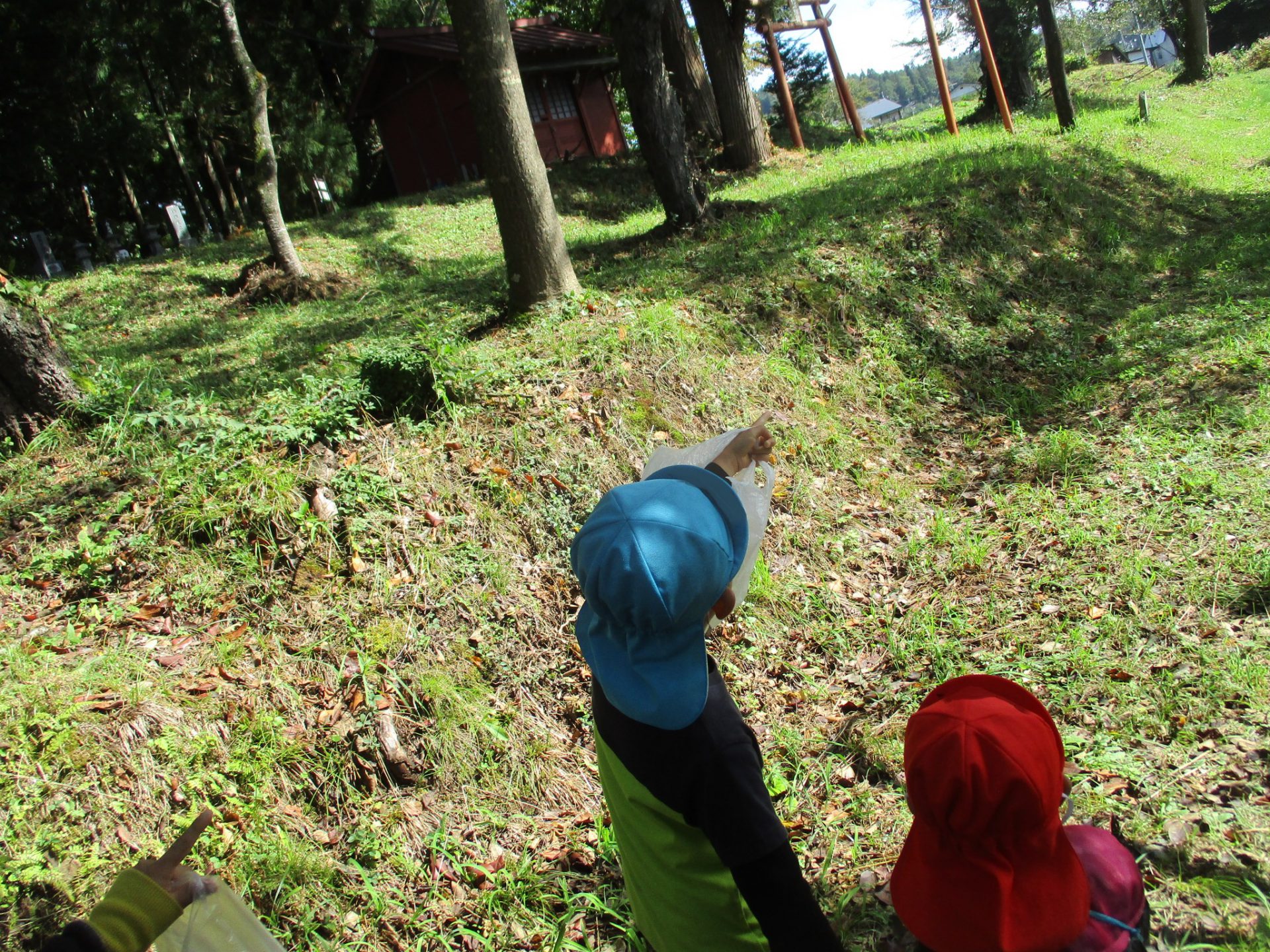 先日保育士が下見に言って拾ってきたどんぐりや松ぼっくりを見て、楽しみにしていた子ども達。ビニール袋を持って探検に行くぞー!おー!
