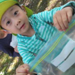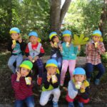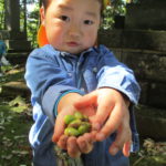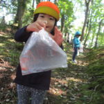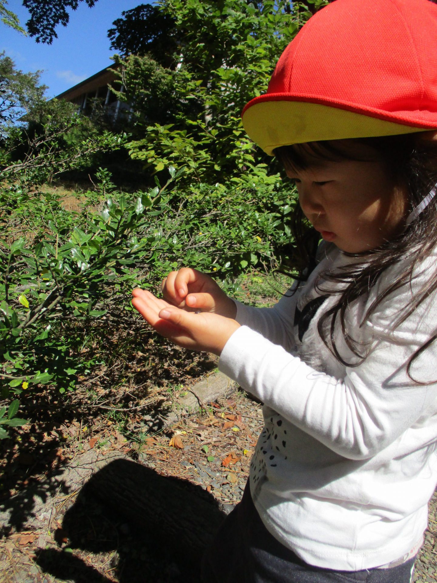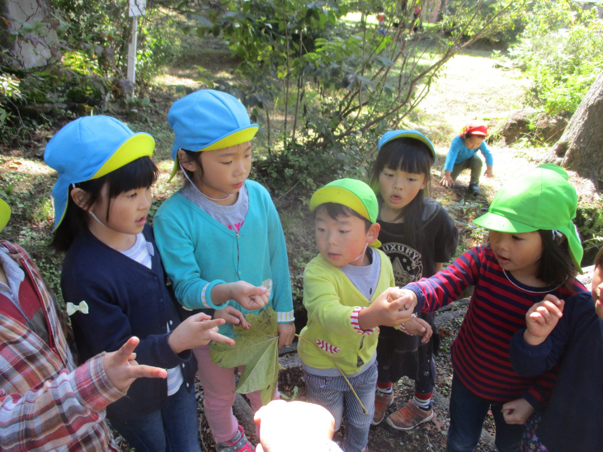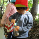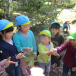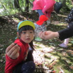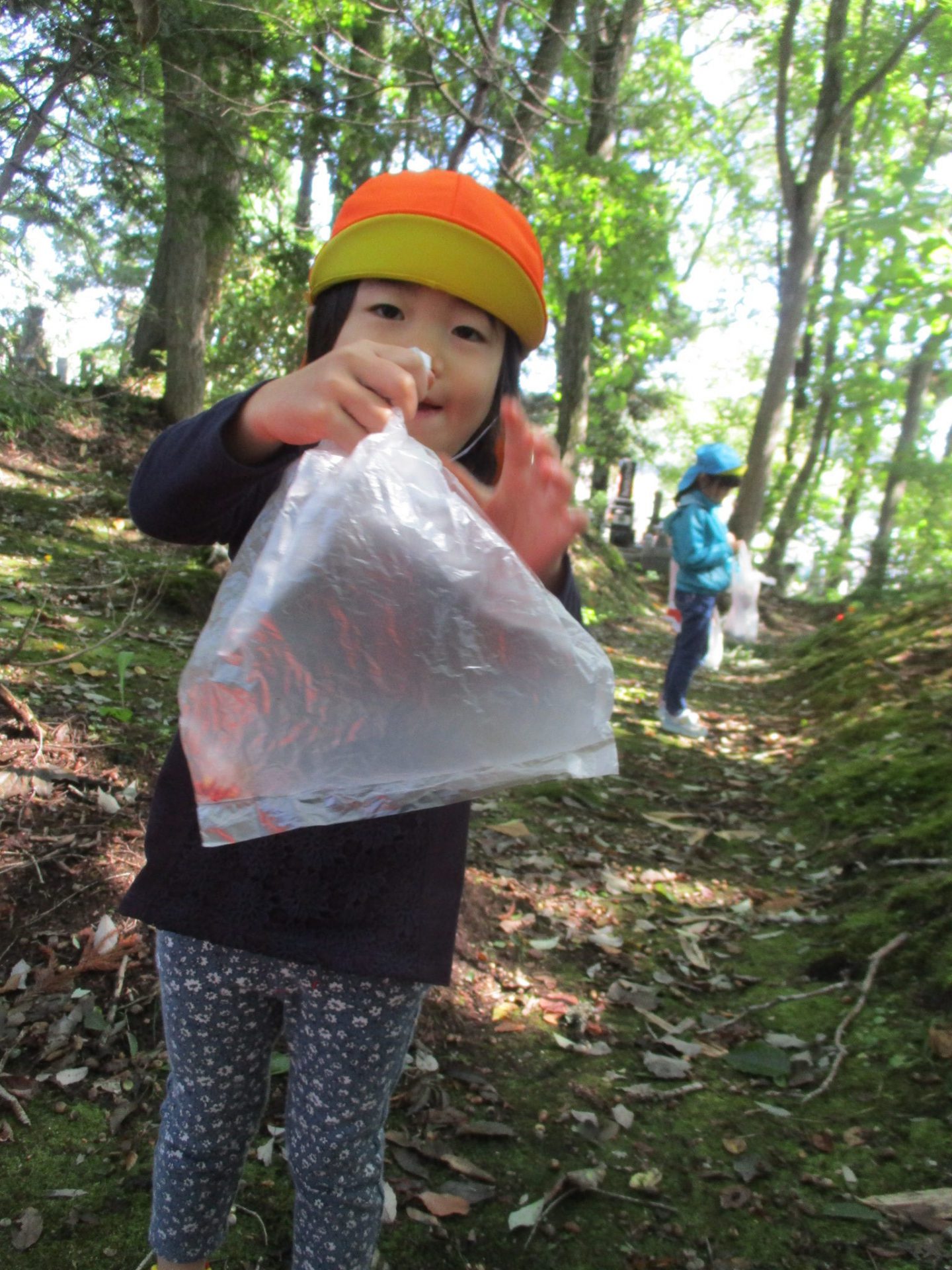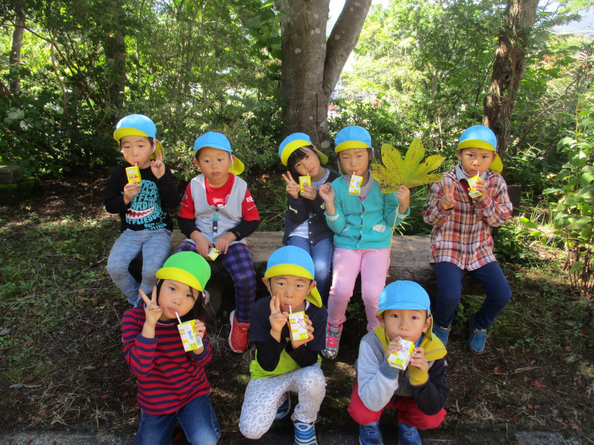 先日保育士が下見に言って拾ってきたどんぐりや松ぼっくりを見て、楽しみにしていた子ども達。ビニール袋を持って探検に行くぞー!おー!