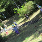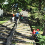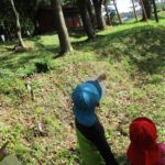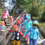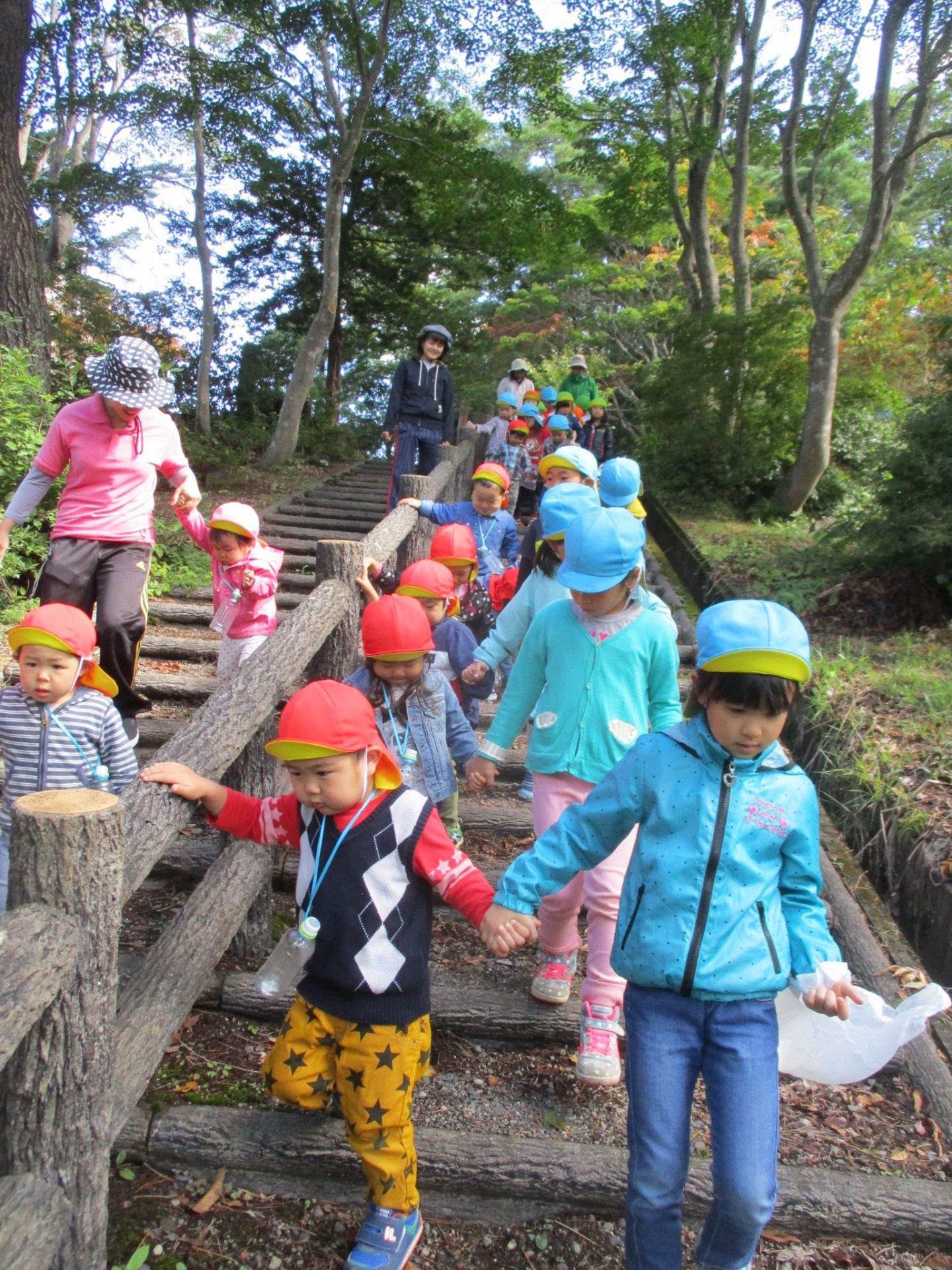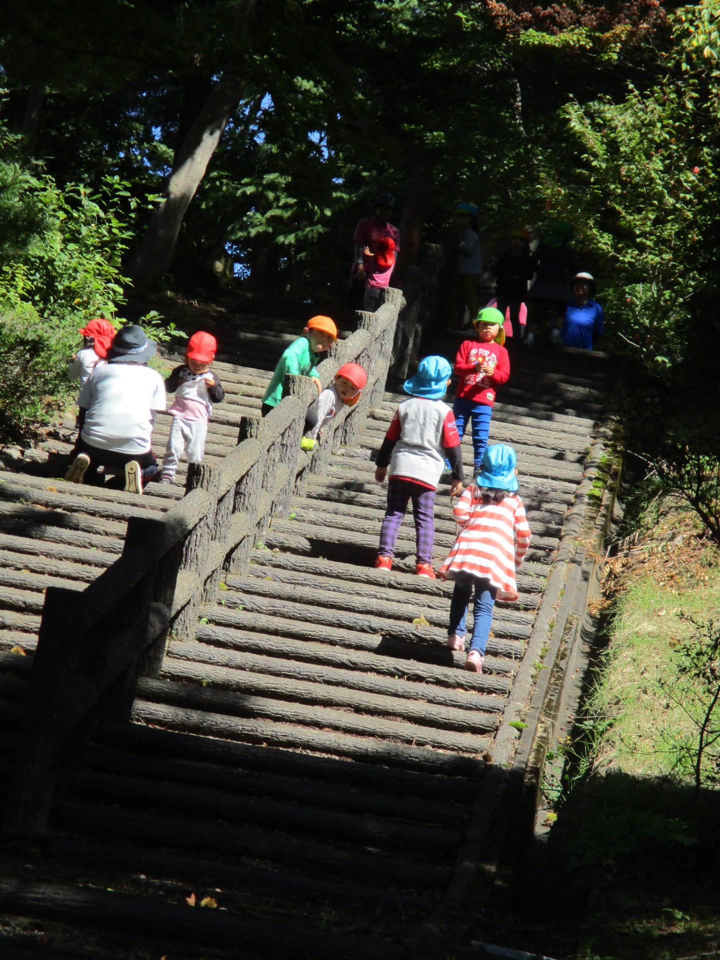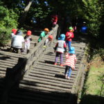 去年もこの場所に来たことを覚えていた年長さん。「あっちの坂を登って階段のところにどんぐりがたくさん落ちていたと思う!」よし!行ってみよう!「みんなー!行ってみるよー!」