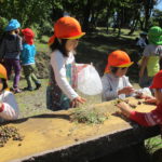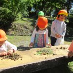 また、自然物を拾う前から「ケーキ作りたい!」「どんぐりころころマシーンにしよう!」と楽しみにしていた5歳児。作って楽しむ、そしてそれを相手に伝える喜びも味わえるような活動をしていきたいと思います。