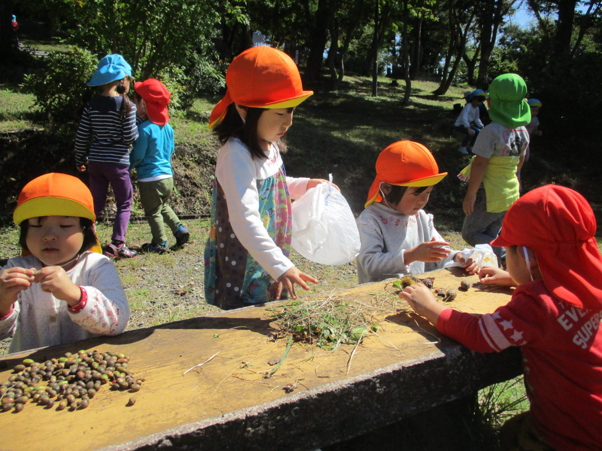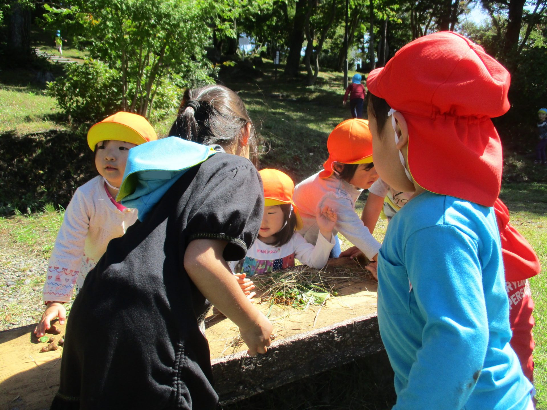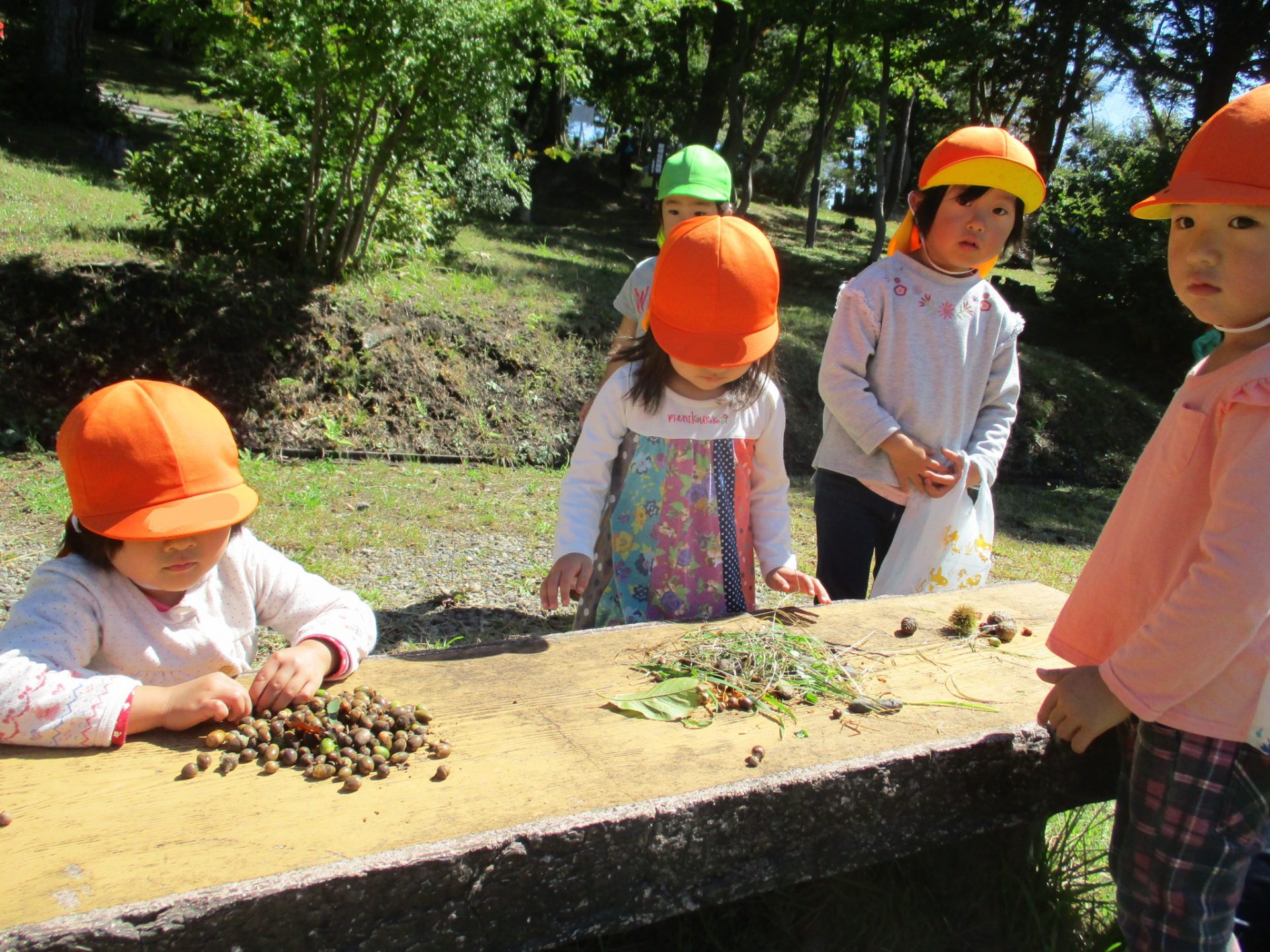 拾ってきたどんぐりを早速ベンチに広げておみせやさんです。「スイーツやさんですよー!」3歳児のおみせやさんに2、4、5歳児が次々と遊びにきて大賑わいでした。