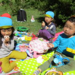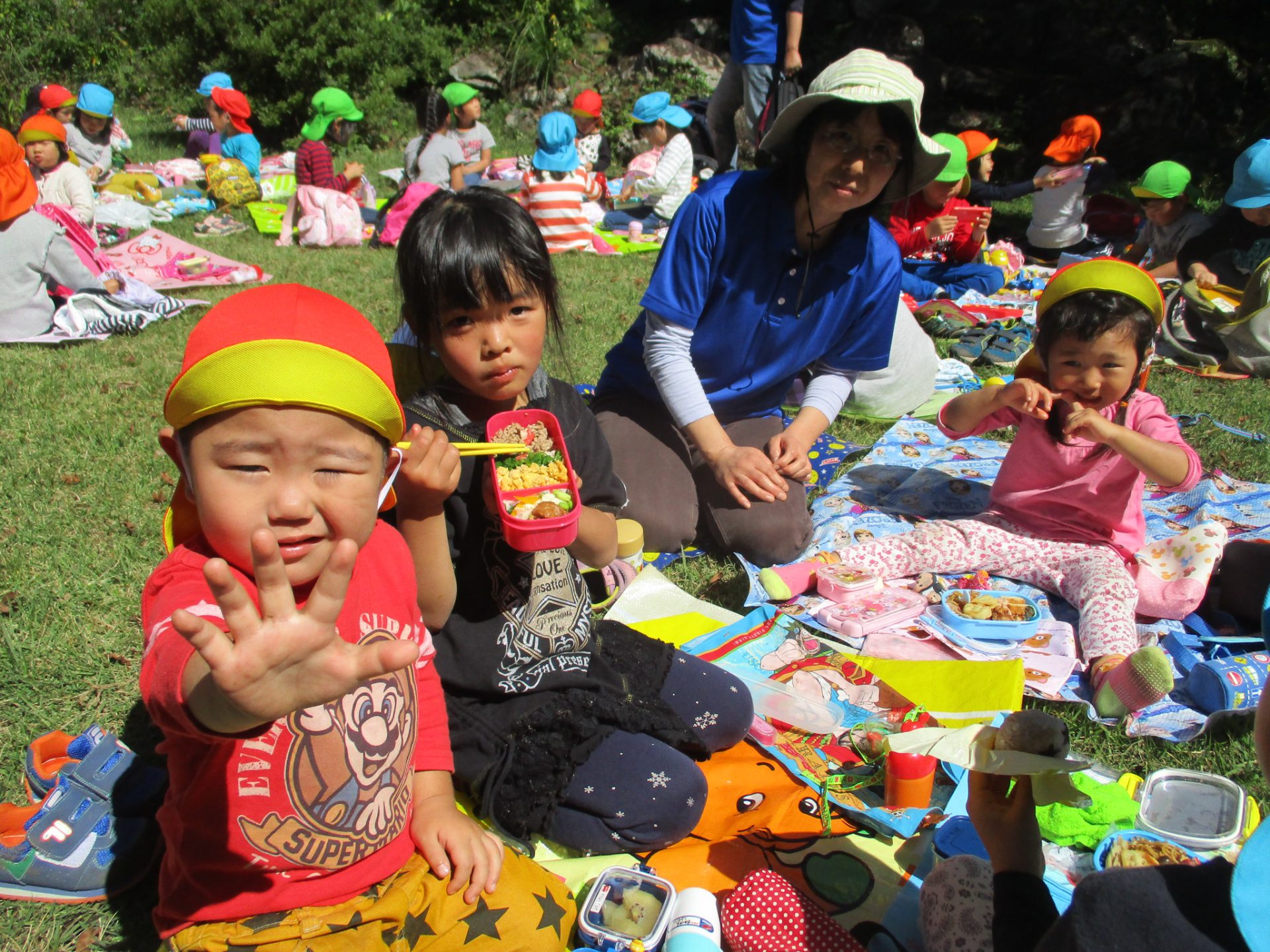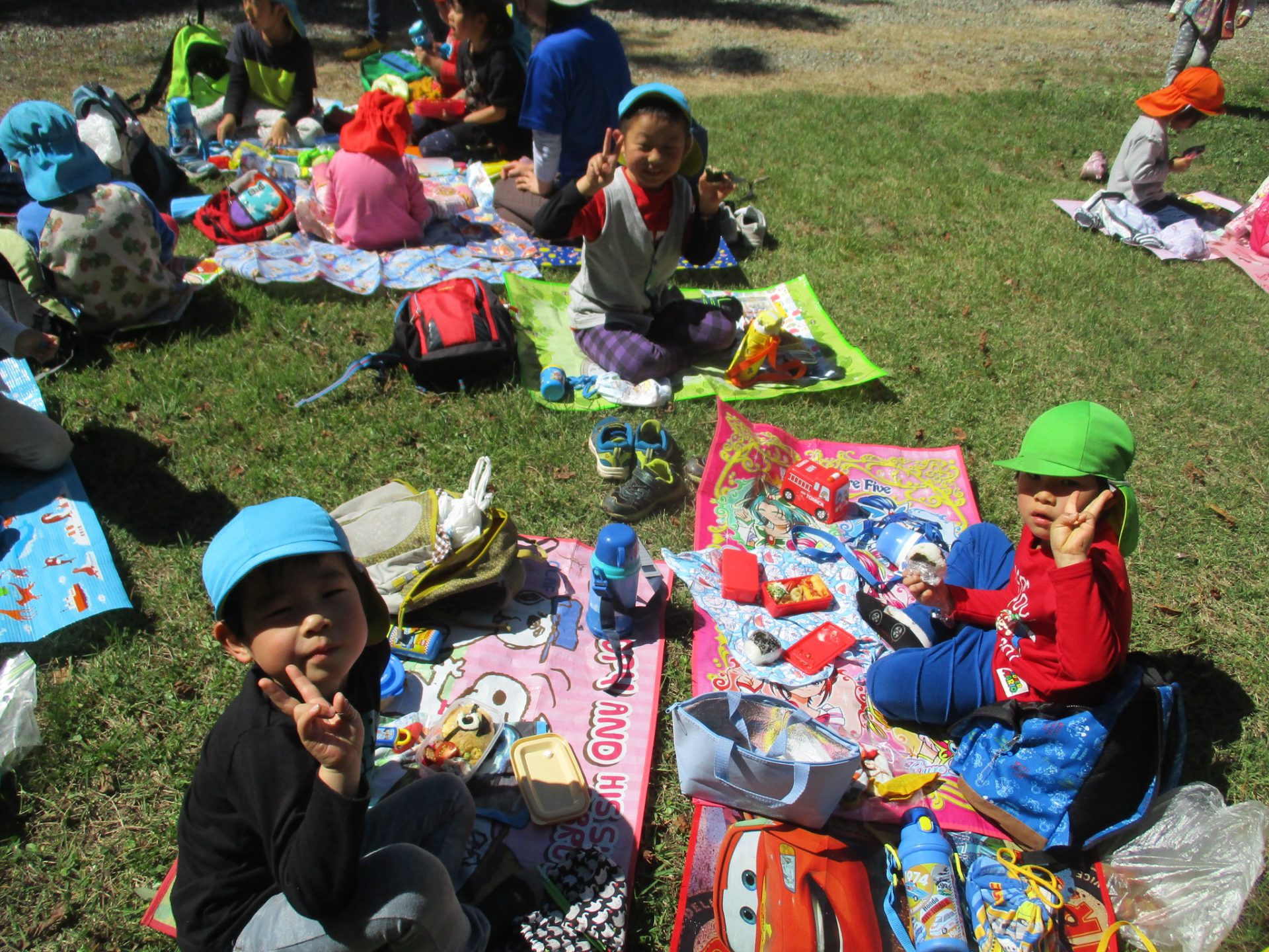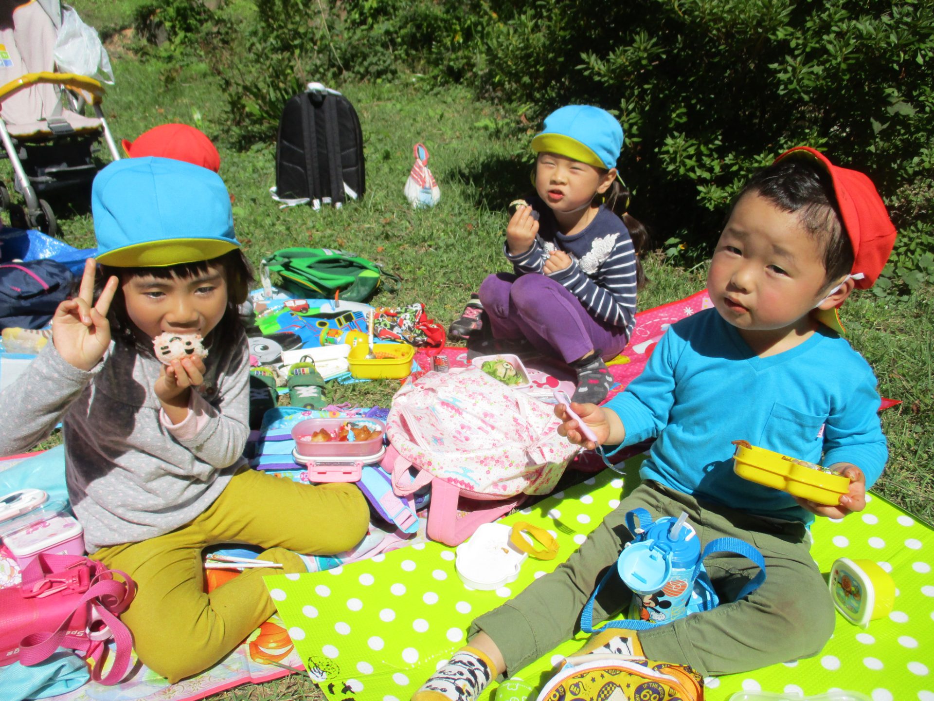 たくさん遊んでおなかがぺこぺこ。いやいや実は公園についてすぐに「おなかすいたー!お弁当食べたい!」と言う子が続出していたのです。2歳児さんの中にはかばんからお弁当を出してしまう子も…。おうちの人の愛情がたっぷりつまったお弁当おいしくいただきました。ありがとうございました。