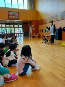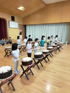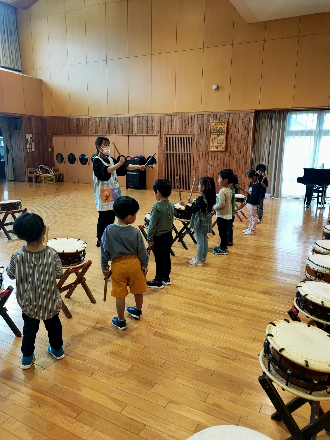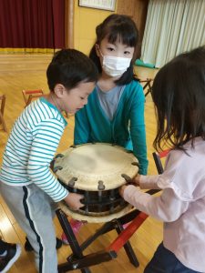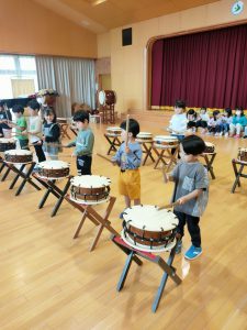 初めての太鼓の活動では、間近で聞く太鼓の力強い音に驚く姿や、どこを持って運ぶのか、どうやって叩くのかなどを真剣な表情で聴く姿から、子ども達のやる気を感じました。