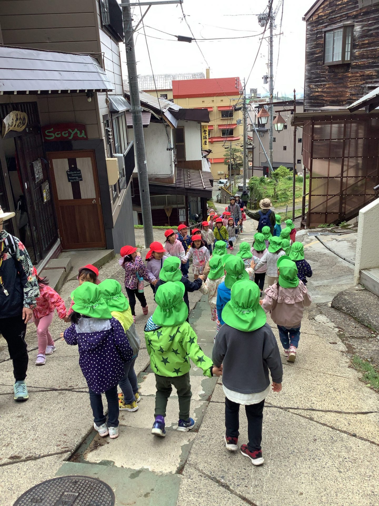 ちょっと雨が心配だったけど、行けるところまで行こう!と歩き始めたところで年長さんの姿が。「行ってきま~す」「行ってらっしゃ~い」と言葉を交わしました。