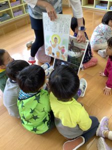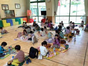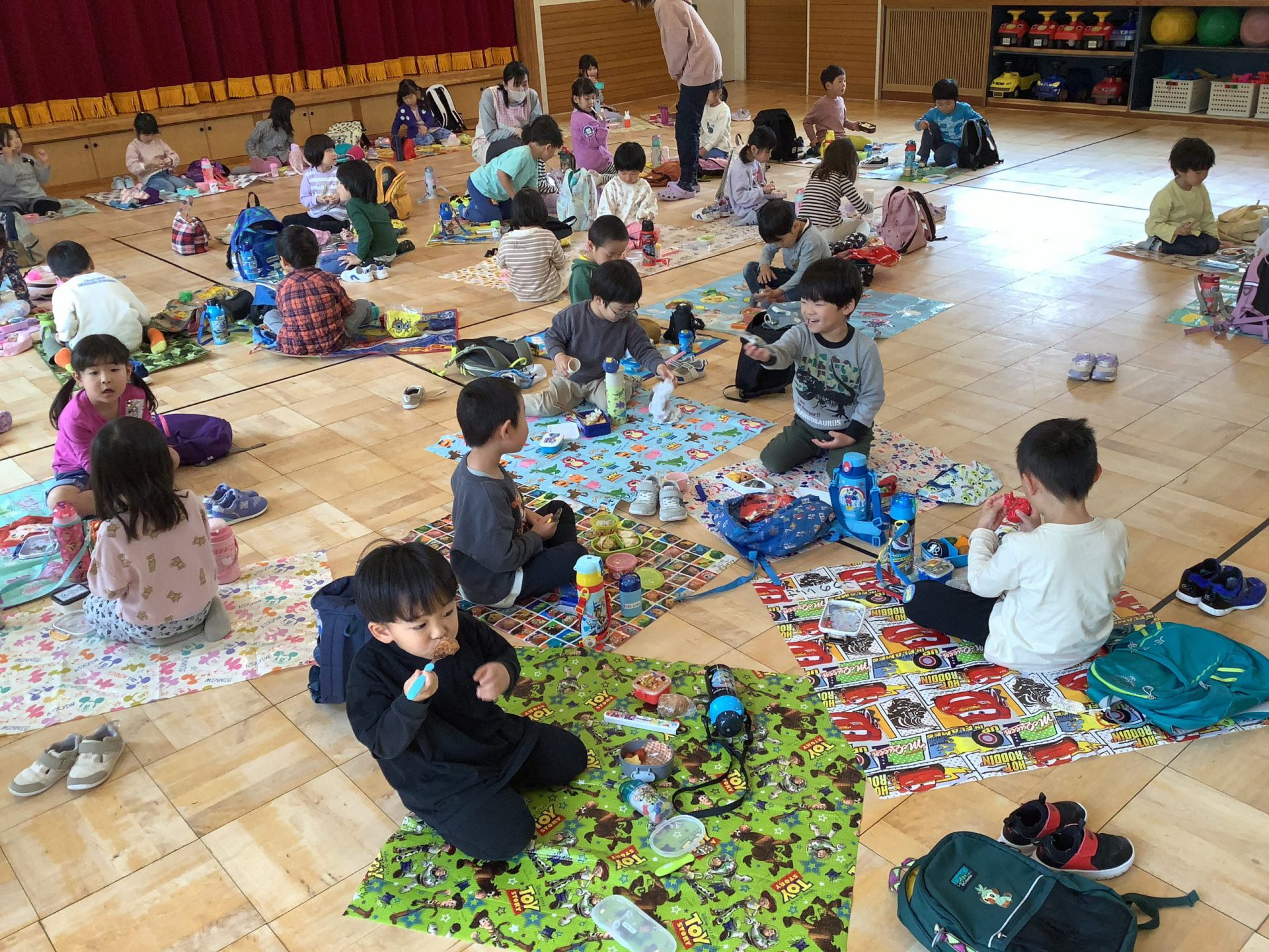 この日は、お家の人が作ってくれたお弁当を持ってくる【お弁当の日】でした。散歩先が同じだった年長さんの帰りを待って、遊戯室で一緒に食べました。学年・クラスの枠を越えた楽しくてにぎやかな雰囲気の中のお昼になりました。お家の皆さん、おいしいお弁当をありがとうございました。