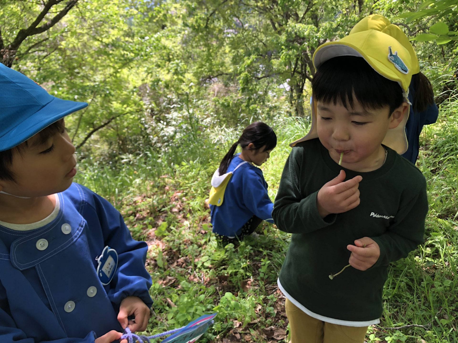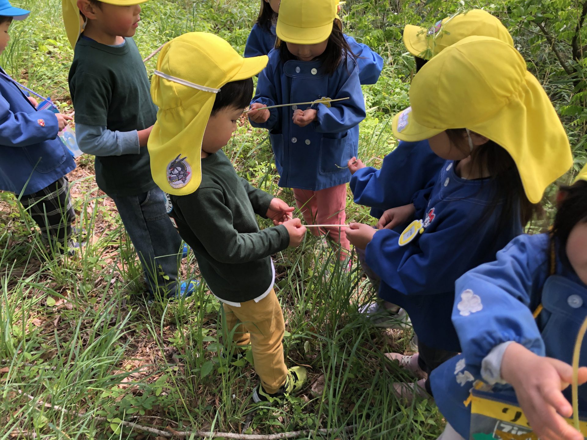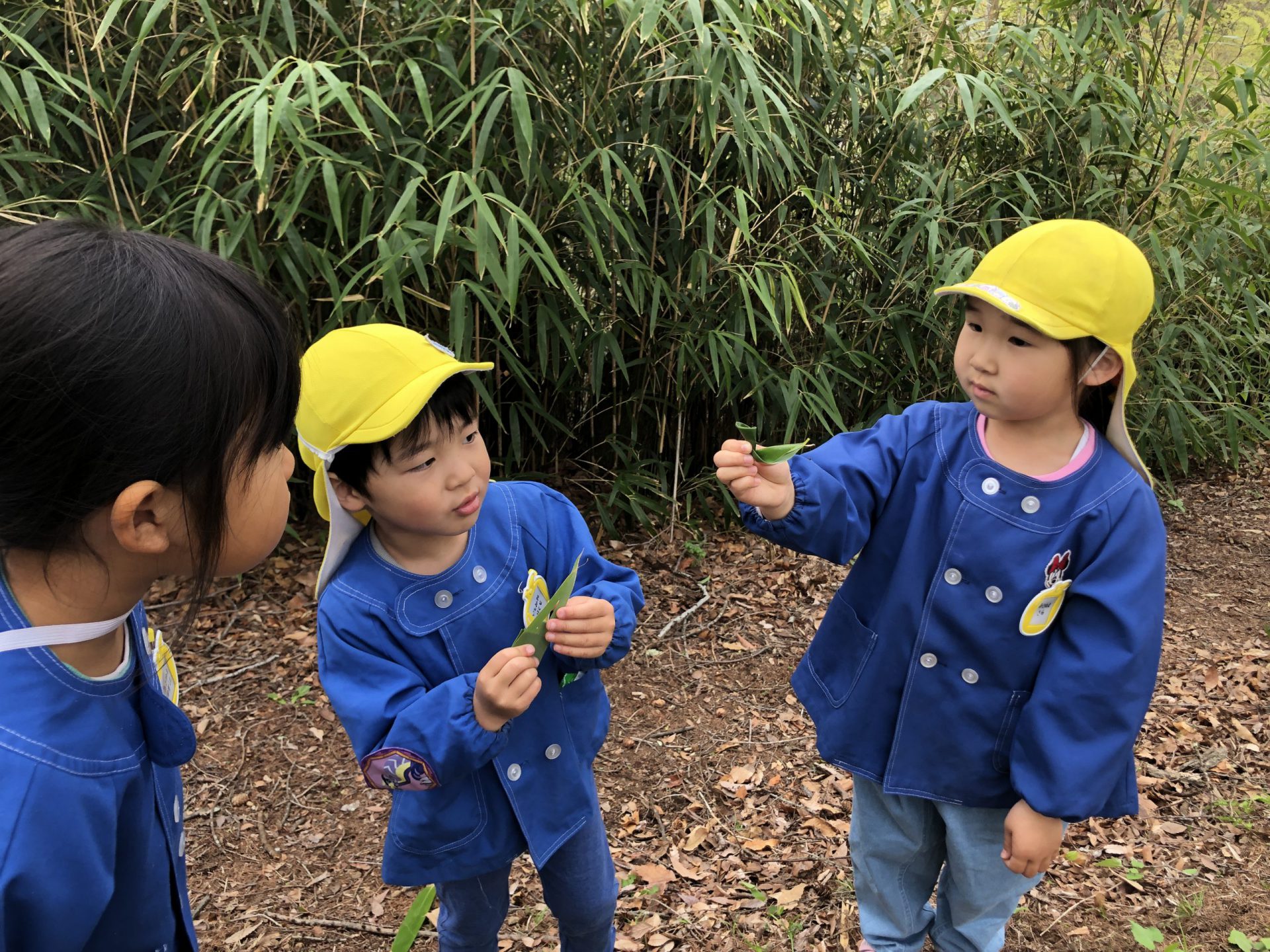 崖登りをしたり、笹の葉で何かを作ってみたり。
