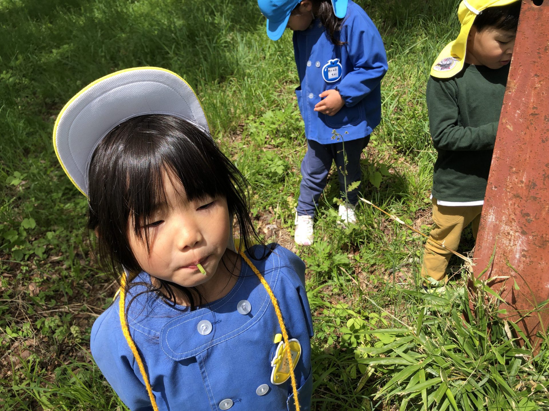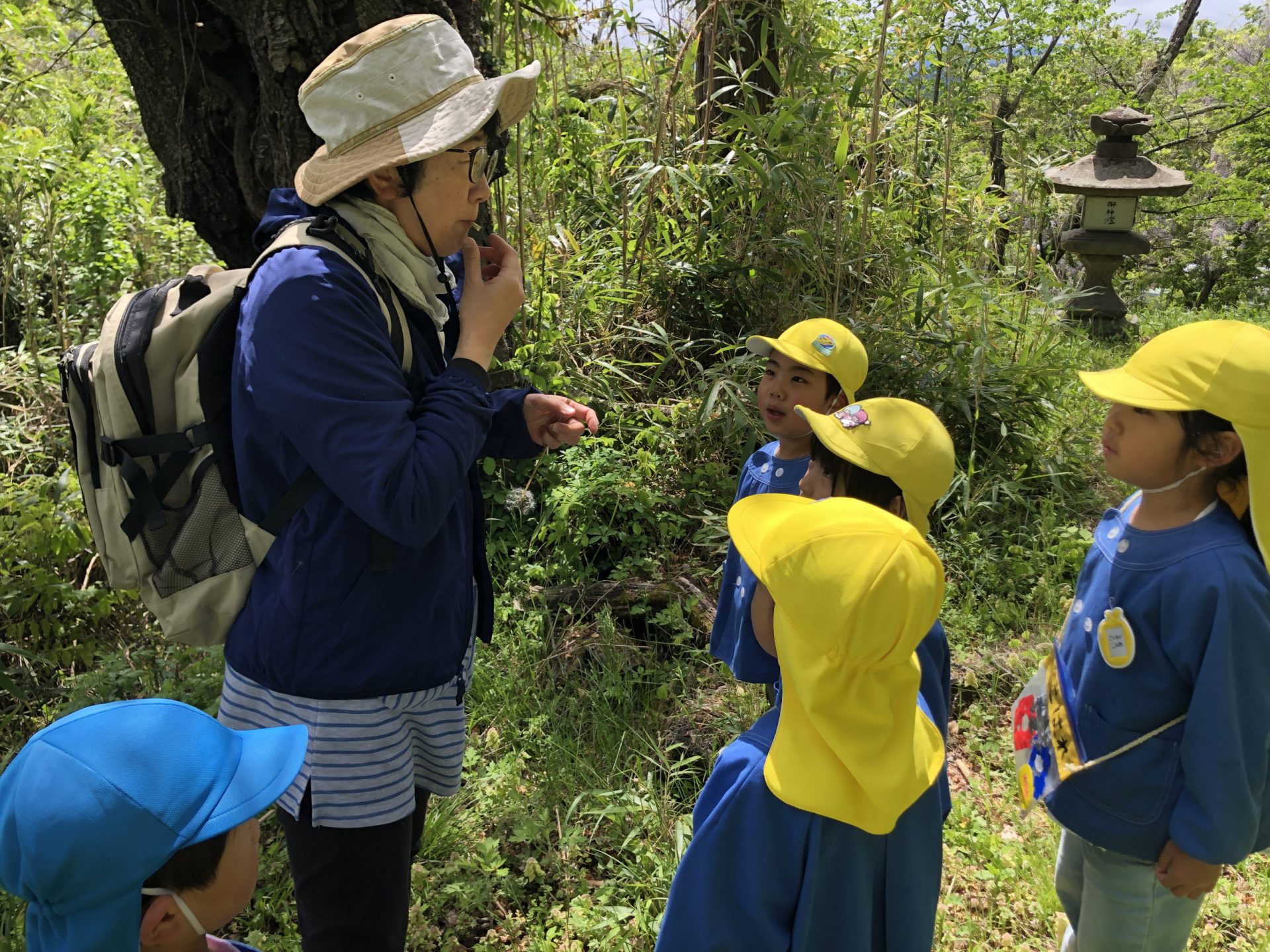 園長先生にたんぽぽの茎笛を教えてもらい、真似してやってみます。「プーっ」鳴った!!