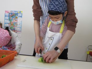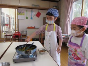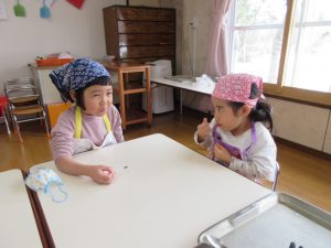 今回、大きいクラスのお友達はエプロンもつけてクッキング。
