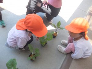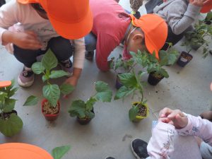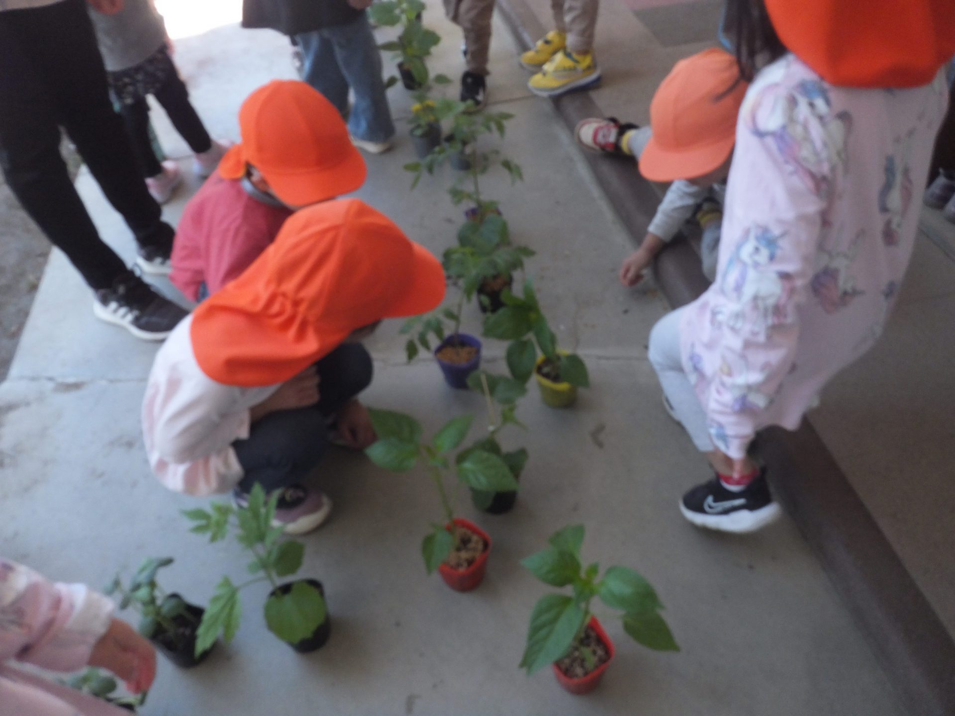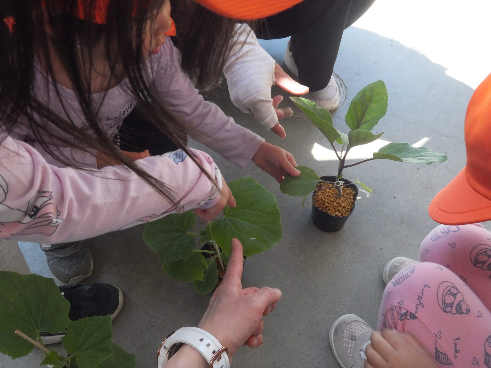 野菜の苗植えの前に、野菜の葉の形やにおいにも目を向けてもらいたいと考え、じっくりと苗を観察してみました。
