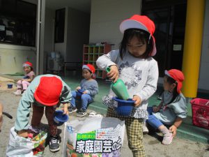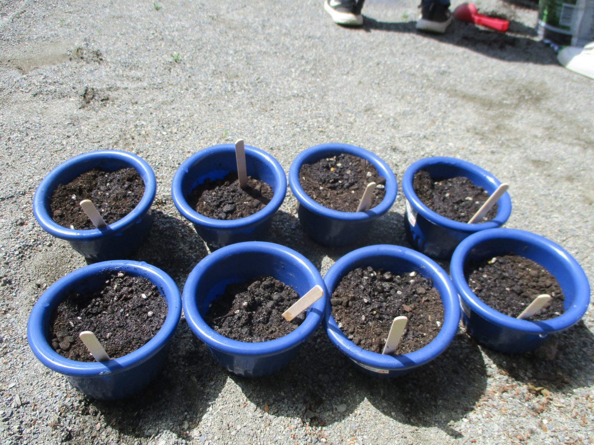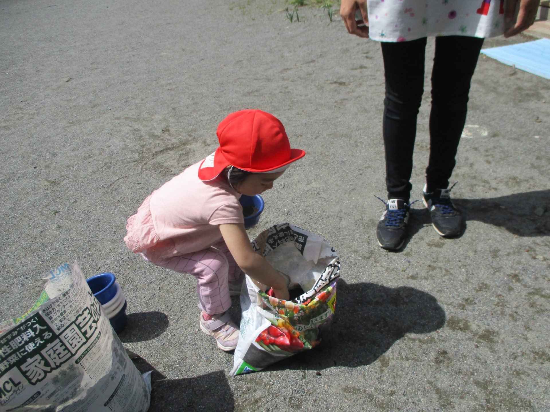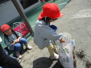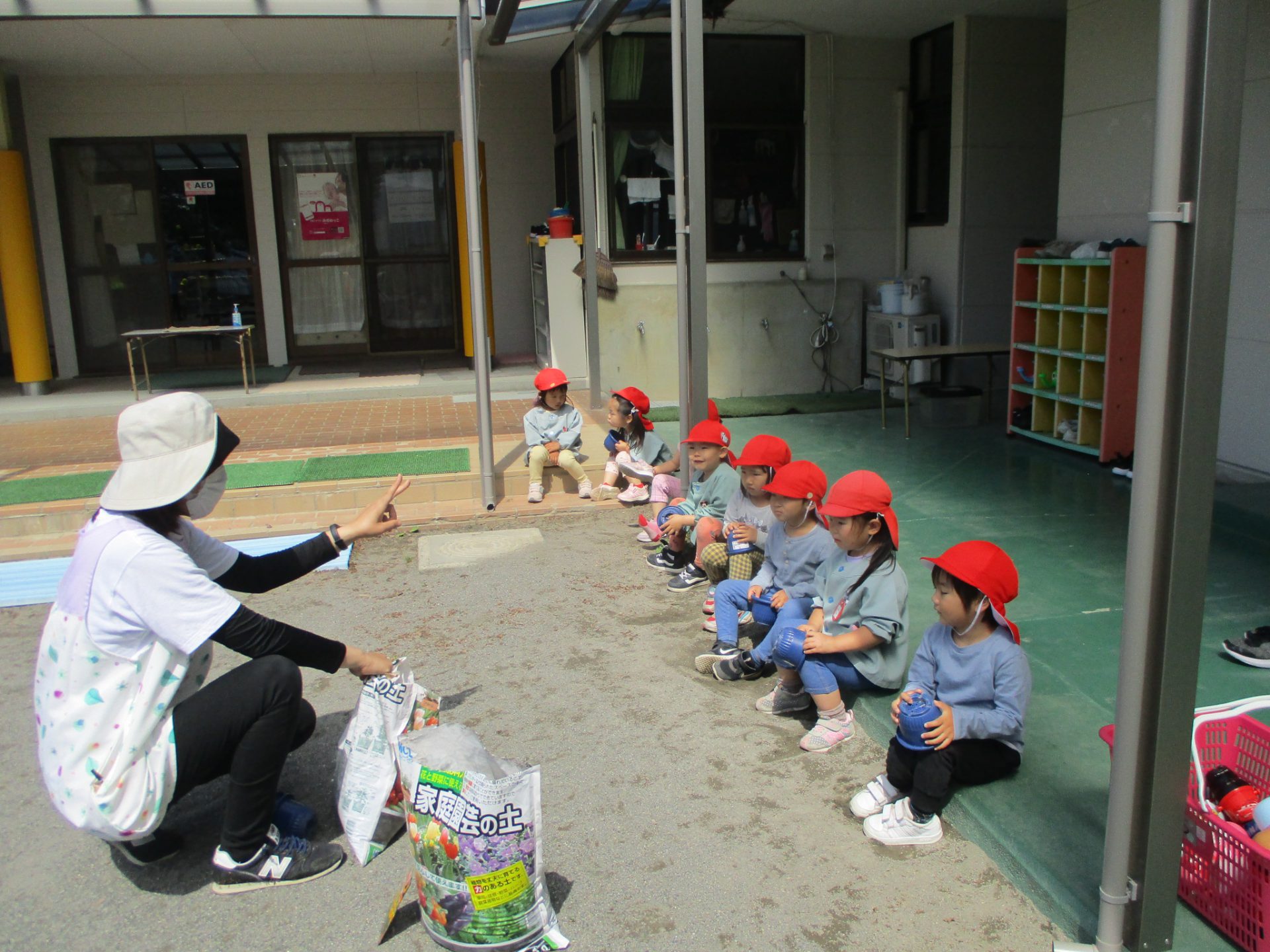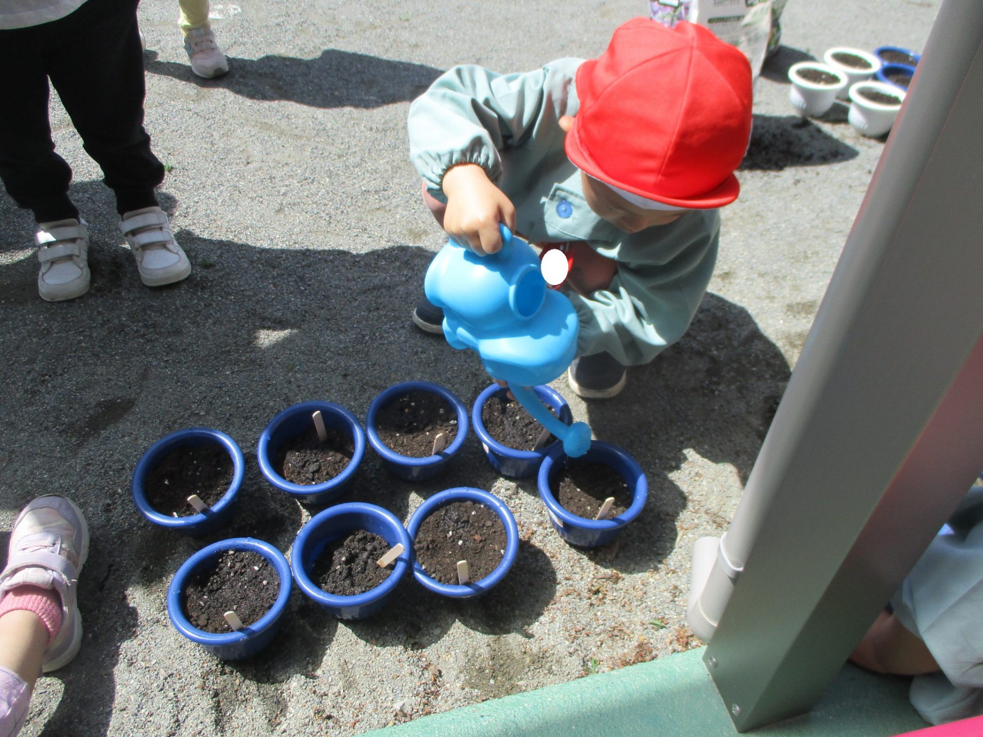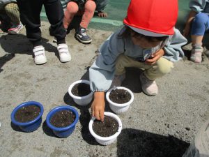 一人一人、自分の鉢に種をまきました。これから大切に育ててほしいなと思います。芽が出てきた時の、子どもたちの表情が楽しみです。