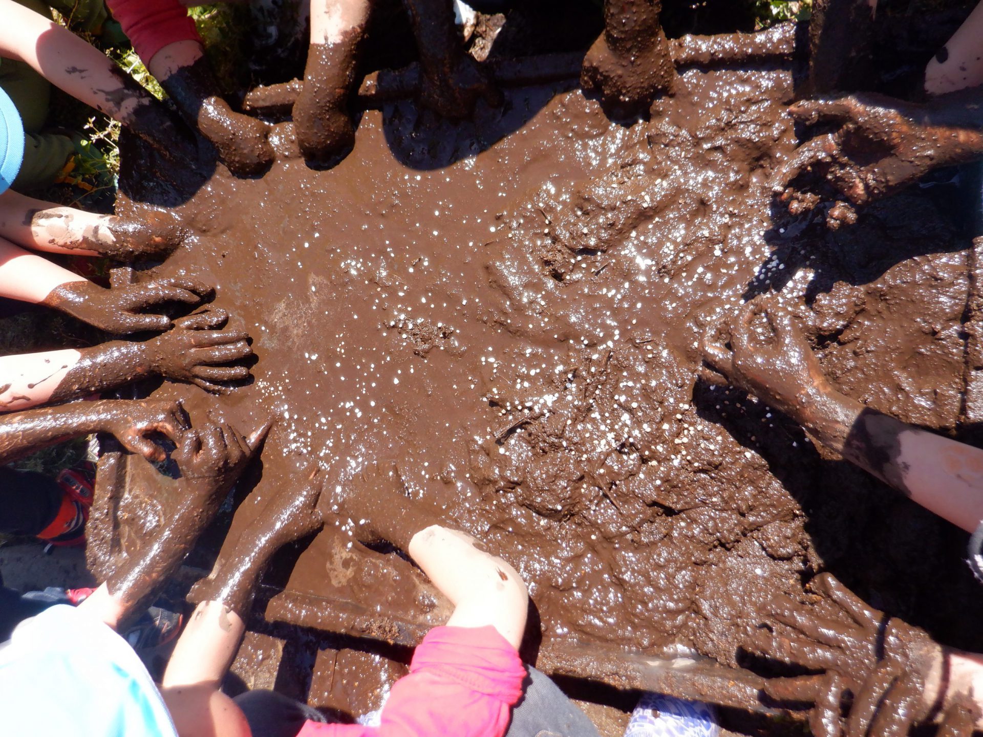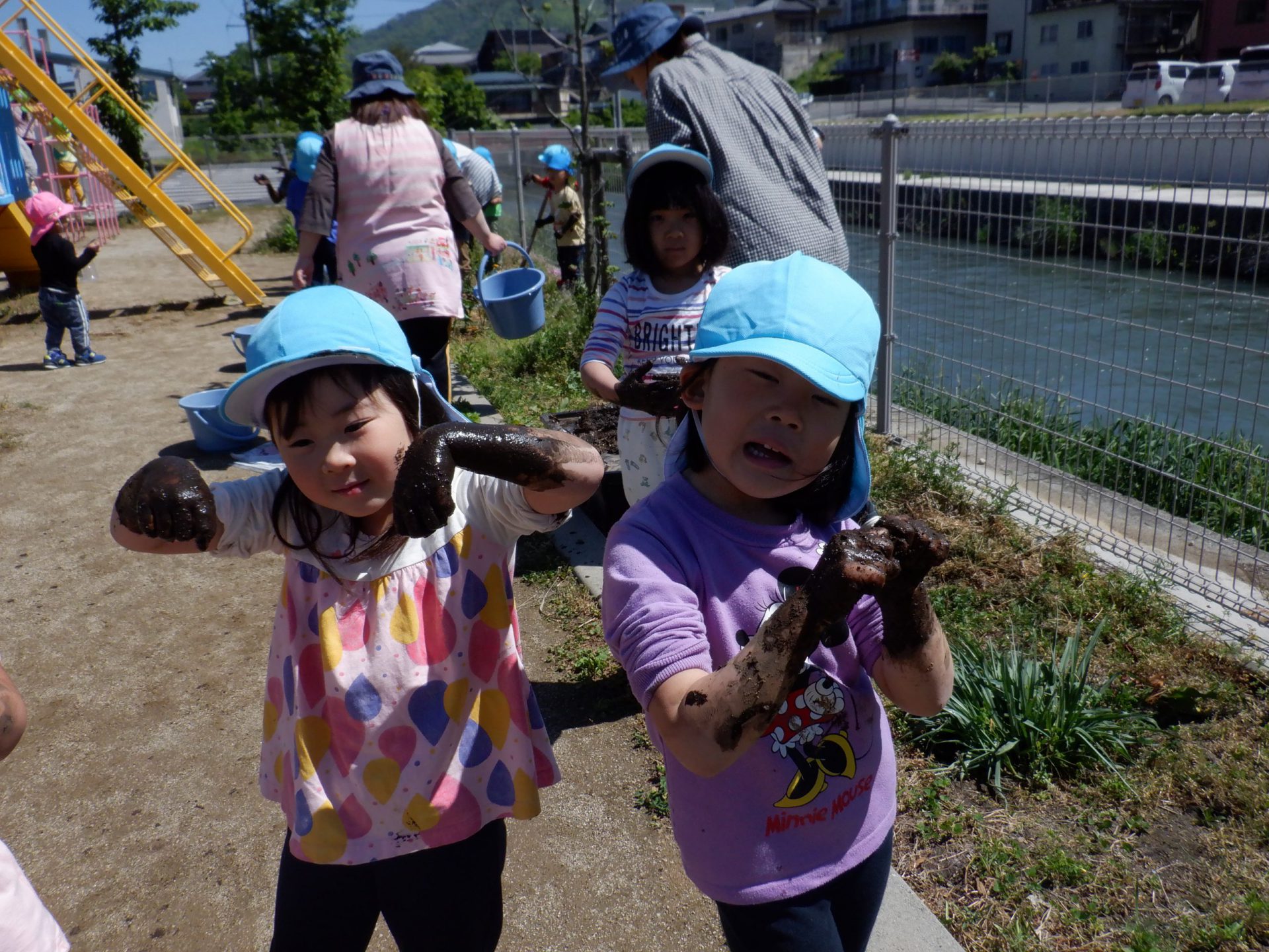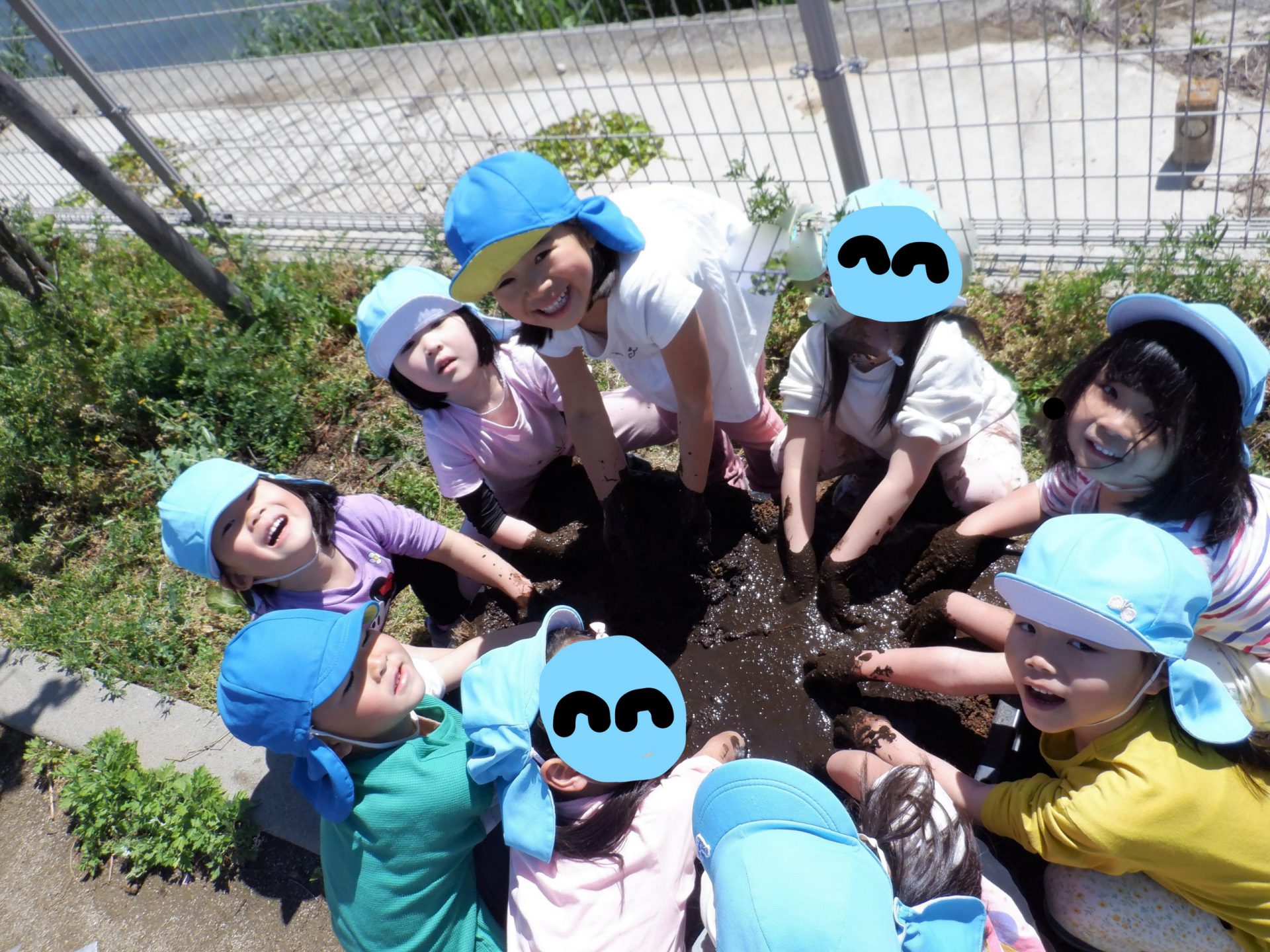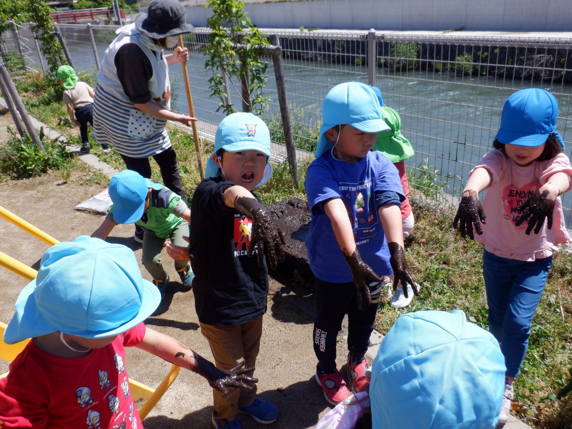 最初は泥に手を入れることに躊躇する子もいましたが、友達の「気持ちいいよ」「ここ(入って)いいよ」と誘われやってみると・・・「気持ちいい!!」