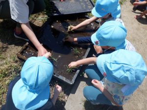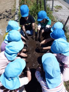 普段の遊びでは泥にしっかり両手を入れて遊ぶ経験の少ない子もいますが、今回の活動では田んぼの土作りを通して土や水、混ざり合っていく感触を楽しむことができました。