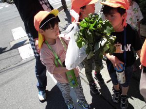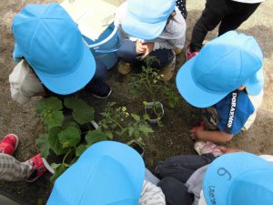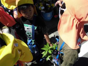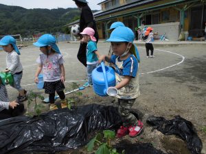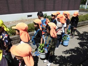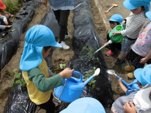 ・野菜の苗に水をあげると元気になることを知って、張り切って水やりをしました。