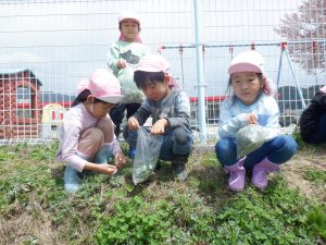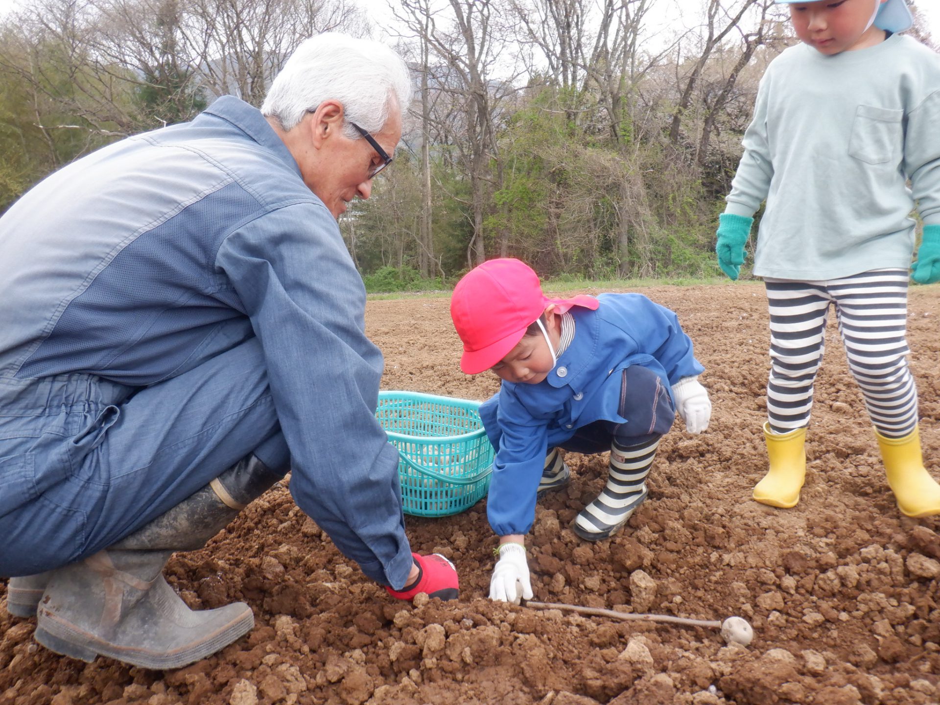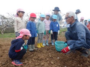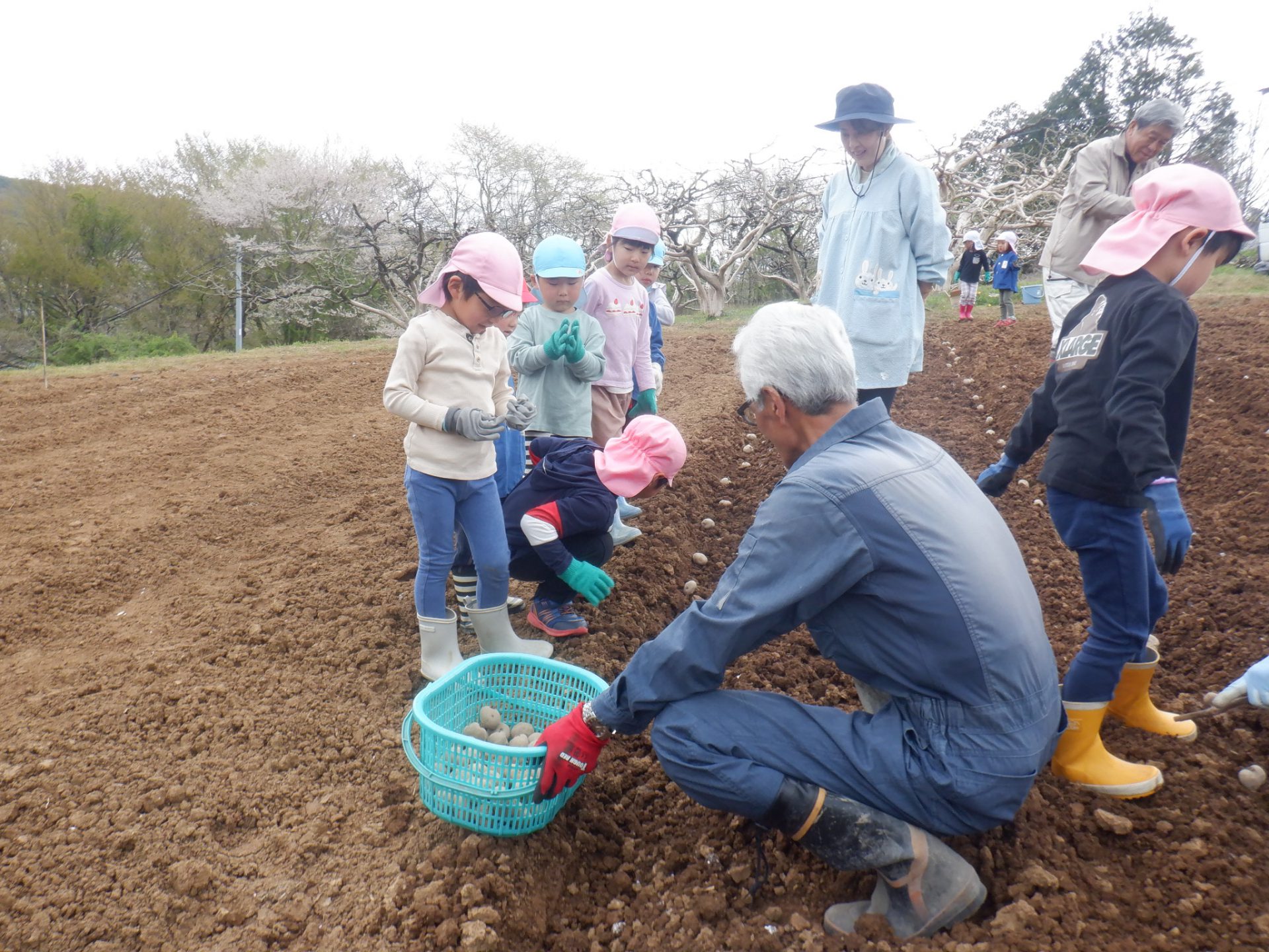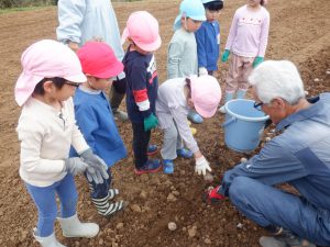 ・畑で使った30センチほどの棒を園に頂いてきて、園でもジャガイモを植えてみると、お話してくださったことをよく覚えていて植えることができ、地域の方が教えてくださることが子どもたちにしっかり伝わり、うれしい姿であった。