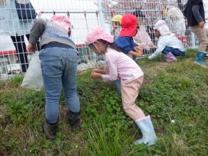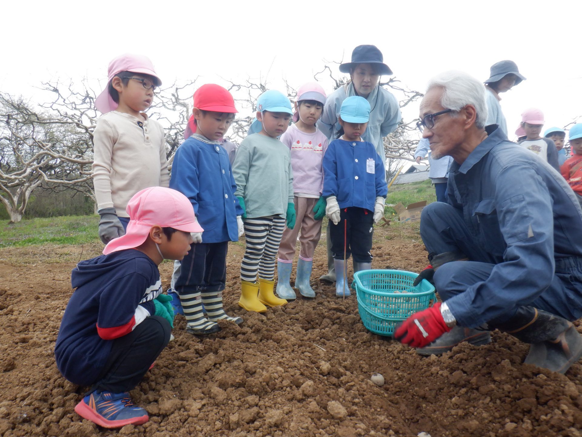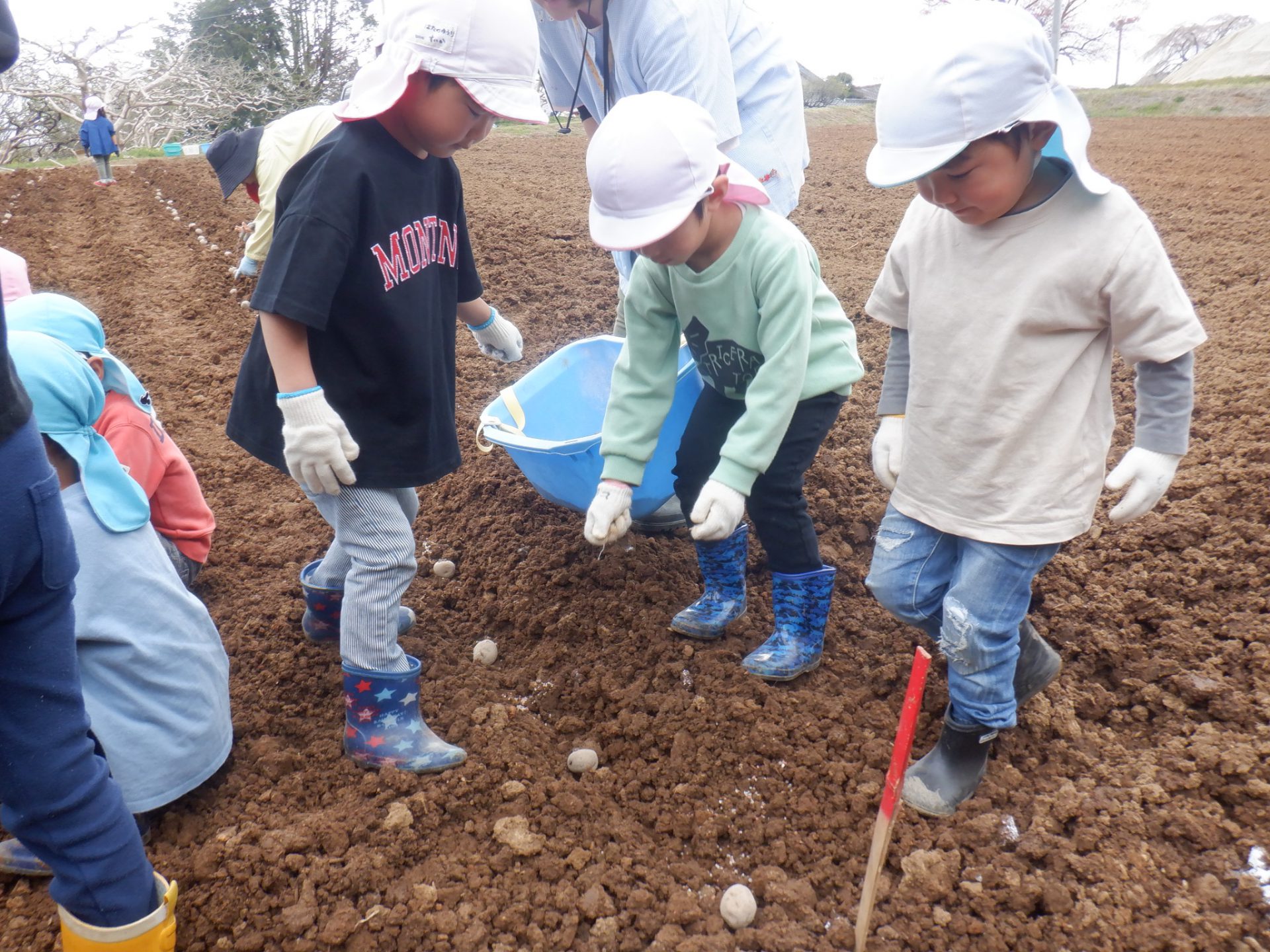 ・園の畑とはちがう広い畑で子どもたちは開放感も味わいながら、お話を聞いたり、手伝ってもらいながらおイモを植えたりすることができました。