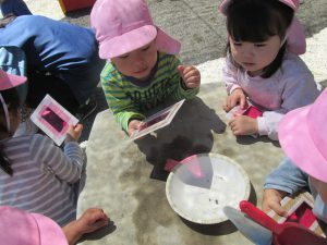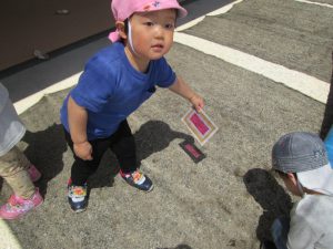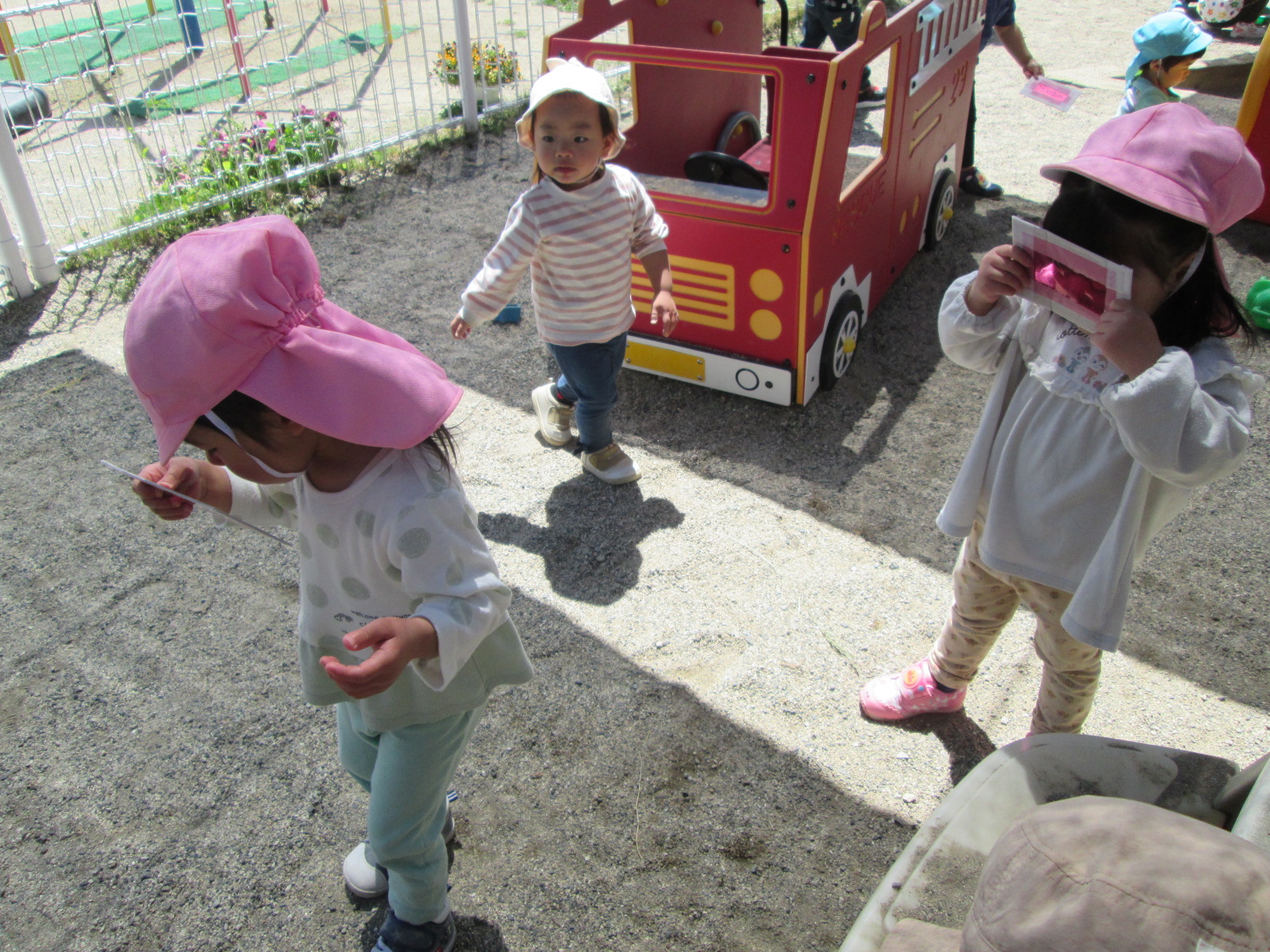 見たいものや探したいものがたくさんある子どもたちとメガネを持って外遊びに出ました。
