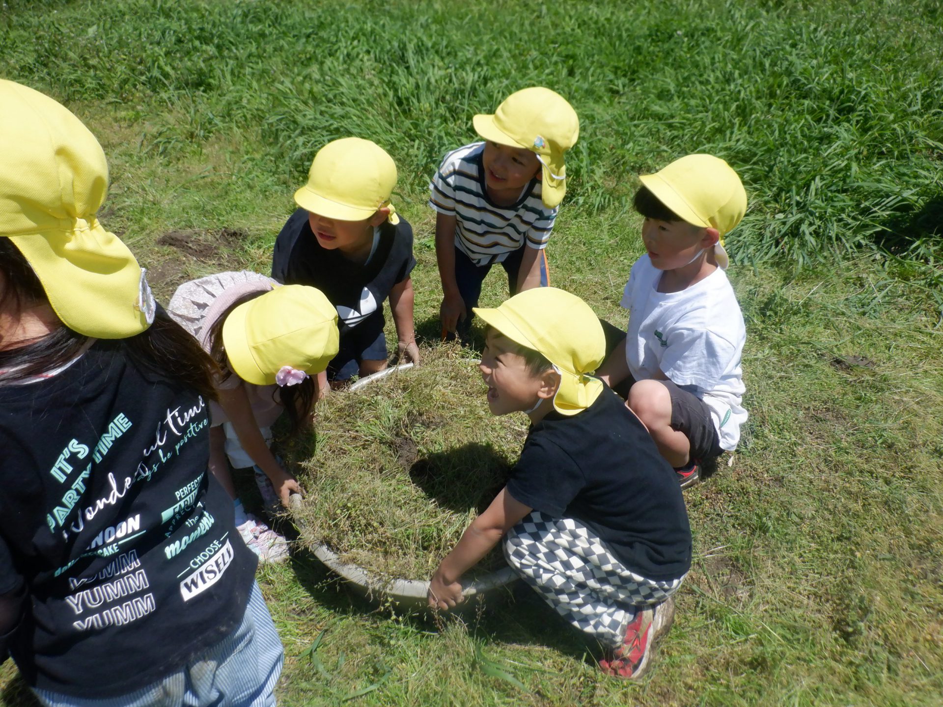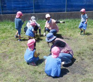 年長児などは昨年の経験もあり、畑での野菜つくりは楽しみにしているようであったが、草があったり、かたい土の畑では野菜がうまく育っていかないことも知っていて、暑い中でもしっかり草取りをしていた。自分たちが畑から作り、野菜を育ていく中で、農作業、畑作業の大変さを味わいながら、食の大切さや意欲を持っていってほしいと思う。
