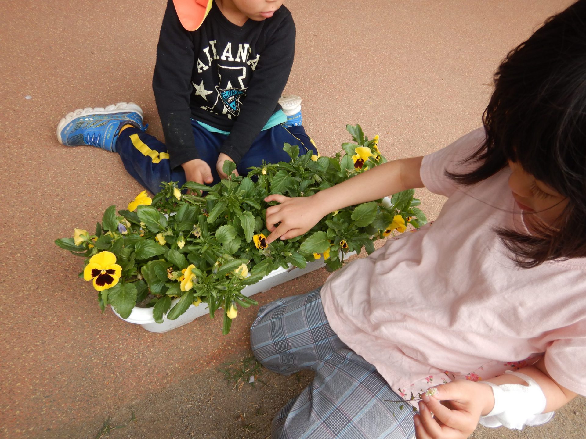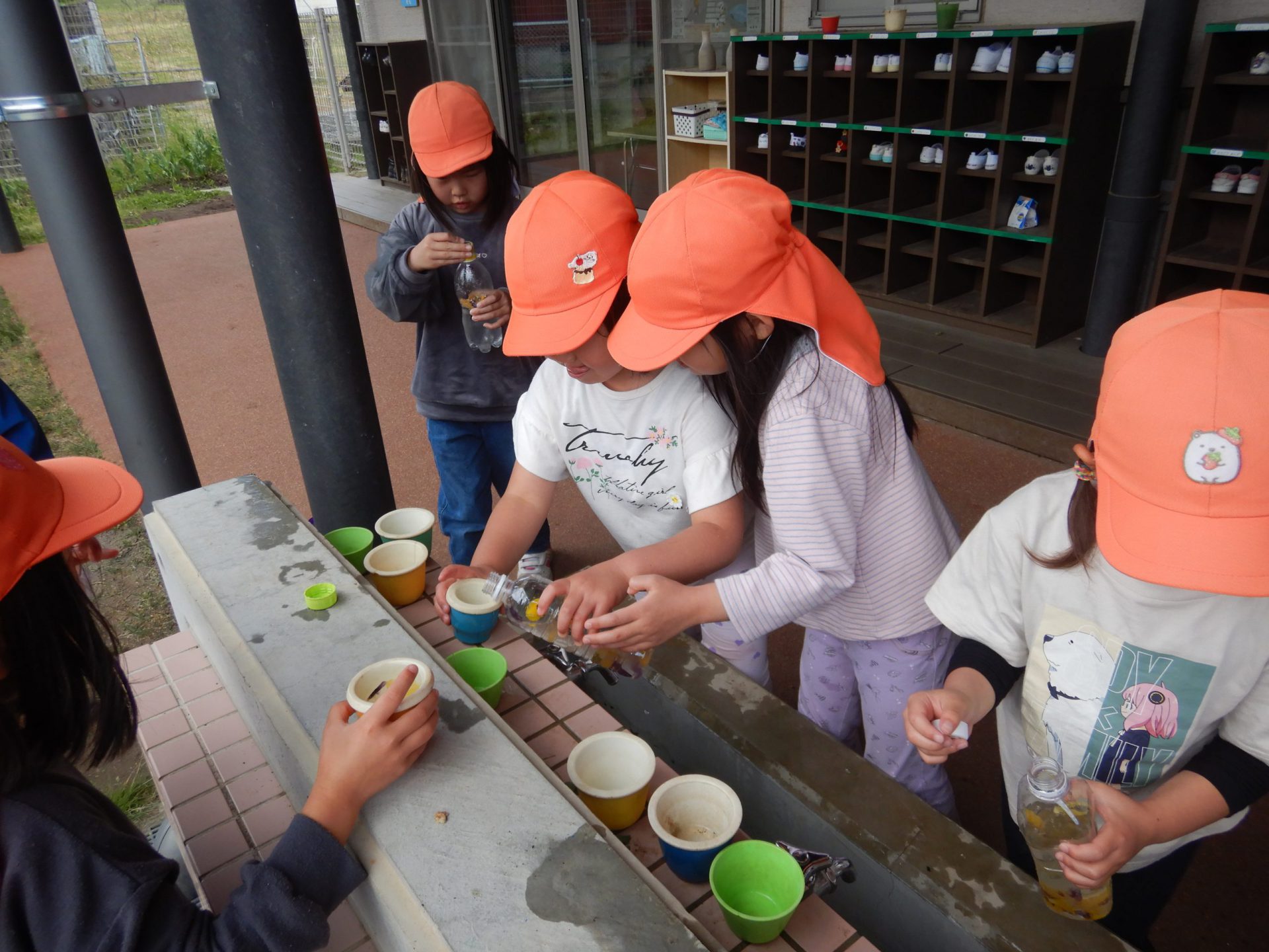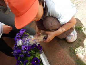 今年も、クラス前のプランターのパンジーが咲き始めると、色水遊びが始まりました。