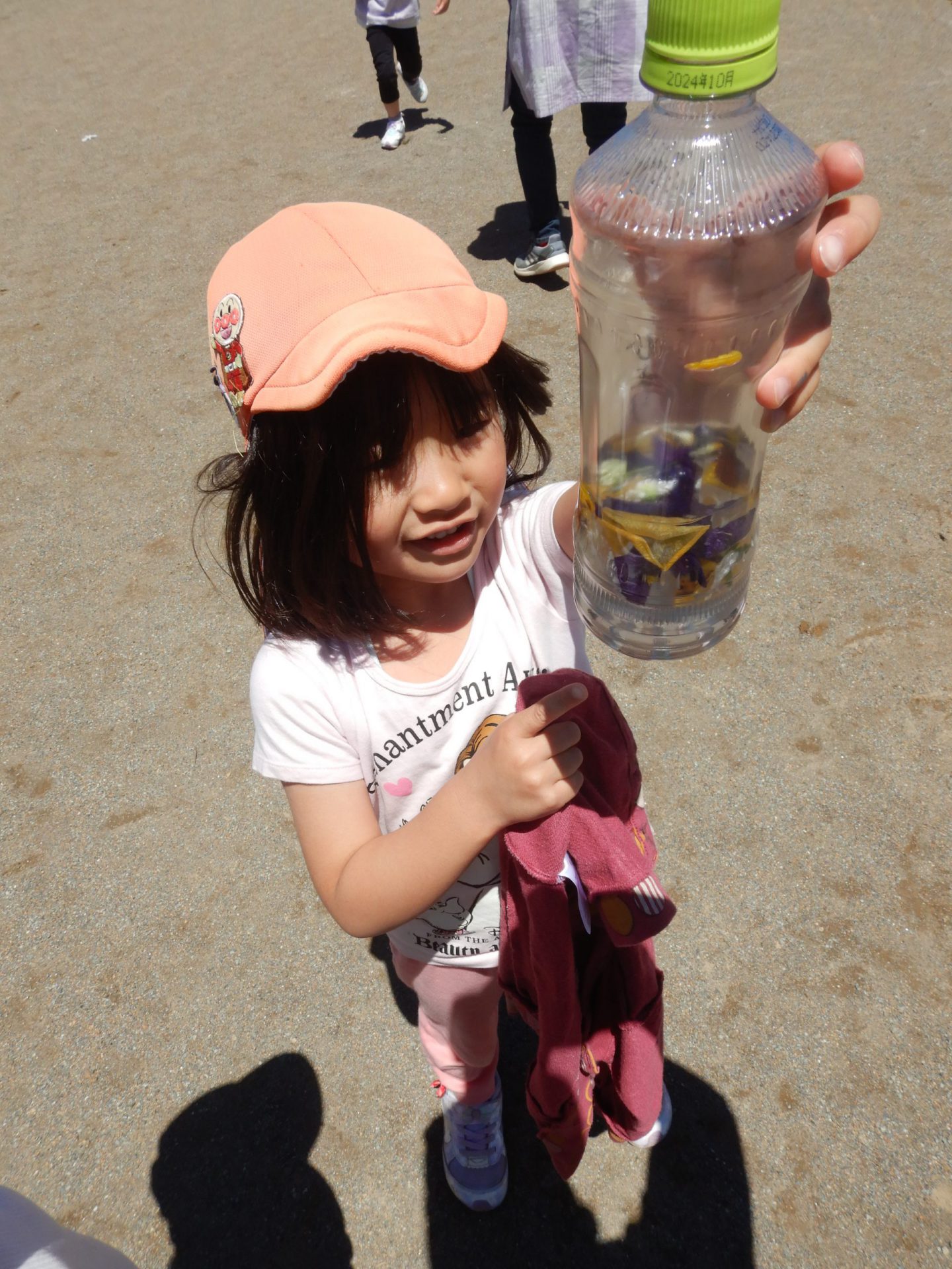 最初はビニール袋で楽しんでいましたが、「破けちゃった・・・」残念そうな子ども達。そこで各家庭からペットボトルを持ってきてもらい再挑戦!