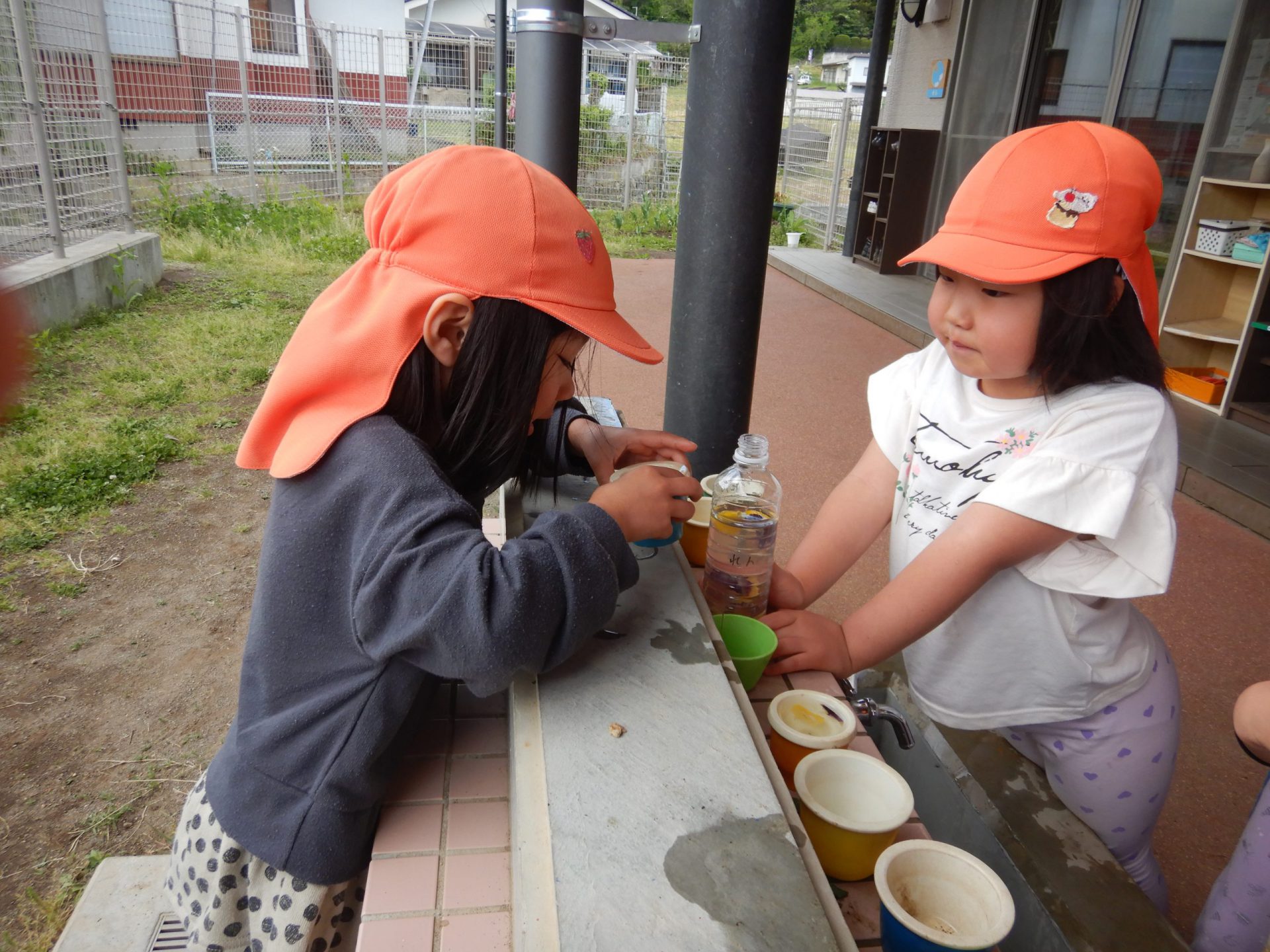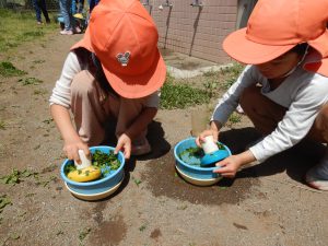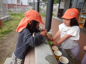 毎年恒例となっている色水遊び。今年はペットボトルを使ったことでジュース屋さんごっこにも発展していました。「黄色入れたのに、あんまり変わらない・・・」「紫入れるとさ、ブルーハワイみたいになるよね」と今までの経験から予想しながら作って遊ぶ姿に、年長さんの成長を感じました。草を使っての色水作りも盛り上がっているので、身近な草花を使った遊びをもっともっと楽しんでいってほしいと思います。