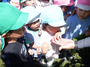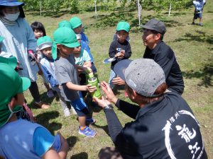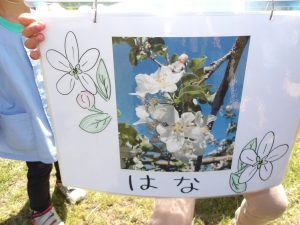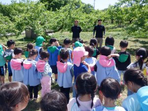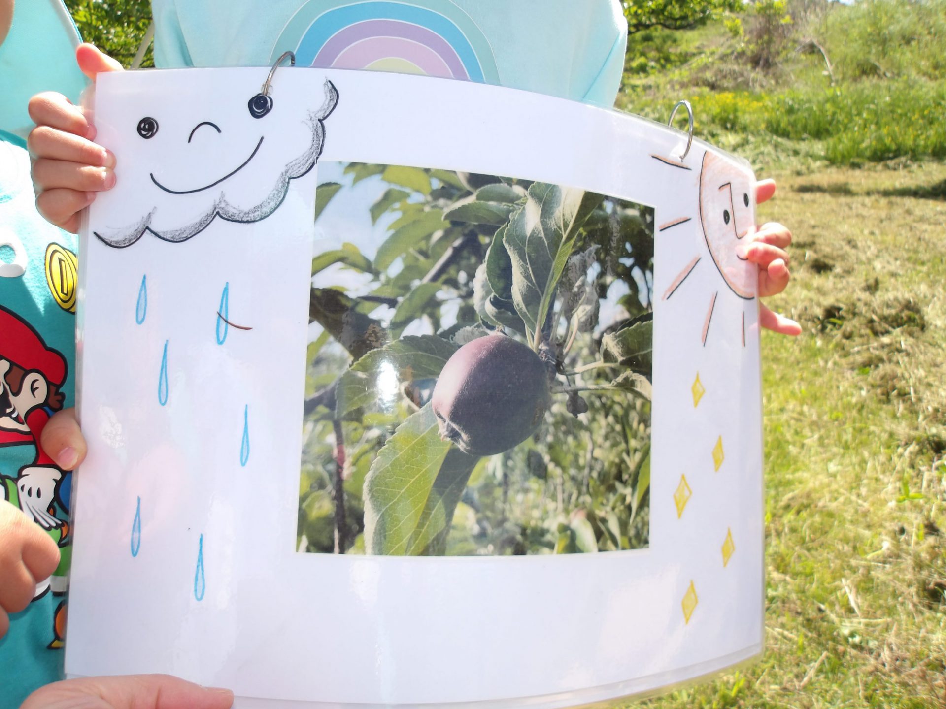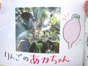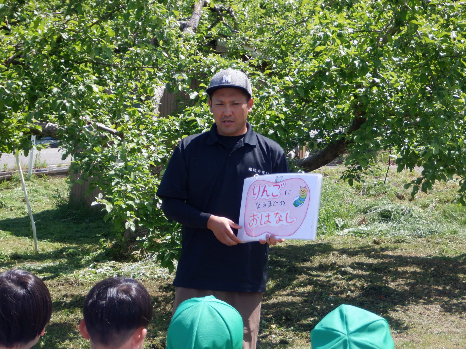 ・りんごも生き物だから大事に大事に育てないとおいしいりんごにならないんだよ。」とりんごが生長するために大事なことを紙芝居や模型を使ってお話してくださり、子どもたちもよく聞いていいた。