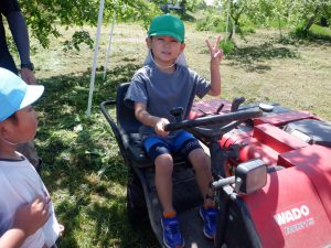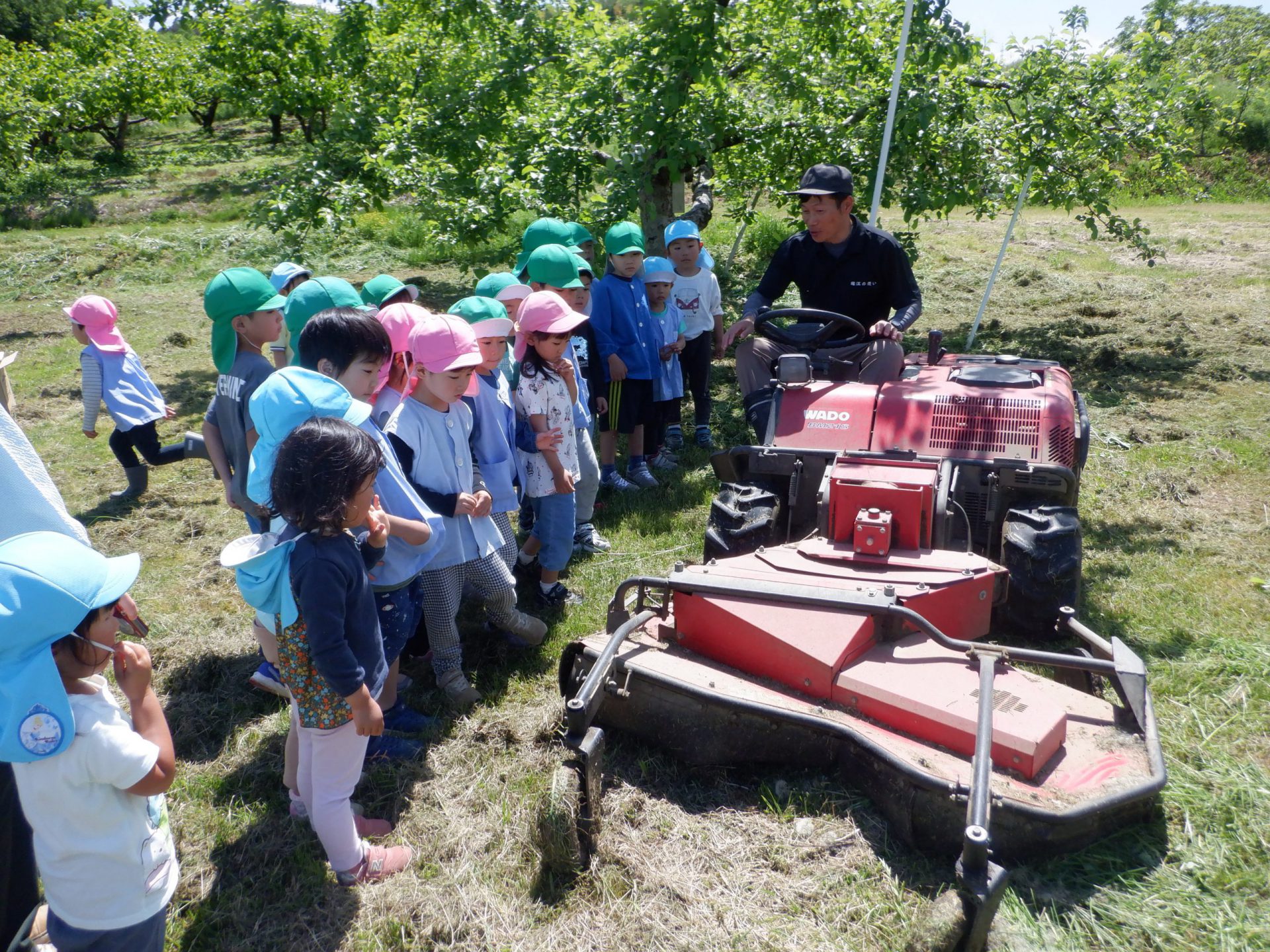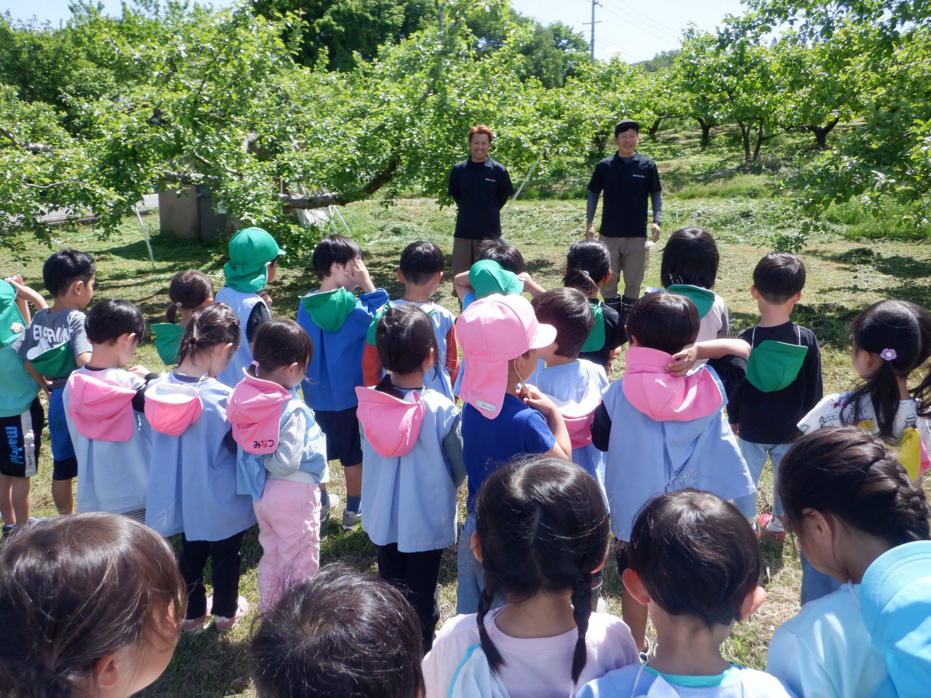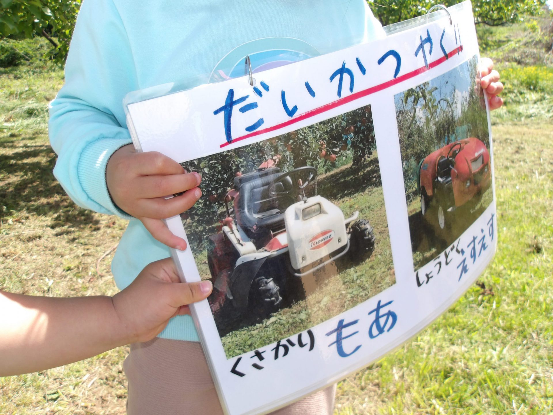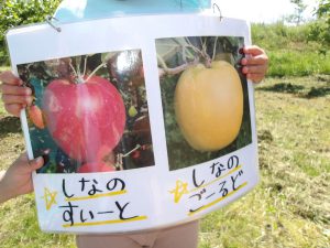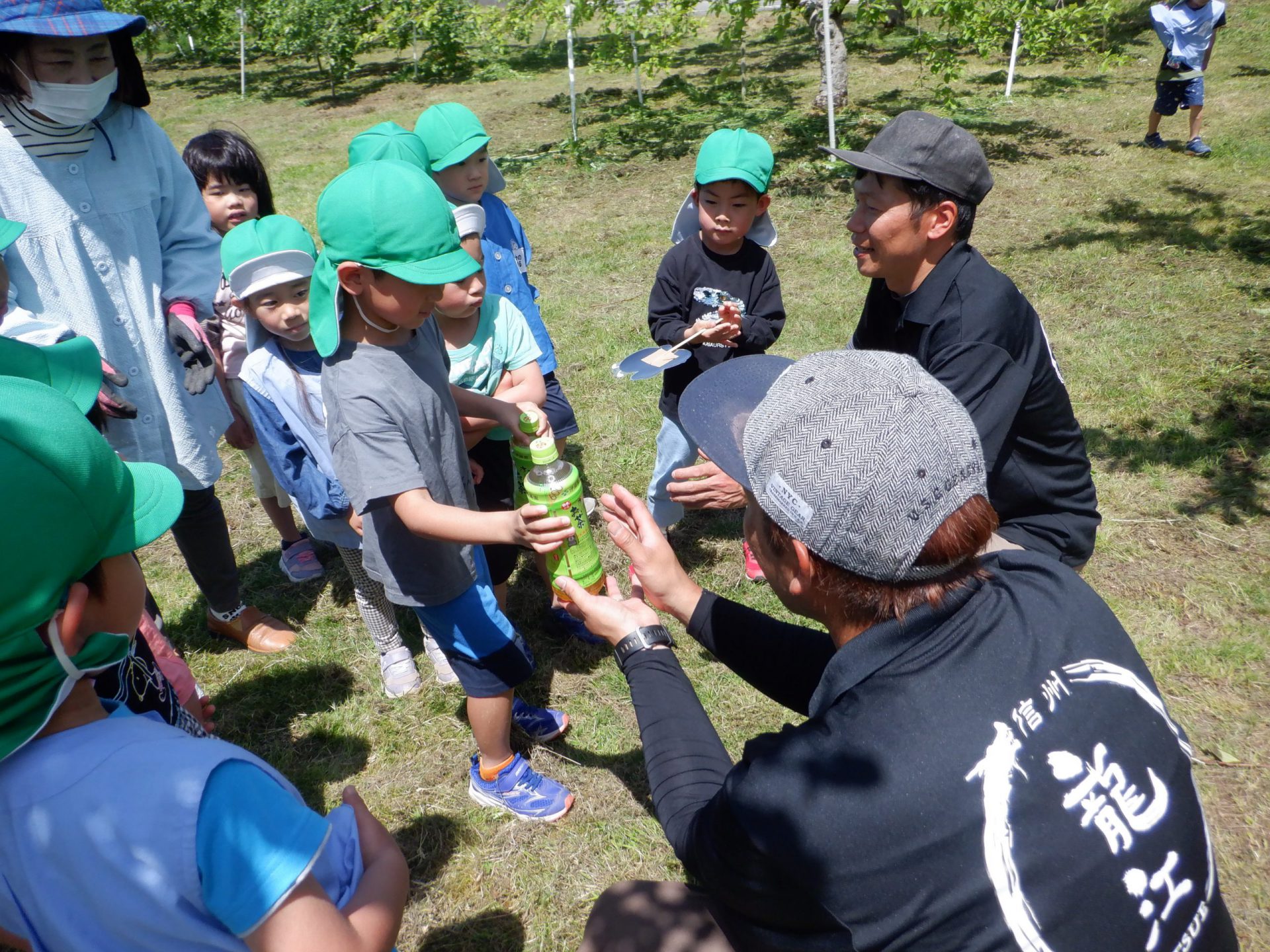 保育園の向かいにあるりんご畑に、小学校の管理する学校りんご園があります。この中の数本を保育園がお借りして、毎年りんごの様々な体験を行っています。